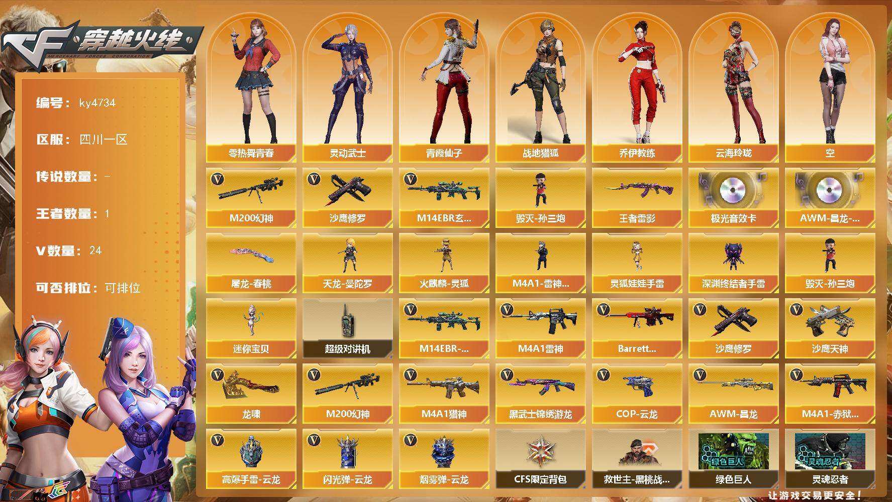 [16762130]四川一区-24V-1王者-0炫金 【热门武器】:M14EBR-玄武,M200-幻神,毁灭-孙三炮,沙鹰-修罗 【王者炫金武器】:王者雷影 【音效卡】:Barrett-极光音效卡,AWM-昌龙-怀旧音效卡 【皮肤】:屠龙-春桃 皮肤 【角色】:战地猎狐,乔伊教练,云海玲珑,空,嘉年华灵狐,零-热舞青春,灵动武士,灵狐者-X,潘多拉-X,潘多拉-甜心教官,青霞仙子,夜玫瑰-宠粉,游珑儿 【人偶武器】:毁灭-孙三炮,天龙-曼陀罗,火麒麟-灵狐,M4A1-雷神-精英刀锋,迷你宝贝,深渊终结者手雷,灵狐娃娃手雷 【暴走生化】:超级对讲机 【英雄级武器】:M4A1-雷神,M14EBR-玄武,黑武士-锦绣游龙,M4A1-猎神,Barrett-极光,M200-幻神,沙鹰-修罗,沙鹰-天神*3,COP 357-云龙,龙啸,高爆手雷-云龙,闪光弹-云龙,烟雾弹-云龙,M4A1-赤狱骑士,AWM-昌龙 【道具】:CFS限定背包,救世主-黑桃战神,黄金生化钩,绿色巨人,灵魂忍者,迷雾幽灵,夺命之镰,防化服*2,金色流光-枪王排位*2,星辰流光-枪王排位,巅峰赛先锋-金色流光,枪王排位28赛季金色流光,枪王排位29赛季金色流光,语音特效-机器人,EP战队名片,EP战队喷图,防弹头盔*3,防弹衣*3,C4工具钳*3,手雷包*3 【特殊枪械】: