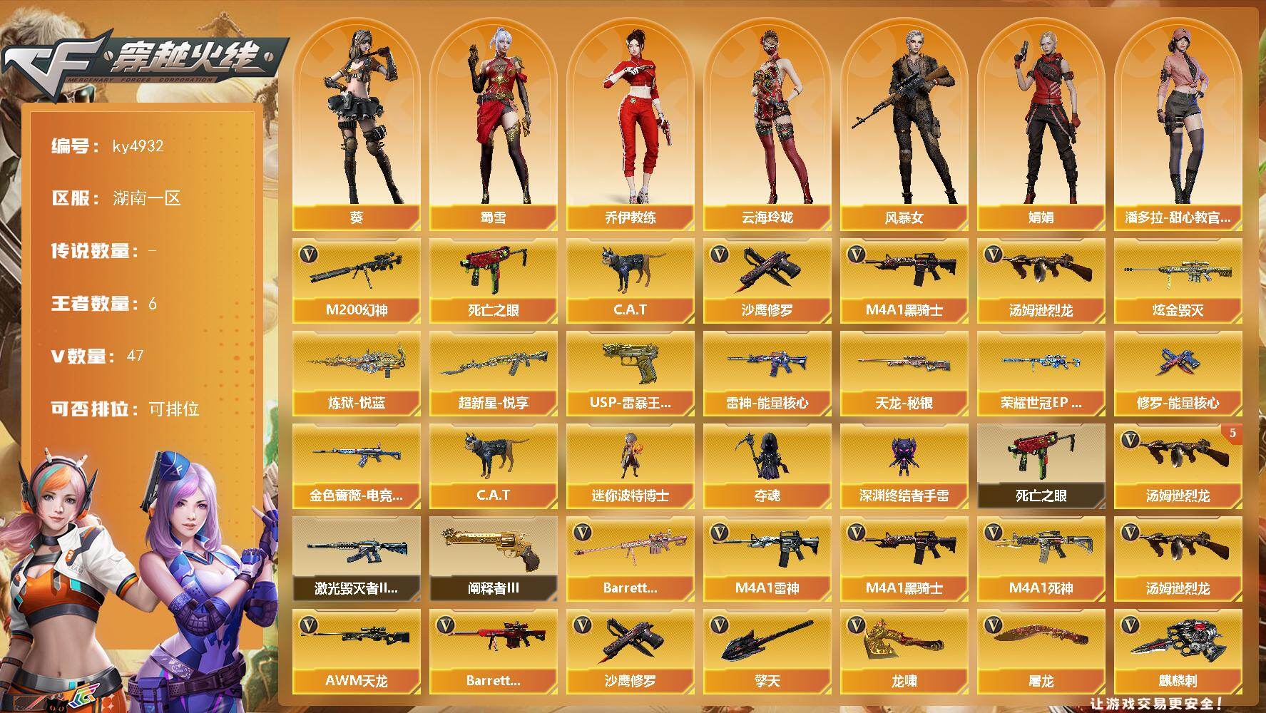 [16841612]湖南一区-47V-6王者-2炫金 【热门武器】:M200-幻神,死亡之眼*2,C.A.T,M4A1-黑骑士*3,汤姆逊-烈龙*5,沙鹰-修罗*3 【王者炫金武器】:超新星-悦享,炼狱-悦蓝,USP-雷暴王者,炫金毁灭*2 【皮肤】:幻神-荣耀世冠EP 皮肤,金色蔷薇-电竞之星 皮肤,雷神-能量核心,天龙-秘银,修罗-能量核心*2 【角色】:葵,妮妮,乔伊教练,云海玲珑,风暴女,娟娟,潘多拉-甜心教官,蜀雪 【人偶武器】:C.A.T,迷你波特博士,夺魂*2,深渊终结者手雷 【暴走生化】:死亡之眼*2 【挑战大师】:激光毁灭者III-白马银枪,阐释者III 【英雄级武器】:M4A1-千变,M4A1-雷神,M4A1-黑骑士*3,M4A1-死神*3,AK47-机械迷城,AWM-天龙,Barrett-极光*2,M200-幻神,Barrett-金色蔷薇,汤姆逊-烈龙*5,沙鹰-修罗*3,屠龙*4,龙啸,擎天,麒麟刺,擎天-云海游龙,高爆手雷-神工天巧*3,手雷-云海游龙,烟雾弹-神工天巧*2,烟雾弹-荣耀世冠EP 【道具】:CFS限定背包,EP战队炫彩背包,战舰背包,女皇终结者-魔龙之吻,绿色巨人,灵魂忍者,迷雾幽灵,夺命之镰,防化服*2,金色流光-枪王排位,星辰流光-枪王排位,枪王排位28赛季金色流光,EP战队收纳包,EP战队击杀图标,防弹头盔*2,防弹衣*2,C4工具钳*2,手雷包*2 【特殊枪械】:3黑骑士,5烈龙