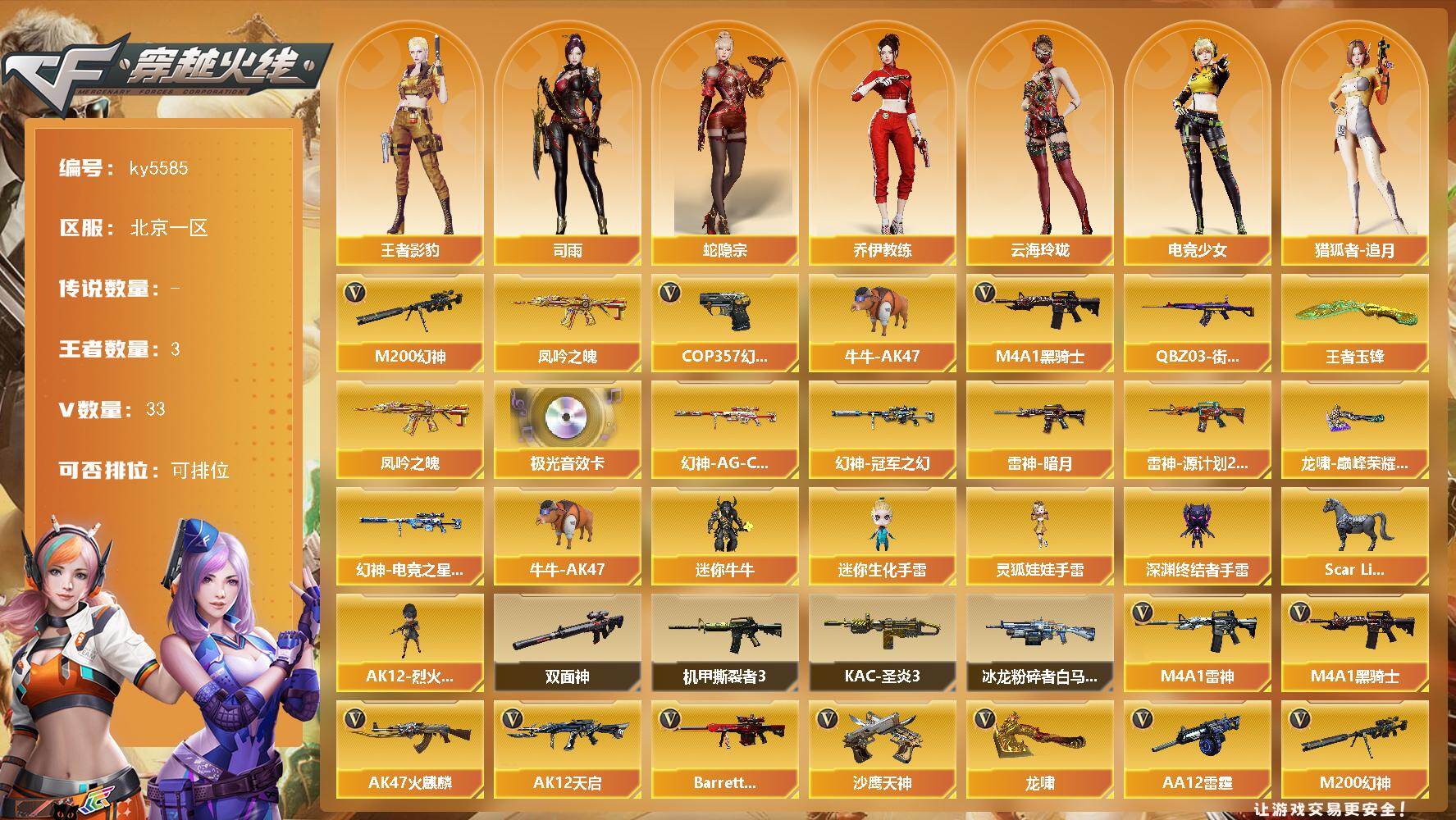 [16911910]北京一区-36V-3王者武器数-0炫金武器数 【热门武器】:M200-幻神,凤吟之魄,QBZ03-街机,牛牛-AK47,M4A1-黑骑士,COP 357-幻灵 【王者炫金武器】:凤吟之魄,王者玉锋 【音效卡】:Barrett-极光音效卡 【皮肤】:幻神-冠军之幻,幻神-AG-CFPL S24冠军 皮肤,幻神-电竞之星 皮肤,雷神-暗月,雷神-源计划2.0专属 皮肤,龙啸-巅峰荣耀 皮肤 【角色】:司雨,王者影豹,蛇隐宗,乔伊教练,云海玲珑,电竞少女,猎狐者-追月,灵狐者-X,灵狐者-七夕宝贝,流浪蔷薇,龙儿-小淘气,曼陀罗-X,潘多拉-甜心教官,蛇姬,兔囡囡,新娜塔莎,影武者-X 【人偶武器】:Scar Light-马枪,牛牛-AK47,迷你牛牛,迷你生化手雷,深渊终结者手雷,AK12-烈火-灵狐者,灵狐娃娃手雷 【暴走生化】:双面神 【挑战大师】:冰龙粉碎者-白马银枪*2,机甲撕裂者III,KAC-圣炎切割者III 【英雄级武器】:AK47-火麒麟,M4A1-雷神,M4A1-黑骑士,AK12-天启,AK47-黑鲨,黑武士-锦绣游龙,王者风势-觉醒版,Barrett-极光,M200-幻神,烈龙-云海游龙,AA-12-雷霆,沙鹰-天神,COP 357-幻灵,龙啸*2,幻灵之锋,擎天-云海游龙,高爆手雷-幻灵,高爆手雷-竞技荣光*2,手雷-云海游龙,高爆手雷-古蛇迷踪,闪光弹-幻灵*2,闪光弹-竞技荣光,烟雾弹-幻灵*2,烟雾弹-竞技荣光,烟雾弹-古蛇迷踪 【道具】:云海游龙炫彩背包,冰冰企鹅背包,古蛇迷踪炫彩背包,背包-洛丽塔,绿色巨人,灵魂忍者,迷雾幽灵,夺命之镰*2,防化服*2,金色流光-枪王排位,星辰流光-枪王排位,枪王排位28赛季金色流光,枪王排位29赛季金色流光,古蛇迷踪打击特效,蛇隐宗表情,云海游龙表情,C4-黑曜,防弹头盔*2,防弹衣*2,C4工具钳*2,手雷包*2 【特殊枪械】:1黑骑士