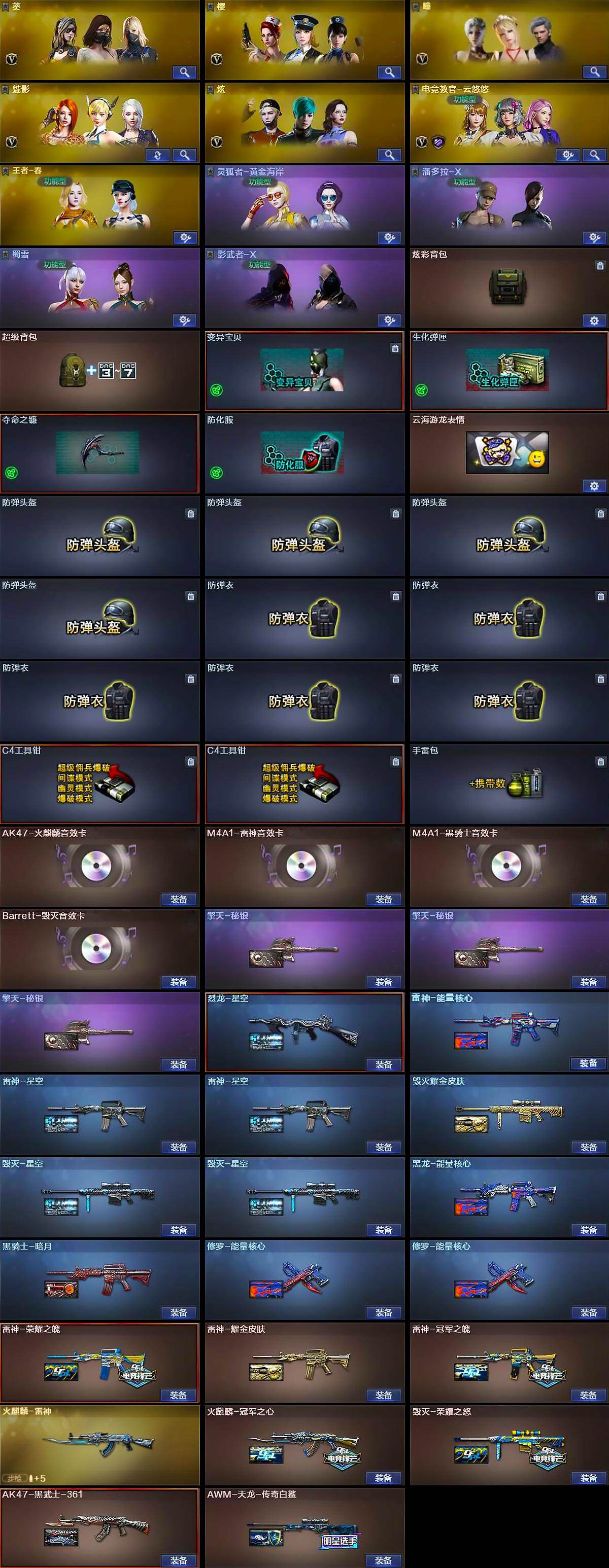 - [16205706]四川一区-48V-8王者-2炫金 【传说武器】:传说圣灵 【传说角色】:传说女帝 【热门武器】:传说圣灵,G36C-幻影,QBZ03-金色蔷薇,M4A1-青龙,修罗-古蛇迷踪,八面凌龙,死亡之眼,QBZ03-街机,RPK-盘龙,加特林-炼狱,羊驼玩偶,金刚伞 【王者炫金武器】:王者风神,炫金骑士,炫金雷神 【音效卡】:Barrett-毁灭音效卡,炼狱-百战金芒-庆典舞曲音效卡,AWM-昌龙-怀旧音效卡 【皮肤】:M4A1-再燃火线,雷神-神秘按键 皮肤,黑骑士-地狱火,无影-暗月,黑武士-典韦皮肤,修罗-能量核心,修罗耀金皮肤,屠龙-春桃 皮肤,轻型军用手斧-再燃火线,龙啸-青青莓果 皮肤 【角色】:战地猎狐,蛇隐宗,初恋灵狐,疾风,葵-赛博朋克,灵狐者-X,龙儿,麻雀,蛇姬,蜀雪,兔囡囡 【人偶武器】:巴雷特-零-水下丽影,黄金迷你深渊冰龙,迷你裂空之翼,迷你火种,迷你生化手雷,生化手雷-机甲核心,灵狐娃娃手雷 【暴走生化】:死亡之眼,超级对讲机 【挑战大师】:激光毁灭者III-白马银枪,VEPR-12-金魔,试炼破坏者III,阐释者III 【英雄级武器】:M4A1-黑龙*2,AK47-无影,M4A1-青龙,M4A1-夜魔,G36C-幻影,黑武士-锦绣游龙,八面凌龙,QBZ03-金色蔷薇,王者冰魄-觉醒版,王者火魄-觉醒版,AWM-天龙,AWM-裁决,RPK-盘龙,加特林-炼狱,炼狱-百战金芒,AA-12-雷霆,COP 357-雷霆王者-觉醒版,破空枪刃-夜魔,修罗-古蛇迷踪,龙啸,马来剑-夜魔,擎天,麒麟刺-百战金芒,高爆手雷-夜魔*4,高爆手雷-古蛇迷踪,闪光弹-雷霆,闪光弹-夜魔*4,闪光弹-雷霆王者-觉醒版*2,烟雾弹-夜魔*4,烟雾弹-古蛇迷踪,烟雾弹-雷霆王者-觉醒版,M4A1-赤狱骑士,M4A1-苍鸣雷神,AWM-昌龙,Barrett-碧霄极光 【道具】:云山科技背包,亚洲杯纪念炫彩背包,古蛇迷踪炫彩背包,百战金芒炫彩背包,超级背包,女皇终结者-魔龙之吻,救世主-黑桃战神,绿色巨人,灵魂忍者,迷雾幽灵,夺命之镰,防化服*3,流光-鎏金之域,流光-再燃火线,枪王排位29赛季金色流光,语音特效-盛典烟火,古蛇迷踪打击特效,蛇隐宗表情,萌萌小葵表情,防弹头盔*3,防弹衣*3,C4工具钳*3,手雷包*4 【特殊枪械】:1盘龙,1炼狱