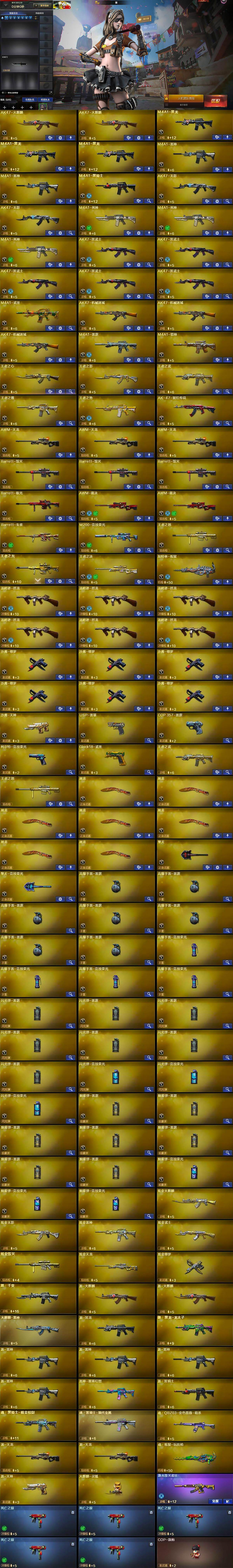【英雄级武器】:AK47-火麒麟*2,M4A1-黑龙*3,M4A1-雷神*2,M4A1-黑骑士,AK47-无影*2,M4A1-死神*3,AK47-黑武士*5,M4A1-武圣,AK47-机械迷城*3,M4A1-雷霆,M4A1-猎神,王者之心-觉醒版,王者之影-觉醒版,王者之武-觉醒版,王者之魄-觉醒版,王者之势-觉醒版,AK-47-猩红传说,AWM-天龙*3,Barrett-毁灭*3,Barrett-极光,AWM-裁决*2,Barrett-朱雀,M200-竞技荣光,王者之怒-觉醒版,王者之光-觉醒版,王者之决-觉醒版,加特林-炼狱,汤姆逊-烈龙*6,沙鹰-修罗*6,沙鹰-天神,USP-雷暴,COP-雷霆,柯尔特-竞技荣光,Glock18-武圣,屠龙*7,擎天,擎天-竞技荣光,高爆手雷-雷霆*7,高爆手雷-竞技荣光*4,闪光弹-雷霆*7,闪光弹-竞技荣光*3,烟雾弹-雷霆*7,烟雾弹-竞技荣光*3