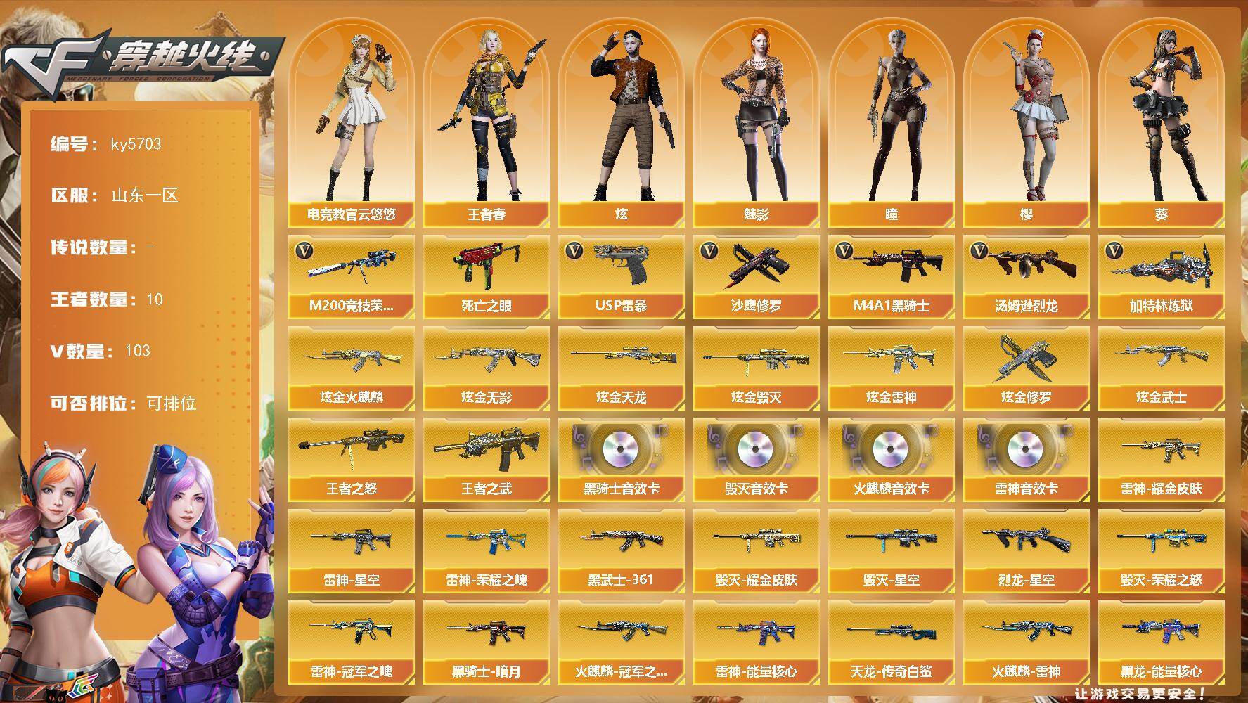 - [13080374]南方大区-43V-1王者-0炫金 【传说角色】:传说星骇 【热门武器】:QBZ03-金色蔷薇,M4A1-青龙,M200-幻神,沙鹰-修罗*2 【音效卡】:QBZ03-天罚音效卡 【稀有皮肤】:Scar Light-白虎-暗星*2,火麒麟-百城 【角色】:灵狐者-职业经理,魅影,蜀雪,铁骑荣耀 【人偶武器】:白虎-迷你小艾,异变清道夫-蛇影双骄,迷你裂空之翼,迷你牛牛*2,生化手雷-机甲核心 【暴走生化】:超级对讲机 【挑战大师】:神圣爆裂者III,KAC-圣炎切割者III,阐释者III,试炼破坏者III,激光毁灭者III*2,激光毁灭者III-白马银枪,冰龙粉碎者-白马银枪*2 【英雄级武器】:M4A1-黑龙,M4A1-雷神,AK47-黑鲨,M4A1-青龙,QBZ03-天罚,M4A1-幻灵,黑武士-锦绣游龙,QBZ03-金色蔷薇,M4A1-猎神,AWM-裁决,M200-幻神,沙鹰-修罗*2,沙鹰-天神,幻灵之锋*2 【特殊枪械】: