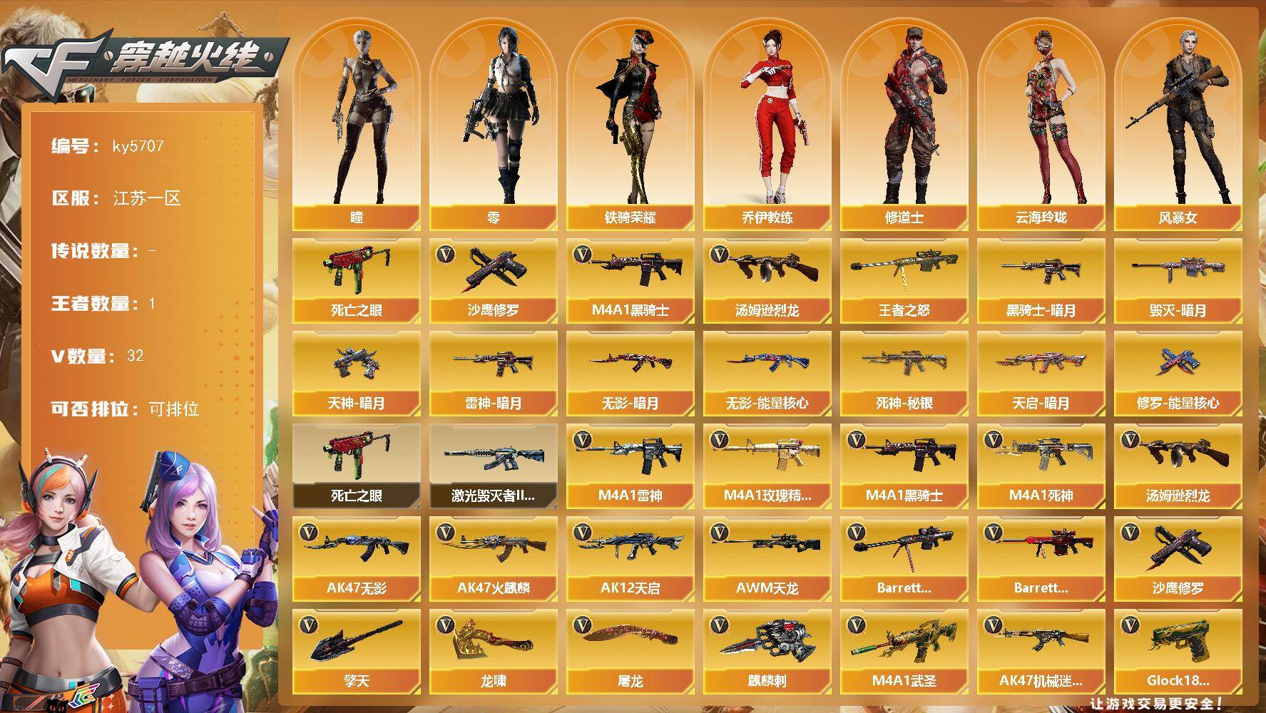 [16802987]江苏一区-32V-1王者武器数-0炫金武器数 【热门武器】:死亡之眼*2,M4A1-黑骑士,汤姆逊-烈龙,沙鹰-修罗*6 【王者炫金武器】:王者之怒 【皮肤】:雷神-暗月,毁灭-暗月,黑骑士-暗月,无影-暗月,无影-能量核心,死神-秘银,天启-暗月,修罗-能量核心*2,天神-暗月 【角色】:零,瞳,乔伊教练,修道士,云海玲珑,风暴女,娟娟,铁骑荣耀 【暴走生化】:死亡之眼*2 【挑战大师】:激光毁灭者III-白马银枪 【英雄级武器】:AK47-火麒麟,M4A1-雷神,M4A1-黑骑士,AK47-无影*2,M4A1-死神,AK12-天启,M4A1-武圣,AK47-机械迷城,M4A1-玫瑰精灵,AWM-天龙,Barrett-毁灭,Barrett-极光,汤姆逊-烈龙,沙鹰-修罗*6,Glock18-武圣,屠龙*3,龙啸,擎天,麒麟刺*2,M4A1-苍鸣雷神 【道具】:女皇终结者-背包,战舰背包,机械魔影背包-红色,炫彩背包,女皇终结者-魔龙之吻,绿色巨人,灵魂忍者,迷雾幽灵,夺命之镰,防化服*3,流光-鎏金之域,枪王排位29赛季金色流光,防弹头盔*3,防弹衣*3,C4工具钳*3,手雷包*3 【特殊枪械】:1黑骑士,1烈龙