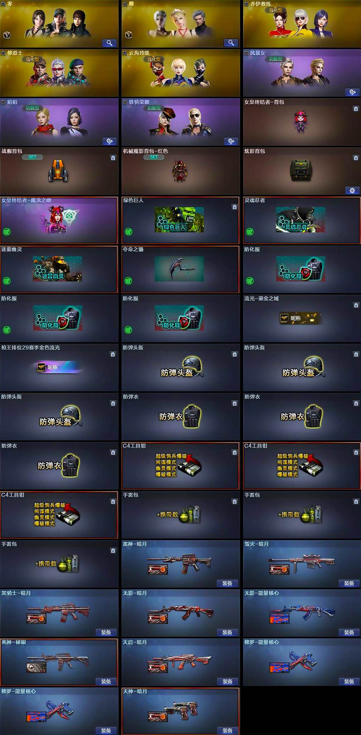 【道具】:女皇终结者-背包,战舰背包,机械魔影背包-红色,炫彩背包,女皇终结者-魔龙之吻,绿色巨人,灵魂忍者,迷雾幽灵,夺命之镰,防化服*3,流光-鎏金之域,枪王排位29赛季金色流光,防弹头盔*3,防弹衣*3,C4工具钳*3,手雷包*3