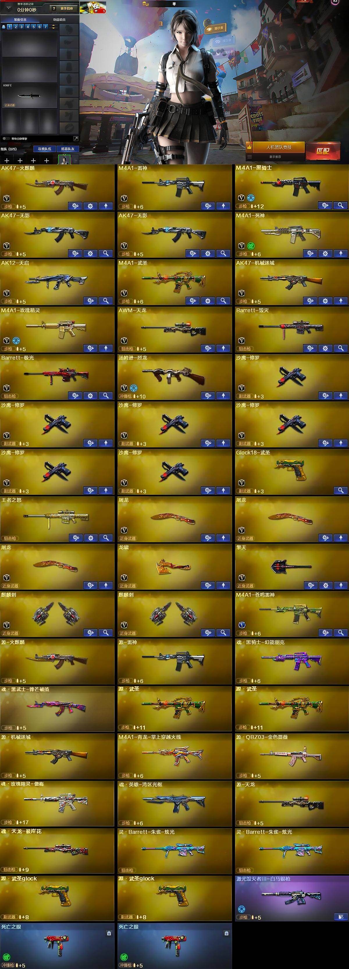 【英雄级武器】:AK47-火麒麟,M4A1-雷神,M4A1-黑骑士,AK47-无影*2,M4A1-死神,AK12-天启,M4A1-武圣,AK47-机械迷城,M4A1-玫瑰精灵,AWM-天龙,Barrett-毁灭,Barrett-极光,汤姆逊-烈龙,沙鹰-修罗*6,Glock18-武圣,屠龙*3,龙啸,擎天,麒麟刺*2,M4A1-苍鸣雷神