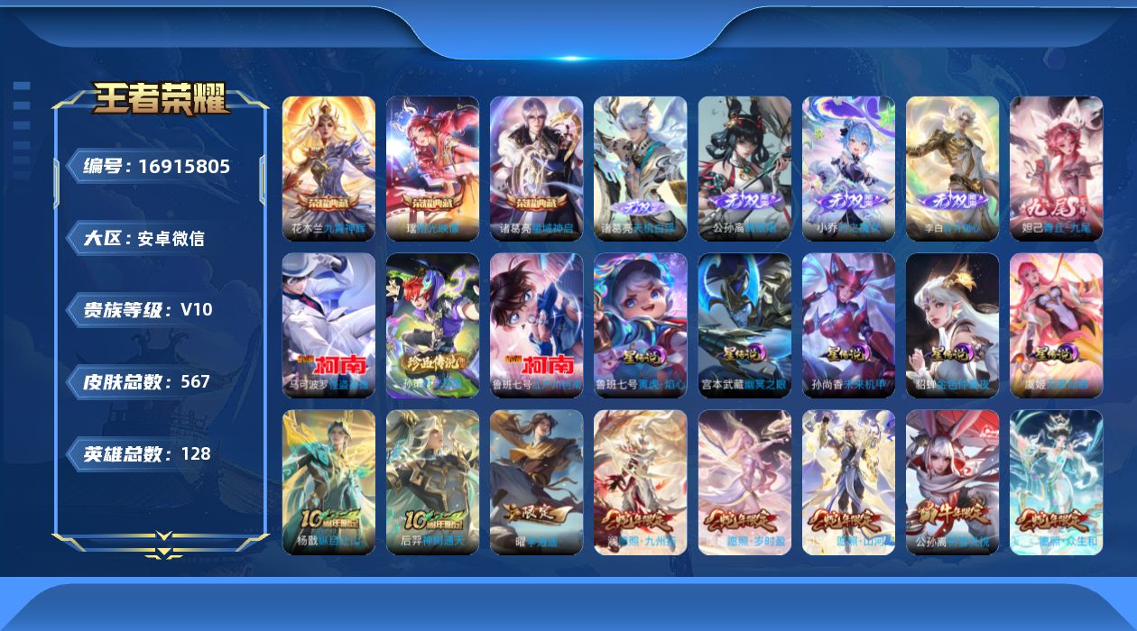 [16915805]安卓WX-V10-打野54段!294夺宝!66按键-128英雄-567皮肤-3典藏皮肤-5无双-3珍品传说-96传说-191史诗-5星元