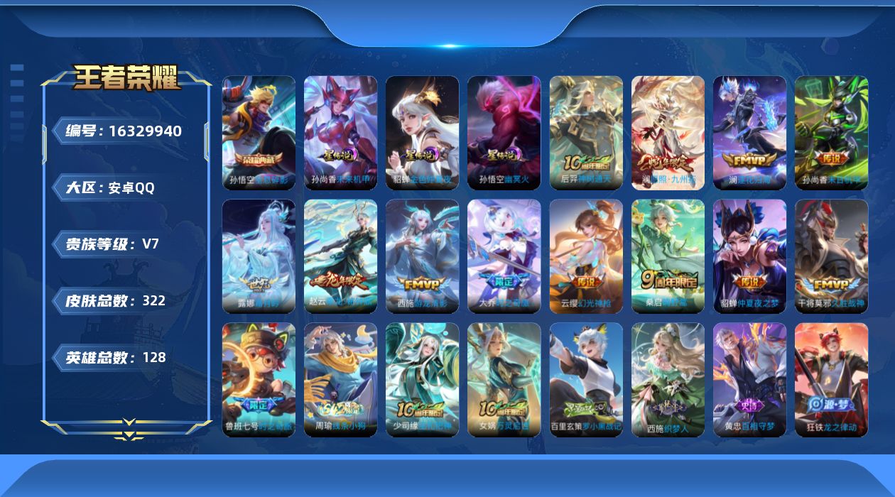 [16329940]安卓Q-322皮肤-1典藏皮肤-13传说-97史诗 【英雄全皮】:影全皮 【荣耀典藏】:孙悟空全息碎影 【传说皮肤】:后羿神树通天,澜愿照九州拓,云缨幻光神枪,桑启鸣野蒿,赵云乘龙铭钟鼎,澜逐花归海,露娜霜月吟,大乔时之奇旅,鲁班七号时之奇旅,西施游龙清影,干将莫邪久胜战神,貂蝉仲夏夜之梦,孙尚香末日机甲 【限定皮肤】:蒙犽顽岩魄,蔡文姬夏日便利店,大乔绒语心约,虞姬夏日便利店,姜子牙天穹之誓,杨戬破阵退雄兵,狄仁杰阴阳师,赵云皇家上将,墨子神迹守卫,妲己时之奇旅,孙尚香蔷薇恋人,鲁班七号乒乒小将,鲁班七号时之奇旅,高渐离死亡摇滚,扁鹊奇幻香踪,马可波罗山海玄木吟,狄仁杰魔术师,狄仁杰万华元夜,达摩沙漠行僧,项羽海滩派对,老夫子圣诞老人,老夫子醍醐杖,老夫子航海奇遇记,程咬金演武夺筹,兰陵王金庭之子,花木兰青春决赛季,孙悟空大圣娶亲,孙悟空孙行者,后羿如梦令,后羿圣弓游侠,李元芳匿光侦查者,李元芳云中旅人,钟馗驱傩正仪,杨戬潮玩骑兵,干将莫邪真爱魔法,蔡文姬繁星吟游,鬼谷子原初探秘者,鬼谷子五谷丰年,大乔时之奇旅,苏烈千军破阵,百里玄策原初追逐者,弈星混沌棋,梦奇顽趣,沈梦溪大漠名商,沈梦溪匿光破解者,明世隐疑决卦,裴擒虎天狼狩猎者,裴擒虎李小龙,裴擒虎擒涛扼浪,云中君纤云弄巧,上官婉儿梁祝,嫦娥拒霜思,嫦娥暖冬兔眠,西施玲珑珍味,西施至美乘鲤谣,鲁班大师探海日志,桑启海盐诗旅,暃星界游侠,戈娅驭风魔法,艾琳女武神,艾琳流音漫舞,司空震地狱燃心,阿古朵江河有灵,张良古海寻踪,蒙犽百解令,蒙恬荣光圣徽,高渐离燃音魔法,妲己灵卜魔法,鬼谷子天穹祈灯,伽罗琥珀纪元,姬小满妄想食味,安琪拉乘龙聚宝船,赵云乘龙铭钟鼎,沈梦溪龙舞盛年,刘邦剑破天穹,程咬金群星魔术团,镜青焰无极,项羽苍威无极,周瑜熔金海岸 【年限皮肤】:马可波罗山海玄木吟,安琪拉乘龙聚宝船,赵云乘龙铭钟鼎 【赛季限定】:狄仁杰万华元夜,达摩沙漠行僧,老夫子醍醐杖,程咬金演武夺筹,兰陵王金庭之子,张良古海寻踪,李元芳云中旅人,钟馗驱傩正仪,鬼谷子原初探秘者,苏烈千军破阵,百里玄策原初追逐者,弈星混沌棋,梦奇顽趣,沈梦溪大漠名商,明世隐疑决卦,裴擒虎擒涛扼浪,鲁班大师探海日志,桑启海盐诗旅,鬼谷子天穹祈灯,蒙恬荣光圣徽,刘邦剑破天穹,姜子牙天穹之誓 【战令限定】:墨子神迹守卫,蔡文姬夏日便利店,虞姬夏日便利店,扁