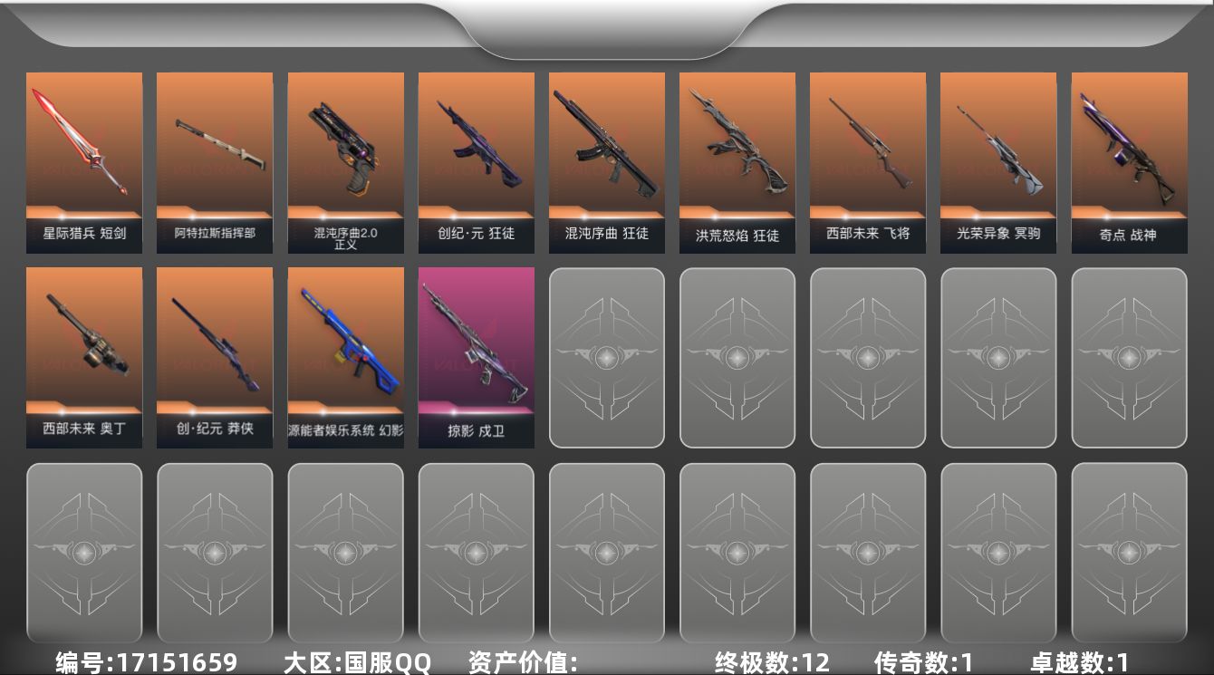 - [11687931]总资产:117.2M 1干员外观 7传说枪械 哈夫币:1.725K 进阶安全箱(2×2)9.15号到期 可二次 可修改实名 烽火地带段位:铂金 全面战场段位:上等兵 传说武器皮肤:AS Val突击步枪-蛇年祥瑞,SR-25射手步枪-水墨云图,AK-12突击步枪-夜鹰,SMG45冲锋枪-骑士,CAR-15突击步枪-阿米娅,复合弓-黑-天际线,勇士冲锋枪-能天使-午夜邮差 干员外观:露娜-黑·天际线