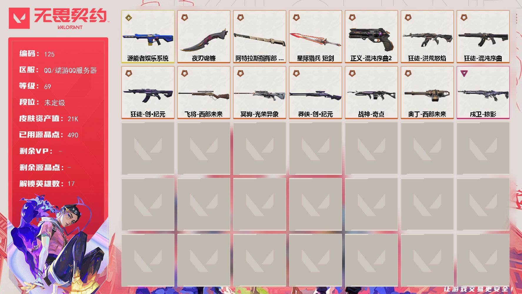 [17151659]【125】【英雄】:炼狱,暮蝶,钛狐,壹决,捷风,幽影,不死鸟,贤者,猎枭,零,芮娜,奇乐,尚勃勒,霓虹,盖可,钢锁 【近战武器】:近战武器-夜刃诡镰,近战武器-阿特拉斯指挥部 甩棍,近战武器-星际猎兵 短剑 【狂徒】:狂徒-洪荒怒焰,狂徒-混沌序曲,狂徒-创·纪元 【幻影】:幻影-源能者娱乐系统 【戍卫】:戍卫-掠影 【冥驹】:冥驹-光荣异象 【飞将】:飞将-西部未来 【莽侠】:莽侠-创·纪元 【战神】:战神-奇点 【奥丁】:奥丁-西部未来 【正义】:正义-混沌序曲//2.0 【卡面】:分崩离析 卡面,代号红色 卡面,新兵报到 卡面,V契约 卡面,无畏契约 卡面 【喷漆】:胜利属于无畏契约 喷漆,GLHF 喷漆,无畏契约 喷漆 【挂饰】:无畏契约 纪念币 挂饰