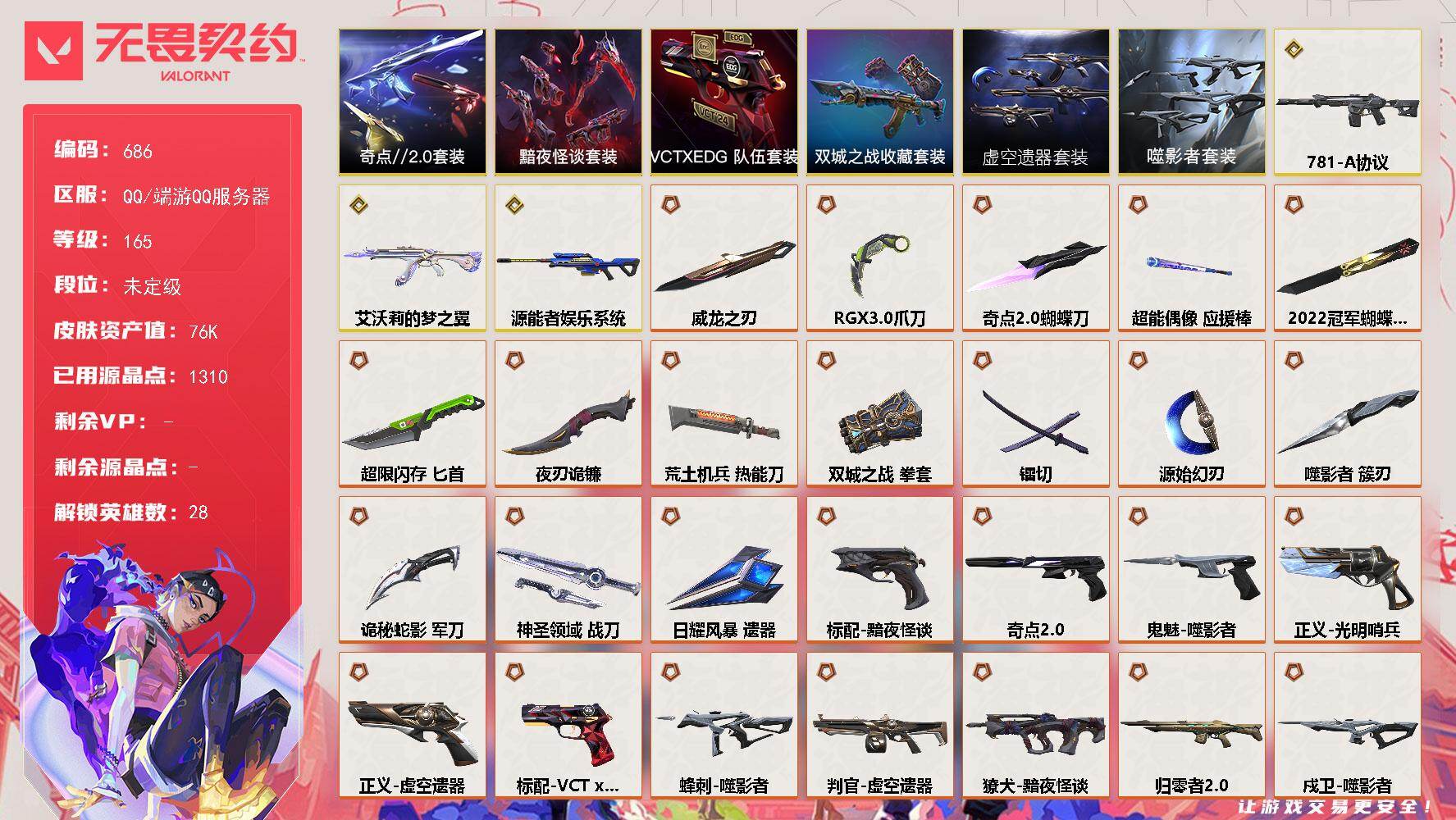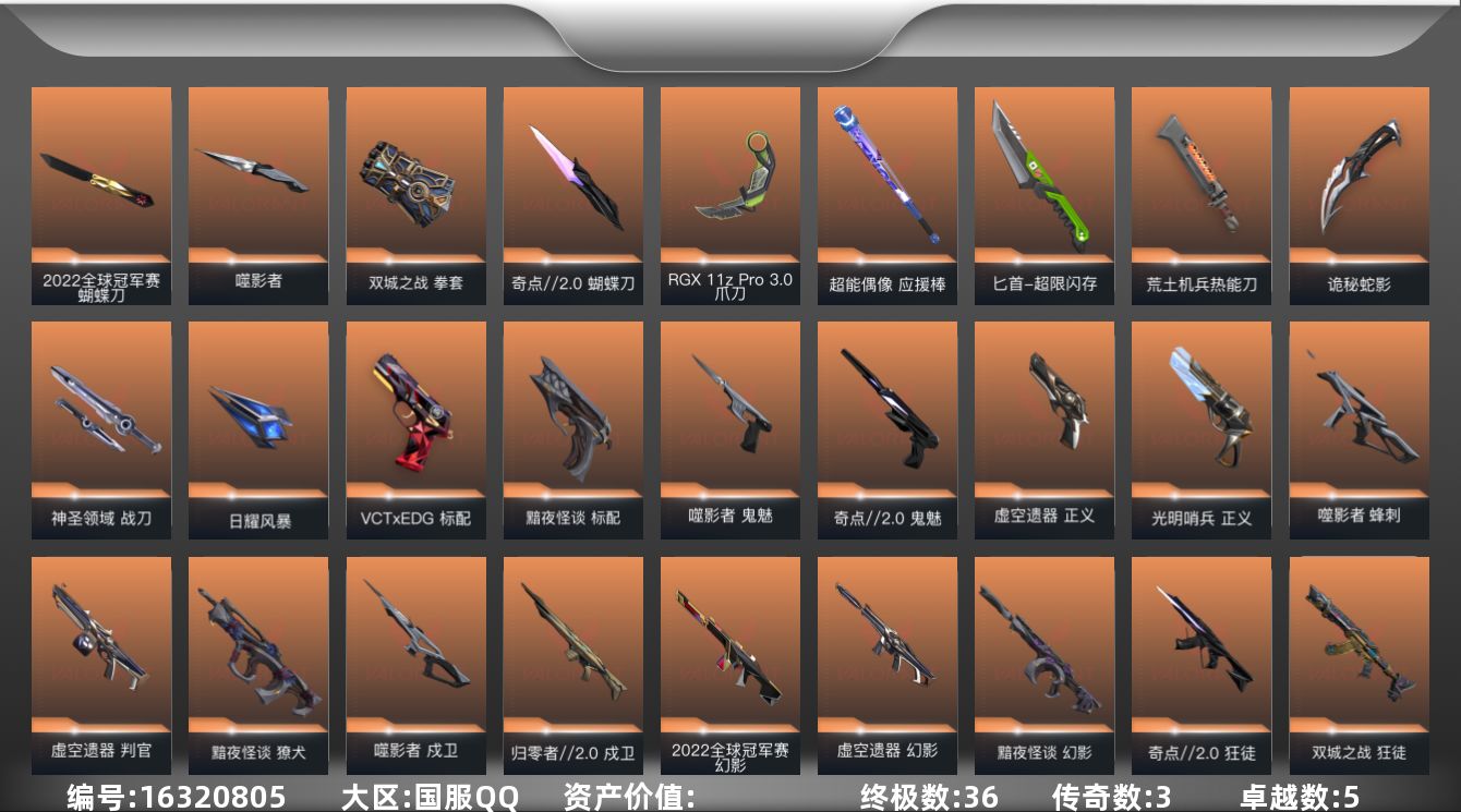 [16320805]【套装】:2022全球冠军赛套装,噬影者套装,虚空遗器套装,《双城之战》收藏套装,奇点//2.0套装,黯夜怪谈套装,VCTxEDG 队伍套装 【英雄】:幻棱,炼狱,维斯,暮蝶,钛狐,壹决,铁臂,捷风,雷兹,幽影,不死鸟,贤者,猎枭,蝰蛇,零,芮娜,奇乐,尚勃勒,霓虹,斯凯,夜露,星礈,K/O,海神,盖可,黑梦,钢锁 【近战武器】:近战武器-2022全球冠军赛 蝴蝶刀,近战武器-奇点//2.0 蝴蝶刀,近战武器-RGX 11z Pro//3.0 爪刀,近战武器-噬影者 簇刃,近战武器-镭切,近战武器-威龙之刃,近战武器-双城之战 拳套,近战武器-源始幻刃,近战武器-超能偶像 应援棒,近战武器-超限闪存 匕首,近战武器-荒土机兵 热能刀,近战武器-夜刃诡镰,近战武器-诡秘蛇影 军刀,近战武器-神圣领域 战刀,近战武器-日耀风暴 遗器 【狂徒】:狂徒-艾沃莉的梦之翼,狂徒-归零者,狂徒-混沌序曲,狂徒-奇点//2.0,狂徒-双城之战,狂徒-虚空遗器,狂徒-噬影者,狂徒-盖亚的复仇,狂徒-离子武器//2.0,狂徒-超能偶像,狂徒-荒土机兵,狂徒-诡秘蛇影 【幻影】:幻影-781-A协议,幻影-2022全球冠军赛,幻影-黯夜怪谈,幻影-虚空遗器,幻影-侦察力量,幻影-超限闪存,幻影-神圣领域,幻影-聚合之力,幻影-纳米打击,幻影-末日之翼 【戍卫】:戍卫-归零者//2.0,戍卫-噬影者,戍卫-超能偶像,戍卫-浮光跃金,戍卫-逆冲蛮牛,戍卫-月球哨兵,戍卫-折光棱晶 【獠犬】:獠犬-黯夜怪谈,獠犬-神圣领域,獠犬-采蜜小蜂队,獠犬-模拟赫兹,獠犬-逆冲蛮牛 【冥驹】:冥驹-源能者娱乐系统,冥驹-荒土机兵,冥驹-模拟赫兹,冥驹-星云暗涌 【飞将】:飞将-黯夜怪谈,飞将-聚合之力,飞将-末日之翼 【莽侠】:莽侠-超限闪存,莽侠-诡秘蛇影,莽侠-月球哨兵 【战神】:战神-神圣领域,战神-采蜜小蜂队,战神-浮光跃金 【奥丁】:奥丁-纳米打击,奥丁-末日之翼 【判官】:判官-虚空遗器,判官-超能偶像,判官-诡秘蛇影,判官-采蜜小蜂队,判官-纳米打击x 【雄鹿】:雄鹿-模拟赫兹,雄鹿-逆冲蛮牛,雄鹿-月球哨兵 【骇灵】:骇灵-海洋之星,骇灵-荒土机兵,骇灵-浮光跃金,骇灵-星云暗涌 【蜂刺】:蜂刺-噬影者,蜂刺-超限闪存,蜂刺-聚合之力,蜂刺-星云暗涌,蜂刺-折光棱晶 【标配】:标配-黯