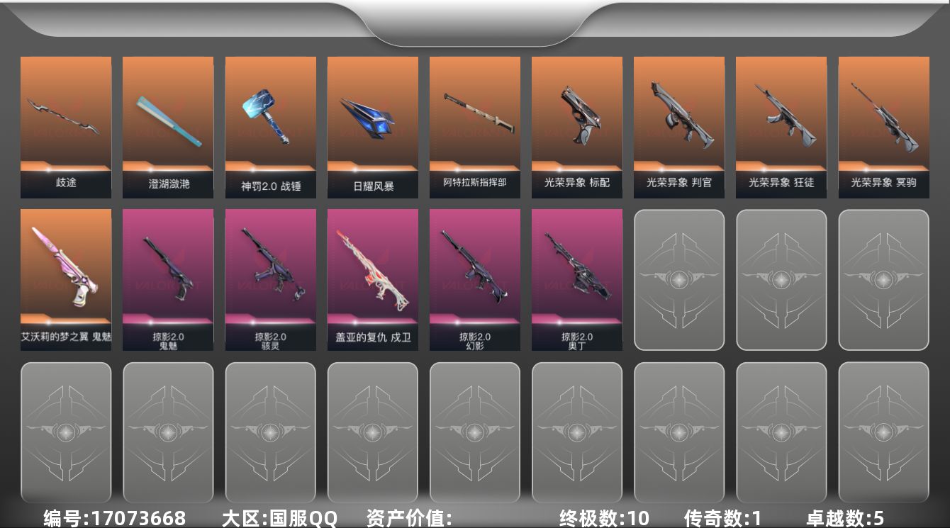 [17073668]【套装】:光荣异象套装,掠影//2.0套装 【英雄】:炼狱,暮蝶,钛狐,壹决,铁臂,捷风,雷兹,不死鸟,贤者,猎枭,芮娜,奇乐,尚勃勒,霓虹,斯凯,夜露,K/O,海神,盖可,黑梦,钢锁 【近战 武器】:近战武器-影钩,近战武器-光荣异象 歧途,近战武器-澄湖潋滟,近战武器-神罚//2.0 战锤,近战武器-日耀风暴 遗器,近战武器-阿特拉斯指挥部 甩棍 【狂徒】:狂徒-光荣异象 【幻影】:幻影-掠影//2.0 【戍卫】:戍卫-盖亚的复仇 【冥驹】:冥驹-光荣异象 【奥丁】:奥丁-掠影//2.0 【判官】:判官-光荣异象 【骇灵】:骇灵-掠影//2.0 【标配】:标配-光荣异象 【鬼魅】:鬼魅-艾沃莉的梦之翼,鬼魅-掠影//2.0,鬼魅-诡秘蛇影 【卡面】:树懒大作战 卡面,无畏契约GO!第一卷:芮娜 卡面,无畏契约GO!第一卷:零 卡面,无垠星环 卡面,《双城之战》金克丝 卡面,代号红色 卡面,新兵报到 卡面,V契约 卡面,无畏契约 卡面 【喷漆】:买装还是存钱 喷漆,放下武器 喷漆,胜利属于无畏契约 喷漆,GLHF 喷漆,无畏契约 喷漆 【挂饰】:动力机箱 挂饰,天外飞客 挂饰,无畏契约 纪念币 挂饰