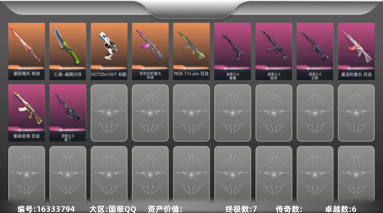 [16333794]【套装】:掠影//2.0套装 【英雄】:幻棱,炼狱,维斯,暮蝶,钛狐,壹决,铁臂,捷风,雷兹,幽影,不死鸟,贤者,猎枭,蝰蛇,零,芮娜,奇乐,尚勃勒,霓虹,斯凯,夜露,星礈,K/O,海神,盖可,黑梦,钢锁 【近战 武器】:近战武器-影钩,近战武器-穿花蝴蝶,近战武器-超限闪存 匕首,近战武器-星际猎兵 短剑 【狂徒】:狂徒-RGX 11z Pro,狂徒-多弥尔的复仇,狂徒-盖亚的复仇,狂徒-紫阙金琅 【幻影】:幻影-掠影//2.0,幻影-超限闪存 【戍卫】:戍卫-浮光跃金 【獠犬】:獠犬-模拟赫兹 【冥驹】:冥驹-模拟赫兹 【莽侠】:莽侠-超限闪存 【战神】:战神-浮光跃金 【奥丁】:奥丁-掠影//2.0 【雄鹿】:雄鹿-模拟赫兹 【骇灵】:骇灵-掠影//2.0,骇灵-无限竞技,骇灵-浮光跃金 【蜂刺】:蜂刺-超限闪存 【标配】:标配-浮光跃金 【VCT手枪】:标配-VCT25 x 100T 【正义】:正义-超限闪存,正义-纳米打击 【鬼魅】:鬼魅-掠影//2.0,鬼魅-诡秘蛇影,鬼魅-模拟赫兹,鬼魅-星云暗涌 【卡面】:终章:激斗汉堡 卡面,进入射程 卡面,《双城之战》拥抱 卡面,精灵大战 卡面,欢迎来到底城 卡面,南瓜盛典 卡面,唱片的故事 卡面,钢弓与箭弦 卡面,排除故障 卡面,战术桌游 卡面,悠享食光 卡面,修车达人 卡面,热舞环节 卡面,模拟赫兹 卡面,浮光跃金 卡面,超限闪存 卡面,维斯工牌 卡面,正义的化身 卡面,最高舞台 卡面,Clutch 卡面,梦幻奶茶 卡面,无畏契约GO!第一卷:芮娜 卡面,无畏契约GO!第一卷:零 卡面,《双城之战》金克丝 卡面,别冒尖 卡面,代号红色 卡面,新兵报到 卡面,V契约 卡面,无畏契约 卡面 【喷漆】:嗨宝南瓜灯 喷漆,嘭! 喷漆,都算到了 喷漆,控场勿近 喷漆,皮蛋呼呼 喷漆,像素星礈 喷漆,图谋不轨的零 喷漆,小丑猫 喷漆,模拟赫兹 喷漆,高丽风情小熊 喷漆,蹲到一个 喷漆,全力集中 喷漆,超限闪存 喷漆,RUA一下 喷漆,熊抱 喷漆,高丽风情小虎 喷漆,记在小本本 喷漆,防弹企鹅 喷漆,高丽风情小蛙 喷漆,超级粉丝 喷漆,捷风差距 喷漆,致命优雅 喷漆,霓光四射 喷漆,买装还是存钱 喷漆,关门放狗 喷漆,无畏契约GO!第一卷:贤者 喷漆,真相只有一个 喷漆,胜利属于无畏契约 喷漆,GLHF 喷漆,无畏契约