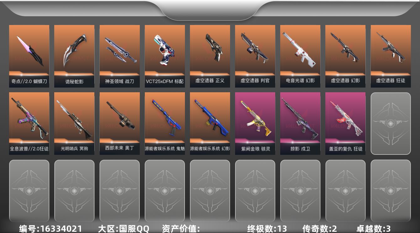 [16334021]【套装】:虚空遗器套装 【英雄】:幻棱,炼狱,维斯,暮蝶,钛狐,壹决,铁臂,捷风,雷兹,幽影,不死鸟,贤者,猎枭,蝰蛇,零,芮娜,奇乐,尚勃勒,霓虹,斯凯,夜露,星礈,K/O,海神,盖可,黑梦,钢锁 【近战 武器】:近战武器-奇点//2.0 蝴蝶刀,近战武器-源始幻刃,近战武器-诡秘蛇影 军刀,近战武器-神圣领域 战刀 【狂徒】:狂徒-全息波普//2.0,狂徒-虚空遗器,狂徒-盖亚的复仇,狂徒-诡秘蛇影 【幻影】:幻影-源能者娱乐系统,幻影-虚空遗器,幻影-电音光谱,幻影-神圣领域,幻影-末日之翼,幻影-电音光谱 【戍卫】:戍卫-掠影,戍卫-月球哨兵,戍卫-折光棱晶 【獠犬】:獠犬-神圣领域 【冥驹】:冥驹-光明哨兵,冥驹-星云暗涌 【飞将】:飞将-末日之翼 【莽侠】:莽侠-诡秘蛇影,莽侠-月球哨兵 【战神】:战神-神圣领域 【奥丁】:奥丁-西部未来,奥丁-末日之翼 【判官】:判官-虚空遗器,判官-诡秘蛇影 【雄鹿】:雄鹿-月球哨兵 【骇灵】:骇灵-紫阙金琅,骇灵-无限竞技,骇灵-星云暗涌 【蜂刺】:蜂刺-星云暗涌,蜂刺-折光棱晶 【标配】:标配-折光棱晶 【VCT手枪】:标配-VCT25 x DFM 【正义】:正义-虚空遗器,正义-月球哨兵 【鬼魅】:鬼魅-源能者娱乐系统,鬼魅-诡秘蛇影,鬼魅-星云暗涌 【狂怒】:狂怒-神圣领域 【短炮】:短炮-末日之翼 【卡面】:精灵大战 卡面,南瓜盛典 卡面,热舞环节 卡面,Clutch 卡面,无畏契约GO!第一卷:芮娜 卡面,无畏契约GO!第一卷:零 卡面,《双城之战》金克丝 卡面,无畏契约GO!第一卷:贤者 卡面,别冒尖 卡面,代号红色 卡面,新兵报到 卡面,V契约 卡面,无畏契约 卡面 【喷漆】:嗨宝南瓜灯 喷漆,控场勿近 喷漆,买装还是存钱 喷漆,无畏契约GO!第一卷:芮娜 喷漆,无畏契约GO!第一卷:贤者 喷漆,暴走萝莉 喷漆,胜利属于无畏契约 喷漆,GLHF 喷漆,无畏契约 喷漆 【挂饰】:伞绳 挂饰,第九季//第三幕 纪念币 挂饰,天外飞客 挂饰,《双城之战》魄罗 挂饰,无畏契约 纪念币 挂饰