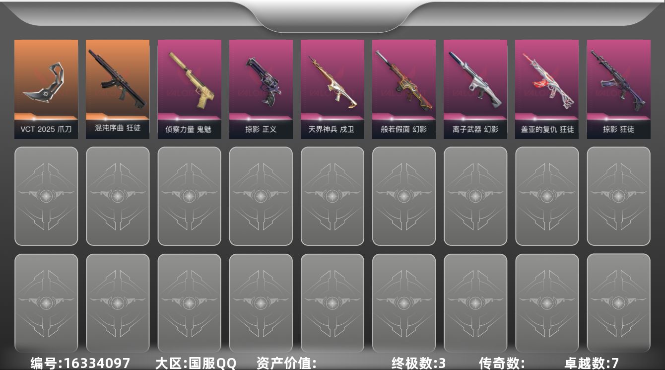 [16334097]【套装】:VCT 2025 赛季套装 【英雄】:幻棱,炼狱,维斯,暮蝶,钛狐,壹决,铁臂,捷风,雷兹,幽影,不死鸟,贤者,猎枭,蝰蛇,零,芮娜,奇乐,尚勃勒,霓虹,斯凯,夜露,星礈,K/O,海神,盖可,黑梦,钢锁 【近战 武器】:近战武器-VCT 2025 爪刀,近战武器-紫金爪刀 【狂徒】:狂徒-混沌序曲,狂徒-掠影,狂徒-盖亚的复仇 【幻影】:幻影-般若假面,幻影-离子武器 【戍卫】:戍卫-天界神兵 【标配】:标配-超能偶像 【正义】:正义-掠影,正义-超限闪存,正义-复古浪潮,正义-纳米打击 【鬼魅】:鬼魅-侦察力量,鬼魅-流星兵团,鬼魅-诡秘蛇影,鬼魅-光导纤维,鬼魅-星云暗涌 【短炮】:短炮-蛇吻 【卡面】:终章:激斗汉堡 卡面,进入射程 卡面,《双城之战》拥抱 卡面,精灵大战 卡面,欢迎来到底城 卡面,南瓜盛典 卡面,VCT CN首冠 卡面,修车达人 卡面,热舞环节 卡面,正义的化身 卡面,至黑之夜 卡面,终章:生意人麦宝 卡面,铁之华 卡面,时间到 卡面,最高舞台 卡面,音熊登场 卡面,树懒大作战 卡面,声感陷阱设计图 卡面,红鳞松叶 卡面,梦幻奶茶 卡面,终章:打造专属狂徒 卡面,趁热吃 卡面,源能反应 卡面,零点嗅探设计图 卡面,终章:瓦娃脸雪糕 卡面,无畏契约:蝰蛇 卡面,表象之下 卡面,沙雕爆能器 卡面,无畏契约GO!第一卷:芮娜 卡面,清除名单 卡面,无畏契约GO!第一卷:零 卡面,终章:同步耍酷 卡面,龍记 卡面,化茧成蝶 卡面,无垠星环 卡面,《双城之战》金克丝 卡面,完美调谐 卡面 ,暗枪 卡面,无畏契约GO!第一卷:贤者 卡面,铁臂设计图 卡面,代号红色 卡面,新兵报到 卡面,V契约 卡面,无畏契约 卡面 【喷漆】:嗨宝南瓜灯 喷漆,嘭! 喷漆,都算到了 喷漆,控场勿近 喷漆,小丑猫 喷漆,熊抱 喷漆,蛋糕还是爆能器? 喷漆,超级粉丝 喷漆,捷风差距 喷漆,惊声尖叫 喷漆,战术熊的巴拉莱卡琴 喷漆,审判之爪 喷漆,拼一枪 喷漆,我觉得不行 喷漆,蝰蛇 喷漆,我的刀呢? 喷漆,致命毒素 喷漆,喜欢哪种毒? 喷漆,霓光四射 喷漆,UWU 喷漆,新潮流 喷漆,双击点赞 喷漆,买装还是存钱 喷漆,醒狮贺春 喷漆,关门放狗 喷漆,酷熊冲浪 喷漆,无畏契约GO!第一卷:芮娜 喷漆,红鳞 喷漆,无畏契约GO!第一卷:零 喷漆,无畏契约GO!第一卷