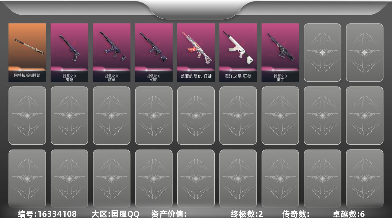 [16334108]【套装】:掠影//2.0套装 【英雄】:炼狱,维斯,暮蝶,壹决,铁臂,捷风,雷兹,幽影,不死鸟,贤者,猎枭,零,芮娜,奇乐,尚勃勒,霓虹,斯凯,夜露,星礈,K/O,盖可,黑梦,钢锁 【近战武器】:近战武器-影钩,近战武器-阿特拉斯指挥部 甩棍 【狂徒】:狂徒-盖亚的复仇,狂徒-海洋之星 【幻影】:幻影-掠影//2.0 【奥丁】:奥丁-掠影//2.0 【骇灵】:骇灵-掠影//2.0,骇灵-无限竞技 【鬼魅】:鬼魅-掠影//2.0 【卡面】:热舞环节 卡面,Clutch 卡面,无畏契约GO!第一卷:芮娜 卡面,无畏契约GO!第一卷:零 卡面,《双城之战》金克丝 卡面,钢锁vs盖可 卡面,代号红色 卡面,新兵报到 卡面,V契约 卡面,无畏契约 卡面 【喷漆】:霓光四射 喷漆,买装还是存钱 喷漆,关门放狗 喷漆,酷熊冲浪 喷漆,松叶 喷漆,胜利属于无畏契约 喷漆,GLHF 喷漆,无畏契约 喷漆 【挂饰】:无畏契约GO!第一卷 零 挂饰,薰衣草之心 挂饰,天外飞客 挂饰,无畏契约 纪念币 挂饰