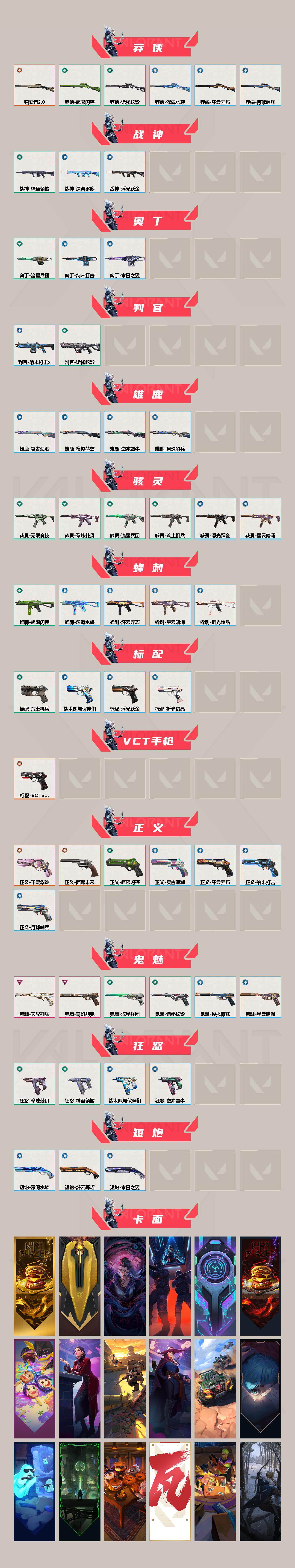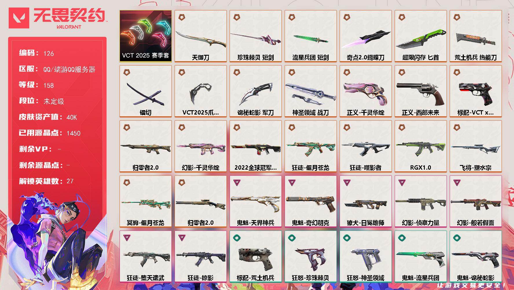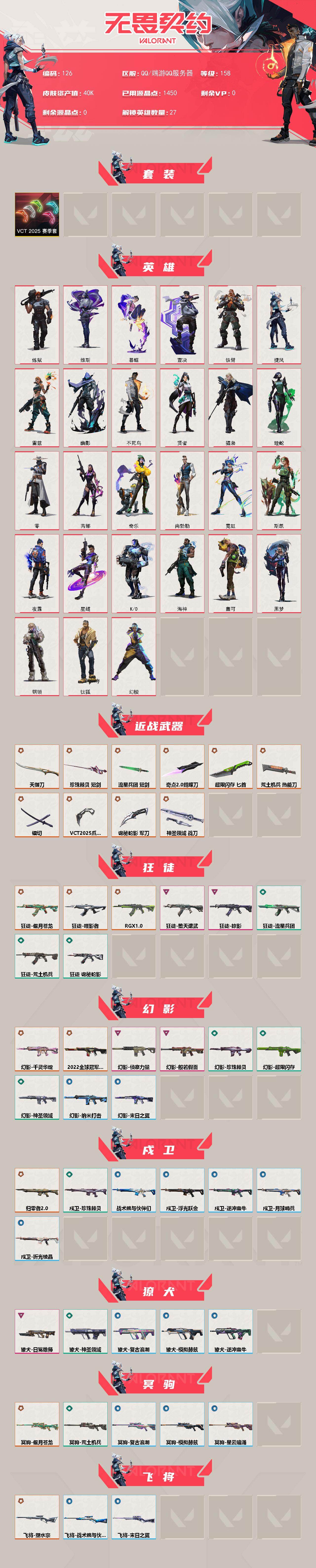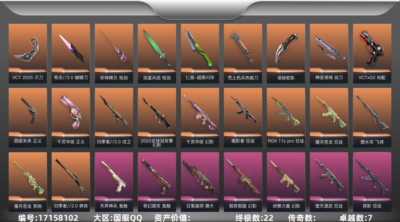 [17158102]【126】【套装】:VCT 2025 赛季套装 【英雄】:幻棱,炼狱,维斯,暮蝶,钛狐,壹决,铁臂,捷风,雷兹,幽影,不死鸟,贤者,猎枭,蝰蛇,零,芮娜,奇乐,尚勃勒,霓虹,斯凯,夜露,星礈,K/O,海神,盖可,黑梦,钢锁 【近战武器】:近战武器-奇点//2.0 蝴蝶刀,近战武器-VCT 2025 爪刀,近战武器-镭切,近战武器-珍珠棘贝 短剑,近战武器-流星兵团 短剑,近战武器-超限闪存 匕首,近战武器-荒土机兵 热能刀,近战武器-天御刀,近战武器-诡秘蛇影 军刀,近战武器-神圣领域 战刀 【狂徒】:狂徒-偃月苍龙,狂徒-噬影者,狂徒-RGX 11z Pro,狂徒-堕天遗武,狂徒-掠影,狂徒-荒土机兵,狂徒-流星兵团,狂徒-诡秘蛇影 【幻影】:幻影-2022全球冠军赛,幻影-千灵华绽,幻影-般若假面,幻影-侦察力量,幻影-超限闪存,幻影-珍珠棘贝,幻影-神圣领域,幻影-纳米打击,幻影-末日之翼 【戍卫】:戍卫-归零者//2.0,戍卫-珍珠棘贝,戍卫-浮光跃金,戍卫-逆冲蛮牛,戍卫-战术熊与伙伴们,戍卫-月球哨兵,戍卫-折光棱晶 【獠犬】:獠犬-日冕雄师,獠犬-神圣领域,獠犬-复古浪潮,獠犬-模拟赫兹,獠犬-逆冲蛮牛 【冥驹】:冥驹-偃月苍龙,冥驹-荒土机兵,冥驹-复古浪潮,冥驹-模拟赫兹,冥驹-星云暗涌 【飞将】:飞将-塑水宗,飞将-战术熊与伙伴们,飞将-末日之翼 【莽侠】:莽侠-归零者//2.0,莽侠-超限闪存,莽侠-诡秘蛇影,莽侠-深海水族,莽侠-纤云弄巧,莽侠-月球哨兵 【战神】:战神-神圣领域,战神-浮光跃金,战神-深海水族 【奥丁】:奥丁-流星兵团,奥丁-纳米打击,奥丁-末日之翼 【判官】:判官-诡秘蛇影,判官-纳米打击x 【雄鹿】:雄鹿-复古浪潮,雄鹿-模拟赫兹,雄鹿-逆冲蛮牛,雄鹿-月球哨兵 【骇灵】:骇灵-荒土机兵,骇灵-流星兵团,骇灵-珍珠棘贝,骇灵-无限竞技,骇灵-浮光跃金,骇灵-星云暗涌 【蜂刺】:蜂刺-超限闪存,蜂刺-深海水族,蜂刺-纤云弄巧,蜂刺-星云暗涌,蜂刺-折光棱晶 【标配】:标配-荒土机兵,标配-浮光跃金,标配-战术熊与伙伴们,标配-折光棱晶 【VCT手枪】:标配-VCT x G2 【正义】:正义-千灵华绽,正义-西部未来,正义-超限闪存,正义-复古浪潮,正义-纳米打击,正义-纤云弄巧,正义-月球哨兵 【鬼魅】:鬼魅-奇幻朋克,