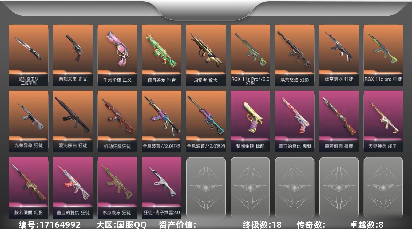 - [12314170]24橙皮 13紫皮 123皮肤 14英雄 178卡面 1435已用源晶 钻石 优质装备:狂徒-混沌序曲,狂徒-紫阙金琅,狂徒-盖亚的复仇,狂徒-偃月苍龙,幻影-侦察力量,幻影-紫阙金琅2.0,狂徒-日冕雄师,狂徒-全息波普//2.0,正义-RGX 11z Pro 3.0,盖亚之愠,冥驹-起源,鬼魅-天界神兵,天玄刀,獠犬-全息波普,爪刀-RGX 11z Pro 3.0,匕首-超限闪存,蝴蝶刀-奇点//2.0,荒土机兵热能刀,神圣领域 战刀,未来开拓者,VCT 2025 爪刀,诡秘蛇影,阿特拉斯指挥部,戍卫-紫阙金琅 亮点皮肤:幻影-2022全球冠军赛,2022全球冠军赛 蝴蝶刀 套装:2022全球冠军赛,VCT 2025赛季礼包,VCTCN2025套装 佩枪皮肤:标配-VCT25xTH,鬼魅-灵魂冲击,标配-VCTxEDG 冲锋枪皮肤:骇灵-神中神罚 步枪皮肤:幻影-西部未来,狂徒-般若假面//2.0,狂徒-滋滋X特攻队,狂徒-海洋之星,狂徒-堕天遗武 近战武器皮肤:超能偶像 应援棒