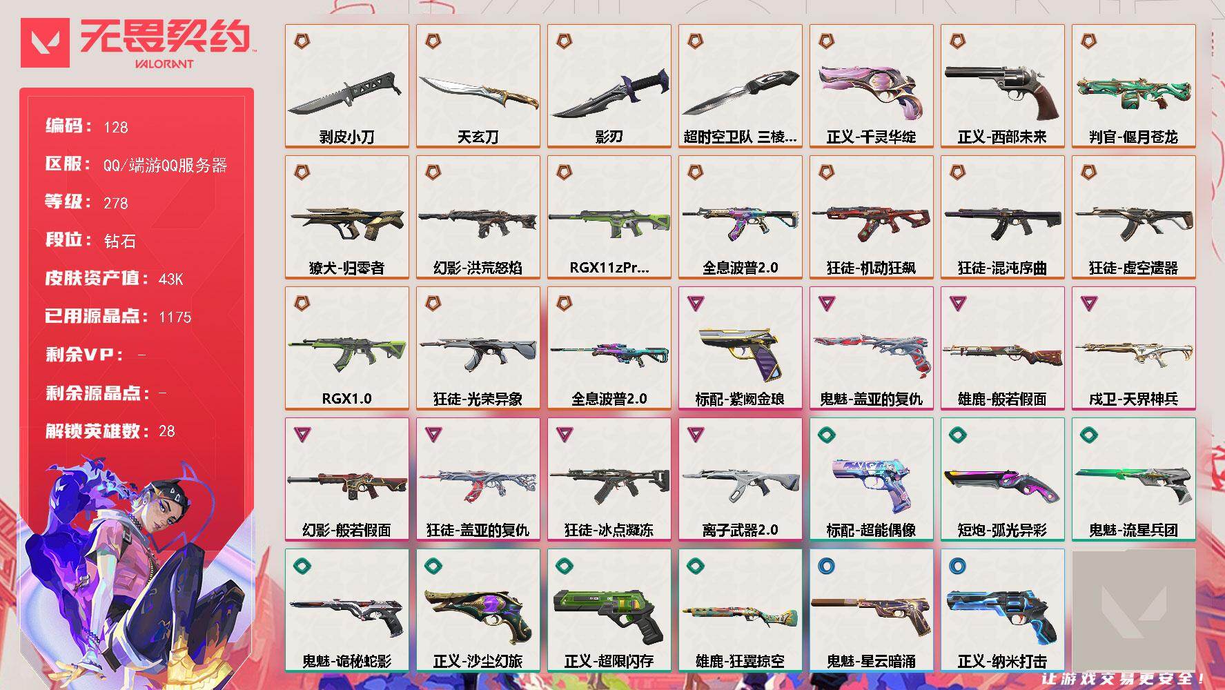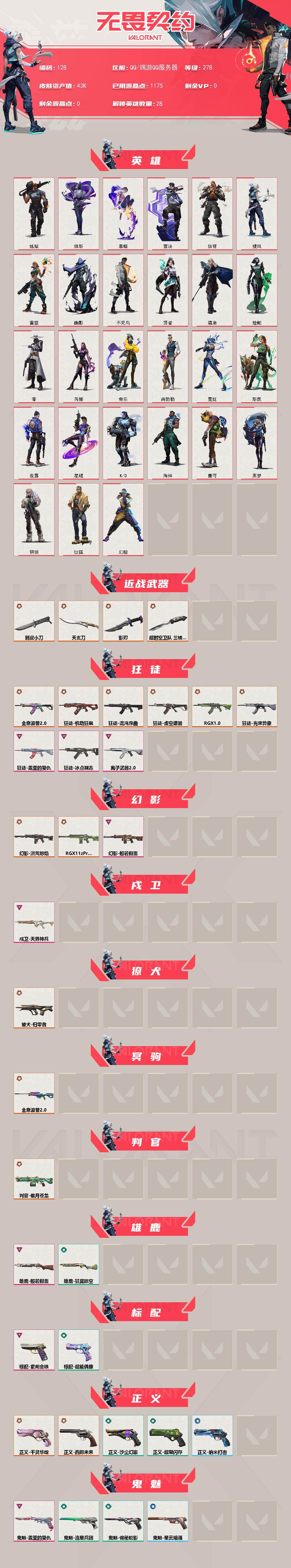 [17164992]【128】【英雄】:幻棱,炼狱,维斯,暮蝶,钛狐,壹决,铁臂,捷风,雷兹,幽影,不死鸟,贤者,猎枭,蝰蛇,零,芮娜,奇乐,尚勃勒,霓虹,斯凯,夜露,星礈,K/O,海神,盖可,黑梦,钢锁 【近战武器】:近战武器-超时空卫队 三棱军刺,近战武器-剥皮小刀,近战武器-天玄刀,近战武器-影刃 【狂徒】:狂徒-混沌序曲,狂徒-机动狂飙,狂徒-全息波普//2.0,狂徒-虚空遗器,狂徒-RGX 11z Pro,狂徒-光荣异象,狂徒-冰点凝冻,狂徒-盖亚的复仇,狂徒-离子武器//2.0 【幻影】:幻影-洪荒怒焰,幻影-RGX 11z Pro//2.0,幻影-般若假面 【戍卫】:戍卫-天界神兵 【獠犬】:獠犬-归零者 【冥驹】:冥驹-全息波普//2.0 【判官】:判官-偃月苍龙 【雄鹿】:雄鹿-般若假面,雄鹿-狂翼掠空 【标配】:标配-紫阙金琅,标配-超能偶像 【正义】:正义-千灵华绽,正义-西部未来,正义-超限闪存,正义-沙尘幻旅,正义-纳米打击 【鬼魅】:鬼魅-盖亚的复仇,鬼魅-流星兵团,鬼魅-诡秘蛇影,鬼魅-星云暗涌 【短炮】:短炮-弧光异彩 【卡面】:终章:激斗汉堡 卡面,进入射程 卡面,银弹猎手 卡面,《双城之战》拥抱 卡面,精灵大战 卡面,欢迎来到底城 卡面,南瓜盛典 卡面,无畏契约:暮蝶 卡面,修车达人 卡面,正义的化身 卡面,终章:生意人麦宝 卡面,铁之华 卡面,时间到 卡面,最高舞台 卡面,声感陷阱设计图 卡面,梦幻奶茶 卡面,终章:打造专属狂徒 卡面,趁热吃 卡面,哨卫者之领域 卡面,战术熊与伙伴们 卡面,源能反应 卡面,零点嗅探设计图 卡面,无畏契约GO!第一卷:芮娜 卡面,清除名单 卡面,无畏契约GO!第一卷:零 卡面,龍记 卡面,《双城之战》金克丝 卡面,完美调谐 卡面 ,暗枪 卡面,终章:黑影先生的咖啡! 卡面,铁臂vs雷兹 卡面,夯实根基 卡面,"Luie" 卡面,热烈欢迎 卡面,铁臂设计图 卡面,代号红色 卡面,冰淇淋店 卡面,新兵报到 卡面,友军火力 卡面,V契约 卡面,无畏契约 卡面 【喷漆】:嗨宝南瓜灯 喷漆,嘭! 喷漆,都算到了 喷漆,控场勿近 喷漆,伤心心 喷漆,小丑猫 喷漆,熊抱 喷漆,超级粉丝 喷漆,捷风差距 喷漆,惊声尖叫 喷漆,拼一枪 喷漆,我觉得不行 喷漆,我的刀呢? 喷漆,哨卫滑步 喷漆,要喝完噢! 喷漆,双击点赞 喷漆,买装还