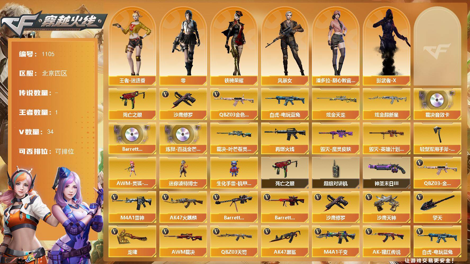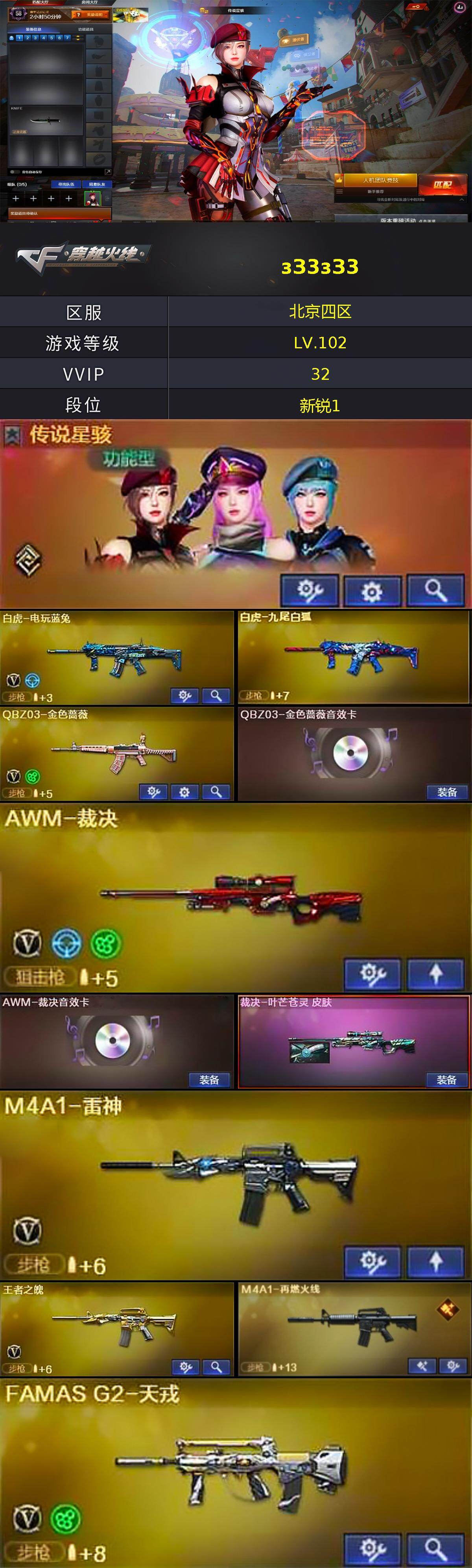 [16429155]北京四区-34V-1王者-2炫金 【传说角色】:传说星骇 【热门武器】:QBZ03-金色蔷薇,死亡之眼,白虎-电玩蓝兔,沙鹰-修罗*2 【王者炫金武器】:炫金超新星,炫金天龙 【音效卡】:AWM-裁决音效卡,Barrett-碧霄极光音效卡,炼狱-百战金芒-庆典舞曲音效卡 【皮肤】:裁决-叶芒苍灵 皮肤,M4A1-再燃火线,毁灭-魔灵皮肤,毁灭-英雄计划 皮肤,轻型军用手斧-再燃火线 【角色】:零,王者-迷迭香,风暴女,潘多拉-甜心教官,铁骑荣耀,影武者-X 【人偶武器】:AWM-灵狐-15周年嘉年华,迷你波特博士*3,生化手雷-机甲核心 【暴走生化】:死亡之眼,超级对讲机 【挑战大师】:神圣爆裂者-末日III 【英雄级武器】:M4A1-千变,AK47-火麒麟,M4A1-雷神,AK47-黑鲨,QBZ03-天罚,FAMAS G2-天戎,QBZ03-金色蔷薇,王者之魄-觉醒版,AK-47-猩红传说,白虎-电玩蓝兔,Barrett-毁灭,Barrett-极光,AWM-裁决,炼狱-百战金芒,沙鹰-修罗*2,沙鹰-天神,龙啸,擎天,麒麟刺-百战金芒,高爆手雷-雷霆,闪光弹-雷霆,烟雾弹-雷霆 【道具】:CFPL炫彩背包,CFS限定背包,云山科技背包,战舰背包,炫彩背包,百战金芒炫彩背包,女皇终结者-魔龙之吻,妩媚妖姬,绿色巨人,灵魂忍者,迷雾幽灵,夺命之镰,防化服*3,金色流光-枪王排位*2,星辰流光-枪王排位,流光-鎏金之域,语音特效-盛典烟火,萌萌小葵表情,防弹头盔*3,防弹衣*3,C4工具钳*3,手雷包*3 【特殊枪械】: