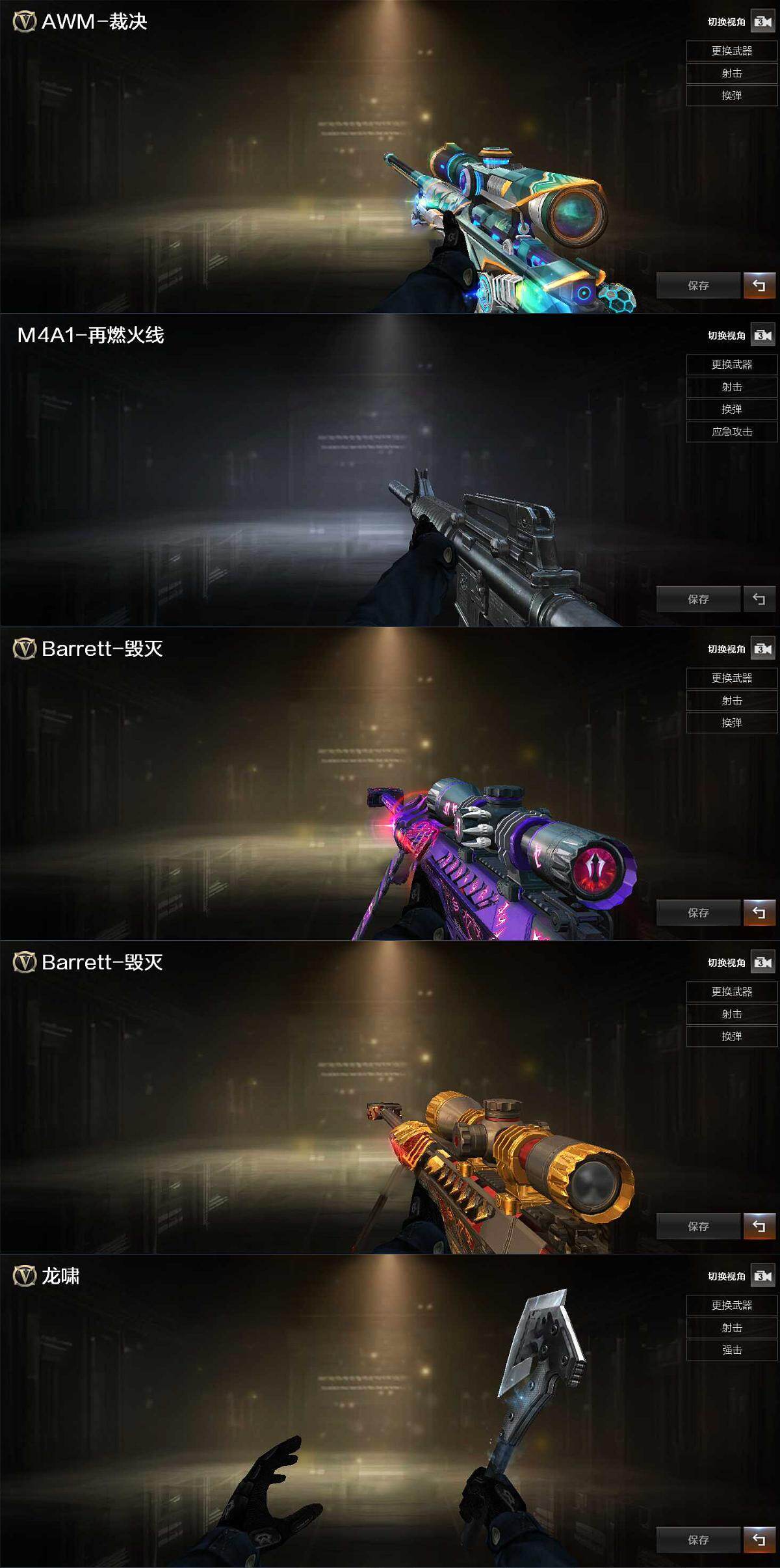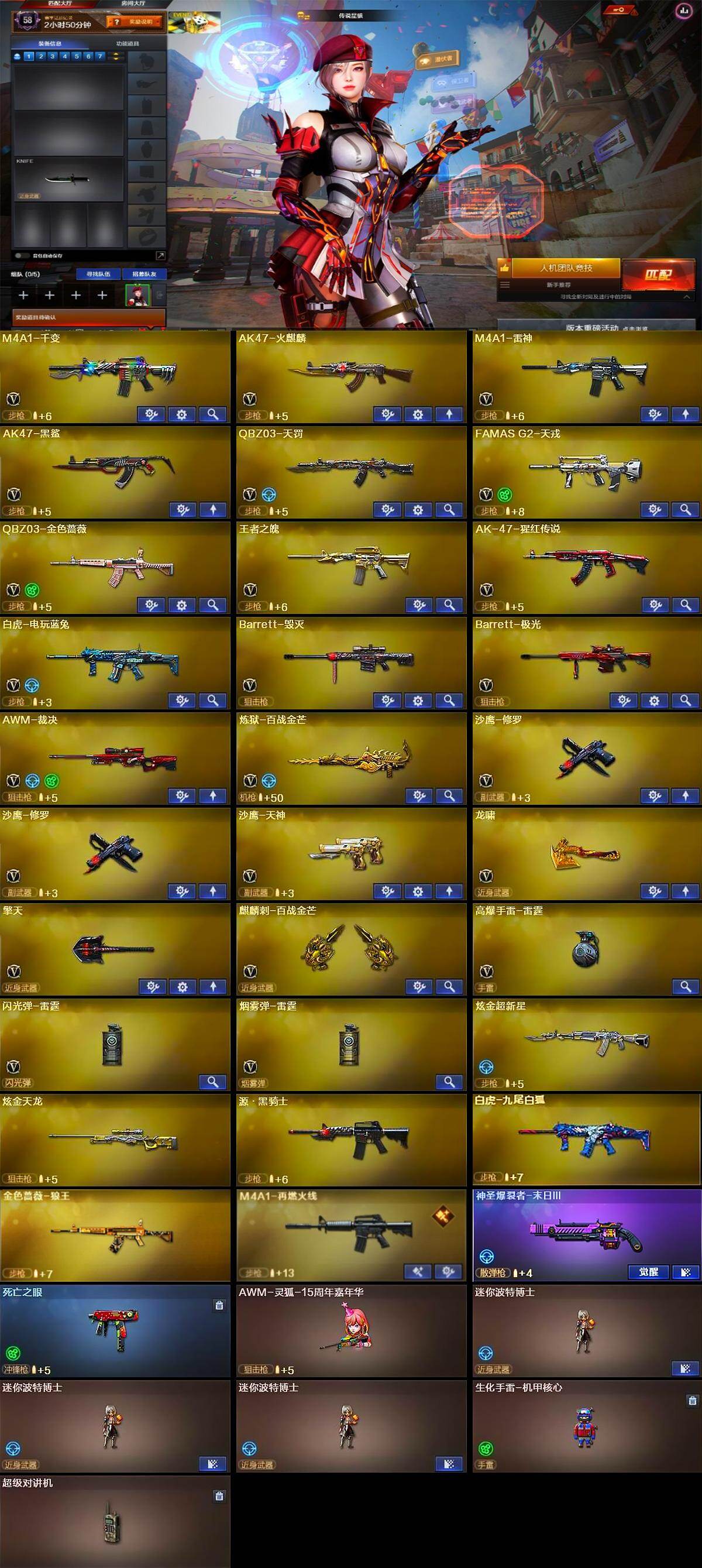 【英雄级武器】:M4A1-千变,AK47-火麒麟,M4A1-雷神,AK47-黑鲨,QBZ03-天罚,FAMAS G2-天戎,QBZ03-金色蔷薇,王者之魄-觉醒版,AK-47-猩红传说,白虎-电玩蓝兔,Barrett-毁灭,Barrett-极光,AWM-裁决,炼狱-百战金芒,沙鹰-修罗*2,沙鹰-天神,龙啸,擎天,麒麟刺-百战金芒,高爆手雷-雷霆,闪光弹-雷霆,烟雾弹-雷霆