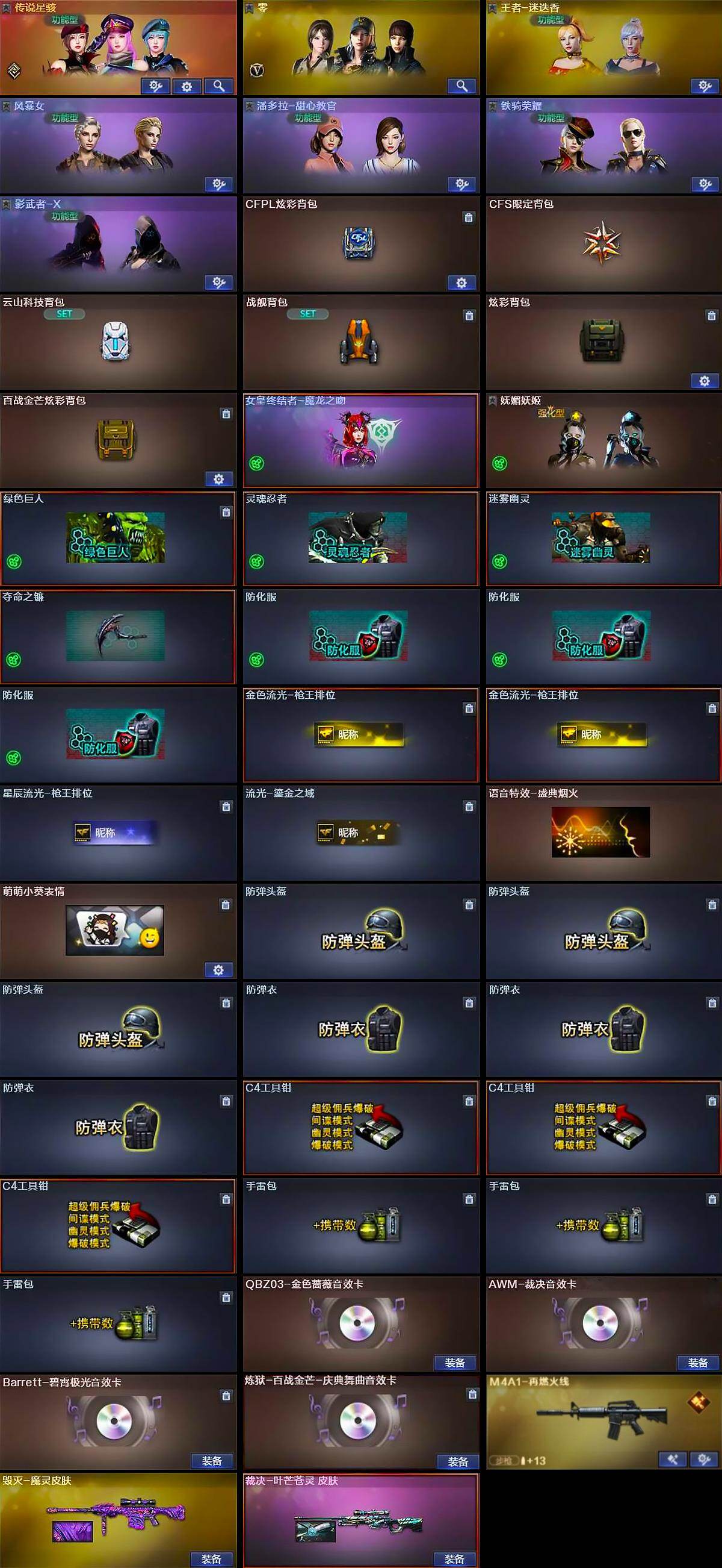 【道具】:CFPL炫彩背包,CFS限定背包,云山科技背包,战舰背包,炫彩背包,百战金芒炫彩背包,女皇终结者-魔龙之吻,妩媚妖姬,绿色巨人,灵魂忍者,迷雾幽灵,夺命之镰,防化服*3,金色流光-枪王排位*2,星辰流光-枪王排位,流光-鎏金之域,语音特效-盛典烟火,萌萌小葵表情,防弹头盔*3,防弹衣*3,C4工具钳*3,手雷包*3