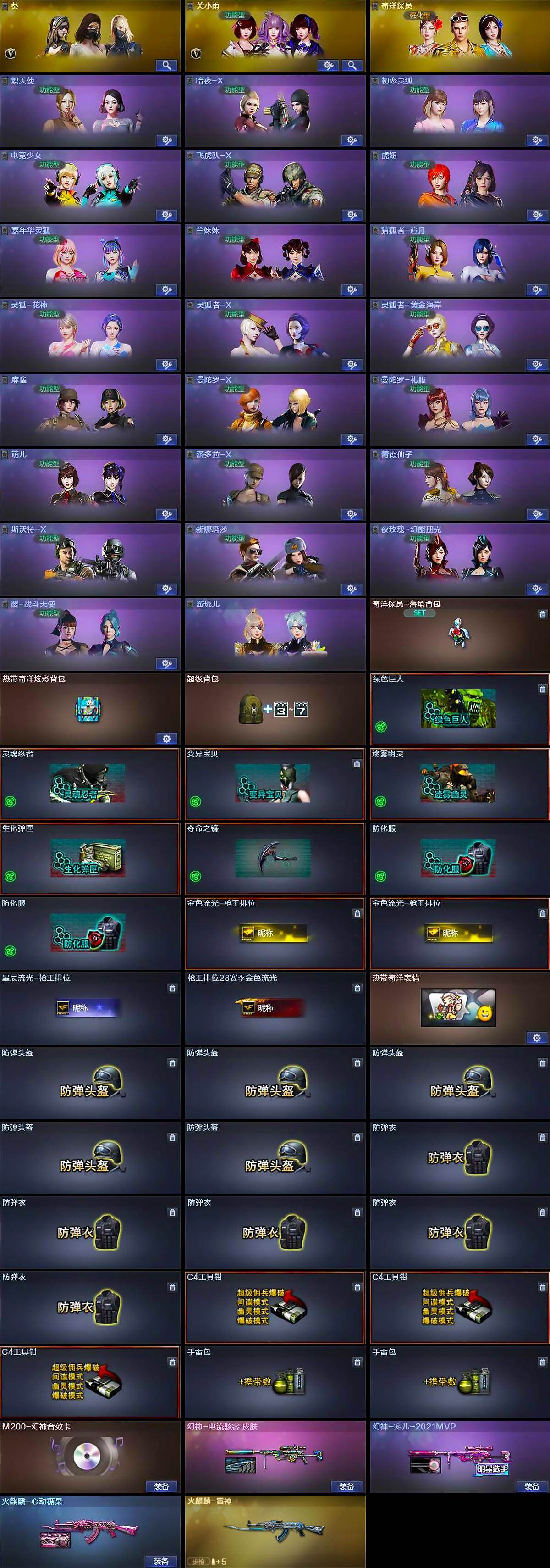 【道具】:奇洋探员-海龟背包,热带奇洋炫彩背包,超级背包,绿色巨人,灵魂忍者,变异宝贝,迷雾幽灵,生化弹匣,夺命之镰,防化服*2,金色流光-枪王排位*2,星辰流光-枪王排位,枪王排位28赛季金色流光,热带奇洋表情,防弹头盔*5,防弹衣*5,C4工具钳*3,手雷包*2