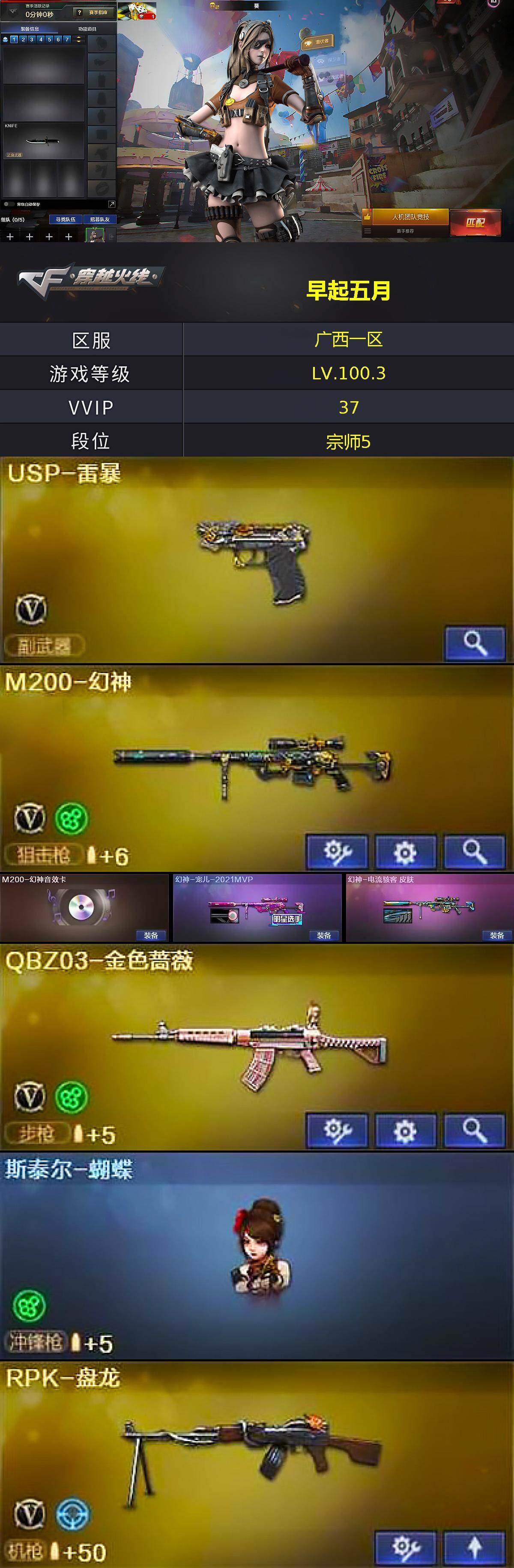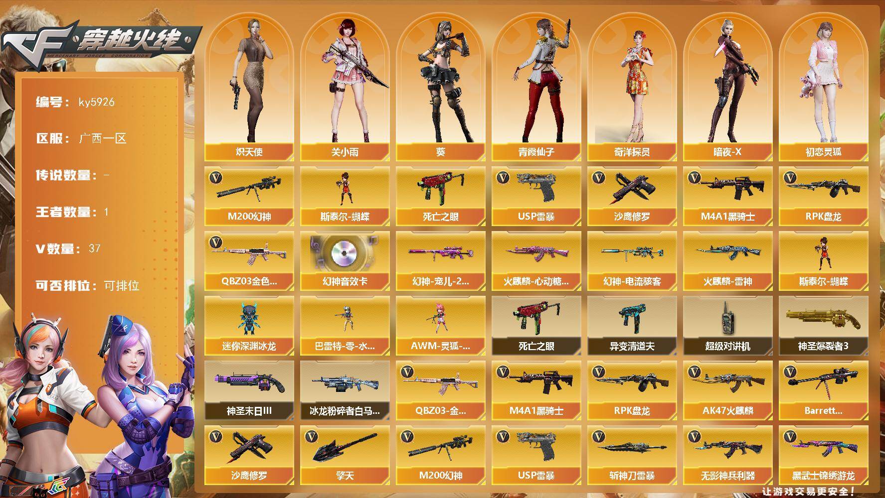 [17074362]广西一区-36V-1王者武器数-0炫金武器数 【热门武器】:QBZ03-金色蔷薇,M200-幻神,死亡之眼,M4A1-黑骑士,RPK-盘龙,斯泰尔-蝴蝶,USP-雷暴,沙鹰-修罗 【音效卡】:M200-幻神音效卡 【皮肤】:幻神-宠儿-2021MVP,幻神-电流骇客 皮肤,火麒麟-雷神,火麒麟-心动糖果 【角色】:葵,关小雨,奇洋探员,炽天使,暗夜-X,初恋灵狐,电竞少女,飞虎队-X,虎妞,嘉年华灵狐,兰妹妹,猎狐者-追月,灵狐-花神,灵狐者-X,灵狐者-黄金海岸,麻雀,曼陀罗-X,曼陀罗-礼服,萌儿,潘多拉-X,青霞仙子,斯沃特-X,兔囡囡,新娜塔莎,夜玫瑰-幻能朋克,樱-战斗天使,游珑儿 【人偶武器】:斯泰尔-蝴蝶,巴雷特-零-水下丽影,AWM-灵狐-15周年嘉年华,迷你深渊冰龙 【暴走生化】:异变清道夫,死亡之眼,超级对讲机 【挑战大师】:神圣爆裂者III*3,冰龙粉碎者-白马银枪,神圣爆裂者-末日III 【英雄级武器】:AK47-火麒麟,M4A1-黑骑士,无影-神兵利器,黑武士-锦绣游龙,超新星-热带奇洋,QBZ03-金色蔷薇,王者之武-觉醒版,AK-47-猩红传说,黑骑士-海王,Barrett-毁灭,M200-幻神,RPK-盘龙,沙鹰-修罗,USP-雷暴,擎天,龙啸-热带奇洋,斩神刀-雷暴,高爆手雷-雷暴*4,高爆手雷-云龙,手雷-热带奇洋,闪光弹-雷暴*5,闪光弹-云龙,烟雾弹-雷暴*5,烟雾弹-云龙 【道具】:奇洋探员-海龟背包,热带奇洋炫彩背包,超级背包,绿色巨人,灵魂忍者,变异宝贝,迷雾幽灵,生化弹匣,夺命之镰,防化服*2,金色流光-枪王排位*2,星辰流光-枪王排位,枪王排位28赛季金色流光,热带奇洋表情,防弹头盔*5,防弹衣*5,C4工具钳*3,手雷包*2 【特殊枪械】:蝴蝶斯泰尔+0烈龙,1黑骑士,1盘龙,1蝴蝶斯泰尔