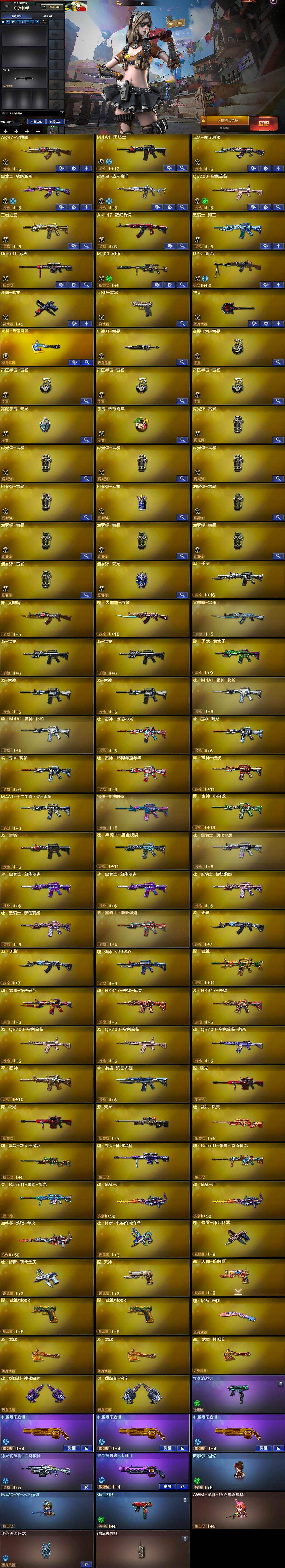 - [16944592]黑龙江区-17V-0王者武器数-0炫金武器数 【热门武器】:M200-幻神 【皮肤】:M4A1-再燃火线,AK47-火麒麟-百城23冠军皮肤,轻型军用手斧-再燃火线 【角色】:隼,战地猎狐,乔伊教练,芳心审判者,风暴女,曼陀罗-X,潘多拉-甜心教官,新娜塔莎 【人偶武器】:加特林-机械猎手,迷你牛牛,迷你火种,生化手雷-机甲核心*2,深渊终结者手雷 【挑战大师】:试炼破坏者III,阐释者III 【英雄级武器】:黑骑士-海王,M200-幻神,麒麟刺-百战金芒,M4A1-赤狱骑士 【道具】:BS战队炫彩背包,亚洲杯纪念炫彩背包,冰冰企鹅背包,百战金芒炫彩背包,超级背包,女皇终结者-魔龙之吻,救世主-黑桃战神,黄金生化钩,绿色巨人,灵魂忍者*2,变异宝贝,迷雾幽灵*2,夺命之镰*2,防化服*3,流光-再燃火线,枪王排位29赛季金色流光,语音特效-盛典烟火,萌萌小葵表情,云海游龙表情,防弹头盔*3,防弹衣*3,C4工具钳*3,手雷包*3 【特殊枪械】: