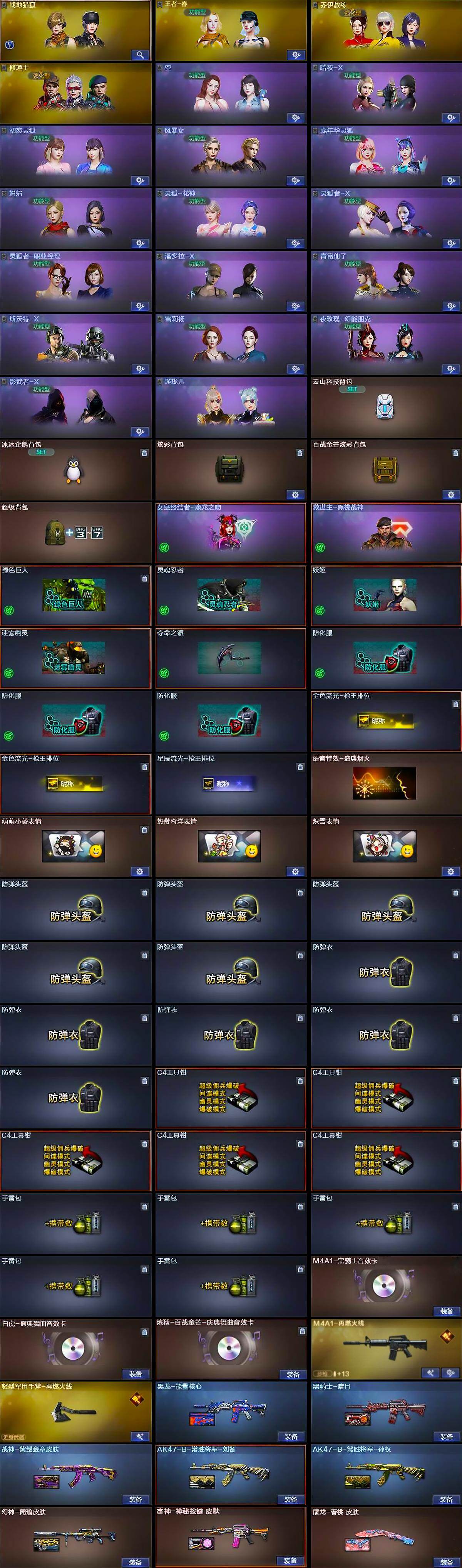 【道具】:云山科技背包,冰冰企鹅背包,炫彩背包,百战金芒炫彩背包,超级背包,女皇终结者-魔龙之吻,救世主-黑桃战神,绿色巨人,灵魂忍者,妖姬,迷雾幽灵,夺命之镰,防化服*3,金色流光-枪王排位*2,星辰流光-枪王排位,语音特效-盛典烟火,萌萌小葵表情,热带奇洋表情,炽雪表情,防弹头盔*5,防弹衣*5,C4工具钳*5,手雷包*5