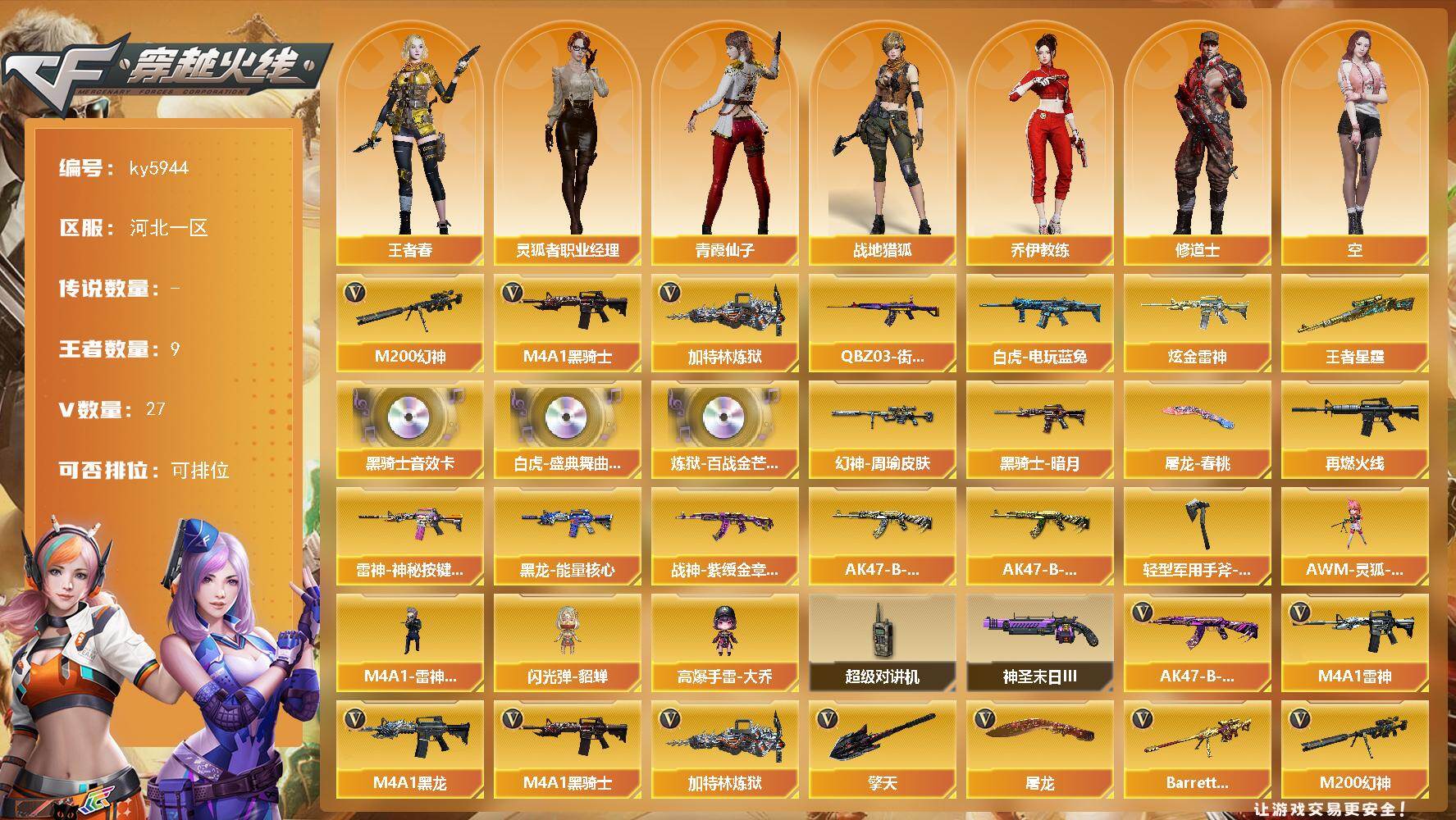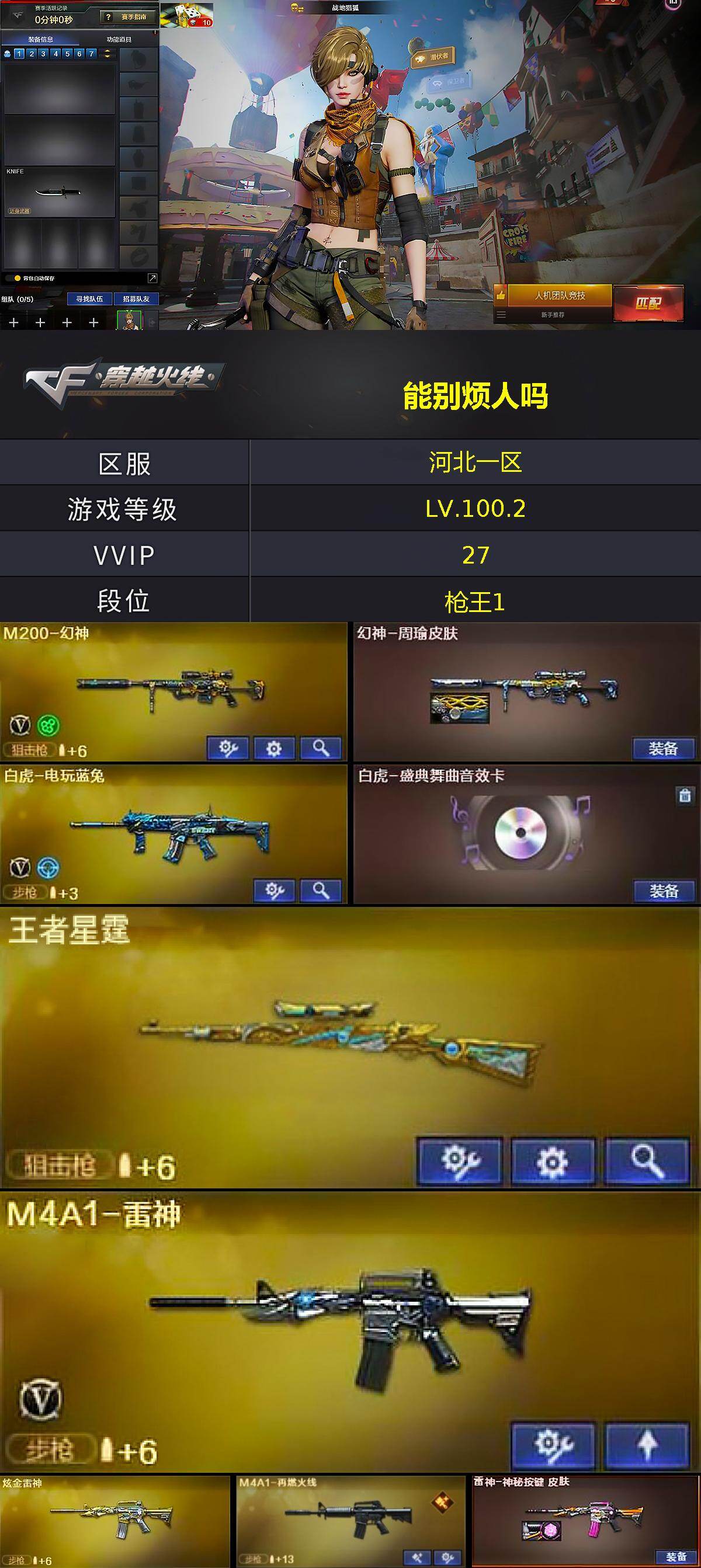 [17073616]河北一区-35V-9王者武器数-1炫金武器数 【热门武器】:M200-幻神,白虎-电玩蓝兔,QBZ03-街机,M4A1-黑骑士,加特林-炼狱 【王者炫金武器】:王者星霆,炫金雷神 【音效卡】:M4A1-黑骑士音效卡,白虎-盛典舞曲音效卡,炼狱-百战金芒-庆典舞曲音效卡 【皮肤】:幻神-周瑜皮肤,M4A1-再燃火线,雷神-神秘按键 皮肤,黑龙-能量核心,黑骑士-暗月,战神-紫绶金章皮肤,AK47-B-常胜将军-刘备,AK47-B-常胜将军-孙权,屠龙-春桃 皮肤,轻型军用手斧-再燃火线 【角色】:战地猎狐,王者春,乔伊教练,修道士,空,暗夜-X,初恋灵狐,风暴女,嘉年华灵狐,娟娟,灵狐-花神,灵狐者-X,灵狐者-职业经理,潘多拉-X,青霞仙子,斯沃特-X,雪莉杨,夜玫瑰-幻能朋克,影武者-X,游珑儿 【人偶武器】:M4A1-雷神-精英刀锋,AWM-灵狐-15周年嘉年华,闪光弹-貂蝉,高爆手雷-大乔 【暴走生化】:超级对讲机 【挑战大师】:神圣爆裂者-末日III 【英雄级武器】:M4A1-黑龙,M4A1-雷神,M4A1-黑骑士,无影-神兵利器,AK-47-猩红传说,王者火魄-觉醒版,AK47-B-常胜将军,白虎-电玩蓝兔,M200-幻神,Barrett-朱雀,加特林-炼狱,炼狱-百战金芒,屠龙*2,擎天,麒麟刺-百战金芒,闪光弹-幻灵,闪光弹-雷霆王者-觉醒版,烟雾弹-雷霆王者-觉醒版*2,M4A1-赤狱骑士 【道具】:云山科技背包,冰冰企鹅背包,炫彩背包,百战金芒炫彩背包,超级背包,女皇终结者-魔龙之吻,救世主-黑桃战神,绿色巨人,灵魂忍者,妖姬,迷雾幽灵,夺命之镰,防化服*3,金色流光-枪王排位*2,星辰流光-枪王排位,语音特效-盛典烟火,萌萌小葵表情,热带奇洋表情,炽雪表情,防弹头盔*5,防弹衣*5,C4工具钳*5,手雷包*5 【特殊枪械】:1黑骑士,1炼狱