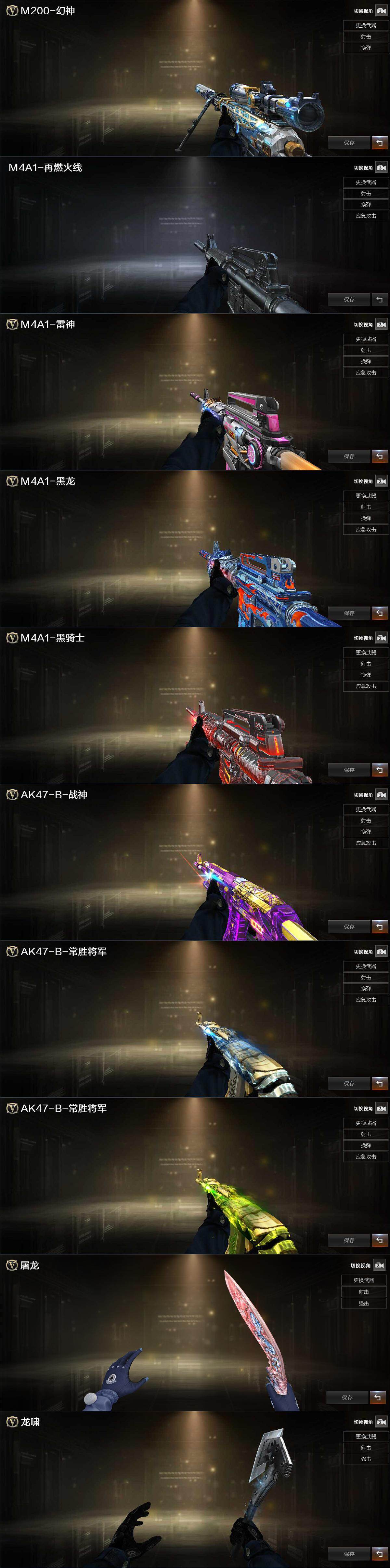 【皮肤】:幻神-周瑜皮肤,M4A1-再燃火线,雷神-神秘按键 皮肤,黑龙-能量核心,黑骑士-暗月,战神-紫绶金章皮肤,AK47-B-常胜将军-刘备,AK47-B-常胜将军-孙权,屠龙-春桃 皮肤,轻型军用手斧-再燃火线