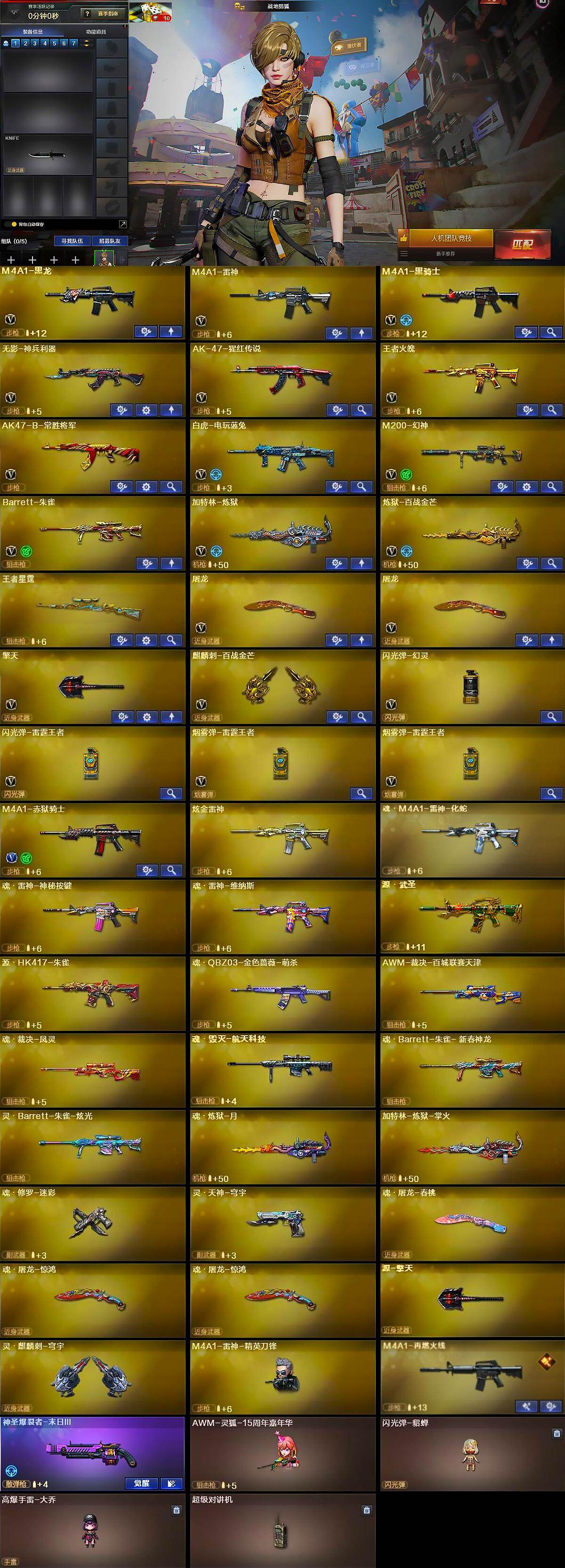 【英雄级武器】:M4A1-黑龙,M4A1-雷神,M4A1-黑骑士,无影-神兵利器,AK-47-猩红传说,王者火魄-觉醒版,AK47-B-常胜将军,白虎-电玩蓝兔,M200-幻神,Barrett-朱雀,加特林-炼狱,炼狱-百战金芒,屠龙*2,擎天,麒麟刺-百战金芒,闪光弹-幻灵,闪光弹-雷霆王者-觉醒版,烟雾弹-雷霆王者-觉醒版*2,M4A1-赤狱骑士
