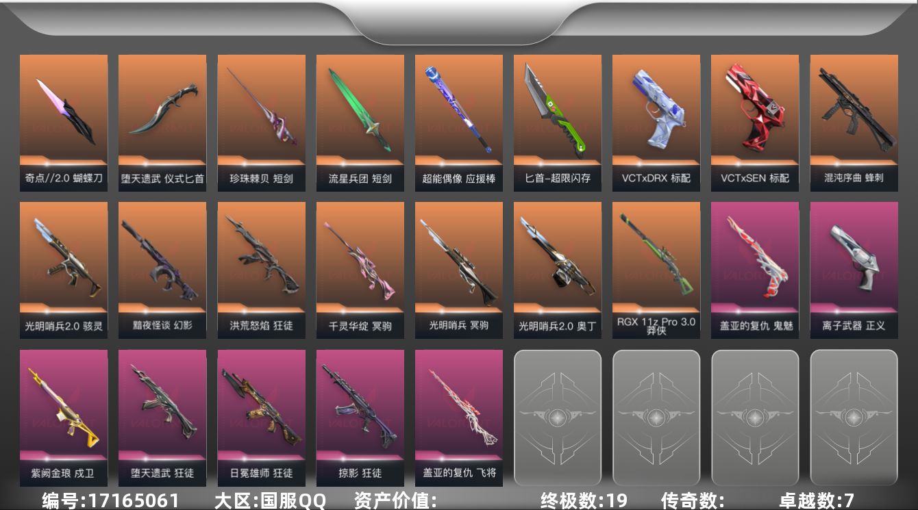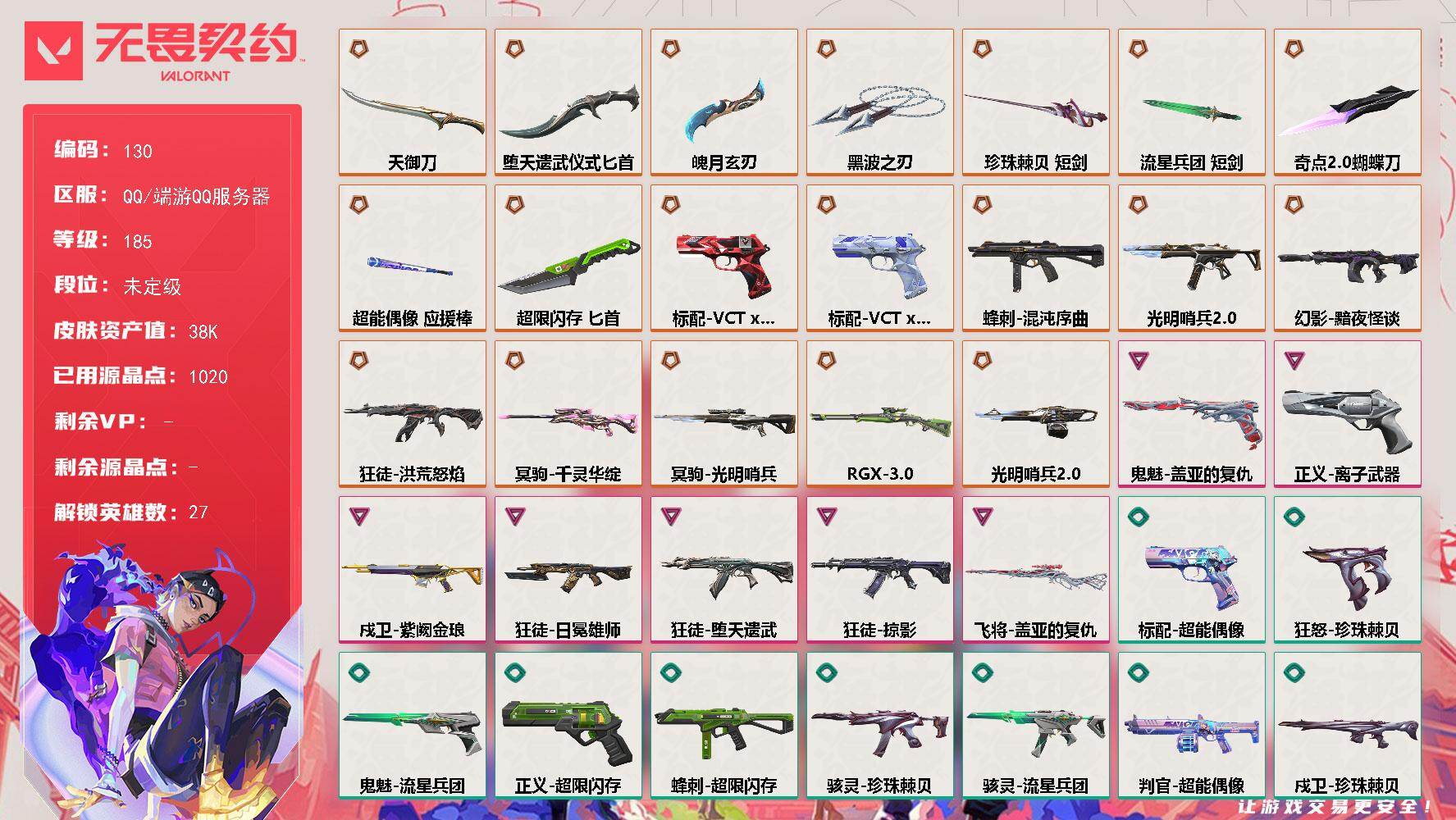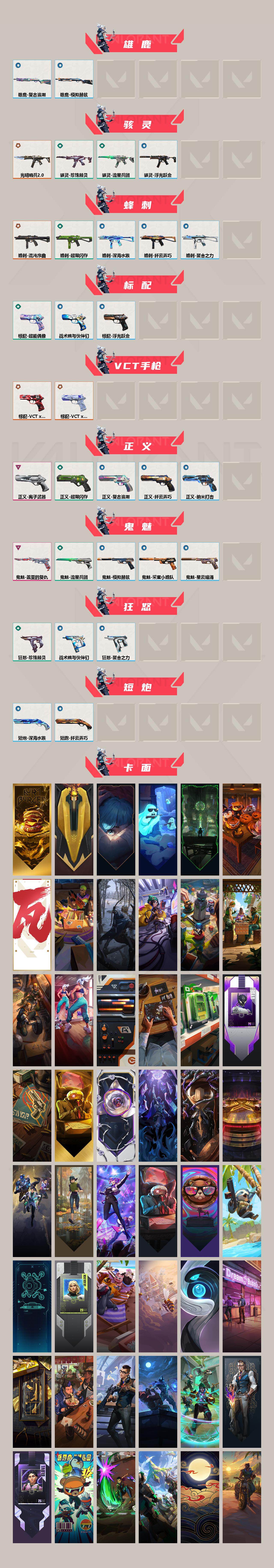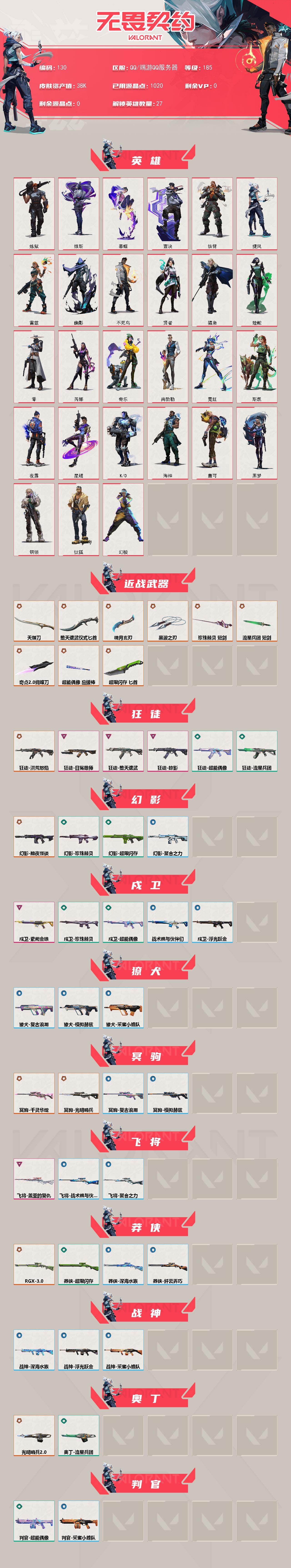 [17165061]【130】【英雄】:幻棱,炼狱,维斯,暮蝶,钛狐,壹决,铁臂,捷风,雷兹,幽影,不死鸟,贤者,猎枭,蝰蛇,零,芮娜,奇乐,尚勃勒,霓虹,斯凯,夜露,星礈,K/O,海神,盖可,黑梦,钢锁 【近战武器】:近战武器-奇点//2.0 蝴蝶刀,近战武器-黑波之刃,近战武器-珍珠棘贝 短剑,近战武器-流星兵团 短剑,近战武器-超能偶像 应援棒,近战武器-超限闪存 匕首,近战武器-堕天遗武 仪式匕首,近战武器-魄月玄刃,近战武器-天御刀 【狂徒】:狂徒-洪荒怒焰,狂徒-堕天遗武,狂徒-掠影,狂徒-日冕雄师,狂徒-超能偶像,狂徒-流星兵团 【幻影】:幻影-黯夜怪谈,幻影-超限闪存,幻影-珍珠棘贝,幻影-聚合之力 【戍卫】:戍卫-紫阙金琅,戍卫-超能偶像,戍卫-珍珠棘贝,戍卫-浮光跃金,戍卫-战术熊与伙伴们 【獠犬】:獠犬-采蜜小蜂队,獠犬-复古浪潮,獠犬-模拟赫兹 【冥驹】:冥驹-光明哨兵,冥驹-千灵华绽,冥驹-复古浪潮,冥驹-模拟赫兹 【飞将】:飞将-盖亚的复仇,飞将-聚合之力,飞将-战术熊与伙伴们 【莽侠】:莽侠-RGX 11z Pro//3.0,莽侠-超限闪存,莽侠-深海水族,莽侠-纤云弄巧 【战神】:战神-采蜜小蜂队,战神-浮光跃金,战神-深海水族 【奥丁】:奥丁-光明哨兵//2.0,奥丁-流星兵团 【判官】:判官-超能偶像,判官-采蜜小蜂队 【雄鹿】:雄鹿-复古浪潮,雄鹿-模拟赫兹 【骇灵】:骇灵-光明哨兵//2.0,骇灵-流星兵团,骇灵-珍珠棘贝,骇灵-浮光跃金 【蜂刺】:蜂刺-混沌序曲,蜂刺-超限闪存,蜂刺-聚合之力,蜂刺-深海水族,蜂刺-纤云弄巧 【标配】:标配-超能偶像,标配-浮光跃金,标配-战术熊与伙伴们 【VCT手枪】:标配-VCT x DRX,标配-VCT x SEN 【正义】:正义-离子武器,正义-超限闪存,正义-复古浪潮,正义-纳米打击,正义-纤云弄巧 【鬼魅】:鬼魅-盖亚的复仇,鬼魅-流星兵团,鬼魅-采蜜小蜂队,鬼魅-模拟赫兹,鬼魅-星云暗涌 【狂怒】:狂怒-珍珠棘贝,狂怒-聚合之力,狂怒-战术熊与伙伴们 【短炮】:短炮-深海水族,短炮-纤云弄巧 【卡面】:终章:激斗汉堡 卡面,进入射程 卡面,《双城之战》拥抱 卡面,精灵大战 卡面,欢迎来到底城 卡面,南瓜盛典 卡面,VCT CN首冠 卡面,唱片的故事 卡面,钢弓与箭弦 卡面,排除故障 卡面,战术桌