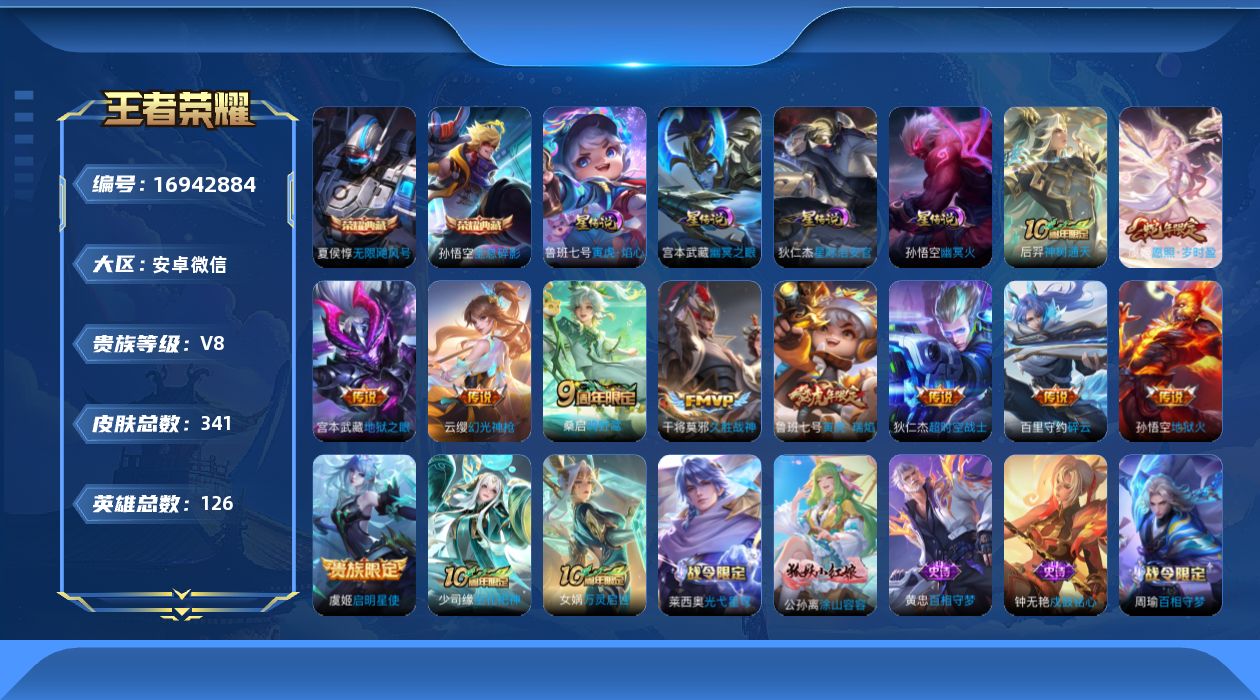 [16942884]安卓WX-V8-最强王者段位-126英雄-341皮肤-2典藏皮肤-11传说-94史诗-3星传-发育路44段
