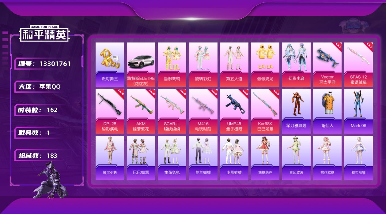 [13301761]【1428】苹果 手Q-5粉装-8特效枪-1载具-0粉色飞行器-60791热力值-12王牌印记-162套装-183枪皮 【热门品类】:套装-派对舞王,角色-军刀雅典娜,套装-龟仙人,角色-Mark.06 【粉色载具】:路特斯ELETRE(花绽灰) 【粉色套装】:粉装-垂柳戏鸭,粉装-旋转彩虹,粉装-第五大道,粉装-傲傲奶龙,粉装-幻彩电音 【粉色枪皮等级】:AKM-绿萝繁花(五级),SCAR-L-锦绣绵绵(五级),M416-电玩时刻(五级),UMP45-量子极限(五级),Vector-环太平洋(七级),Kar98K-巳巳如意(五级),SPAS-12-蜜语绒猫(七级),DP-28-豹影疾电(五级) 【粉色枪皮】:AKM-绿萝繁花,SCAR-L-锦绣绵绵,M416-电玩时刻,UMP45-量子极限,Vector-环太平洋,Kar98K-巳巳如意,SPAS-12-蜜语绒猫,DP-28-豹影疾电 【粉色降落伞】:环太平洋降落伞,旋转彩虹降落伞,猪猪侠降落伞,精灵梦叶罗丽降落伞,精灵之光降落伞,千金淑猫降落伞,星穹咏叹调降落伞,幻彩电音降落伞,荧海星豚降落伞 【稀有套装】:套装-龟仙人,套装-绒宝小鹅,套装-巳巳如意,套装-雏菊兔兔,套装-萝兰蝴蝶,套装-小熊娃娃,套装-糖糖葫芦,套装-青团波波,套装-棉花软糖,角色-都市丽猫,角色-摩登魅猫,套装-燕燕于飞,套装-鱼渊荷华,角色-风玲,套装-粉恋花,套装-紫幽梦,套装-蓝冰羽,套装-极速光影,套装-彩虹兔,套装-云朵鹅,套装-雪绒豹,套装-蜜露汐语,套装-蓝海鲸歌 【稀有枪皮】:AKM-灼热熔岩,AKM-环太平洋,AKM-霓虹街区,AKM-龙的传人,M16A4-幻世战舞者,M16A4-千金淑猫,SCAR-L-玉兔迎春,SCAR-L-红色方程式,M416-糯团青竹,M416-蓝色火焰,GROZA-彩虹符号,GROZA-生命誓言,GROZA-田园牧歌,GROZA-荧海星豚,AUG-天降萌叽,AUG-甜蜜菠萝,AUG-耀粉歌者,M762-天降萌叽,M762-牛气冲天,M762-第五大道,M762-云朵鹅,Mk47-妙红点点,G36C-星穹咏叹调,AC-VAL-天降萌叽,AC-VAL-快闪甜心,蜜獾-天降萌叽,蜜獾-娇憨猪猪,UZI-啾咪啾咪,UZI-天降萌叽,UZI-娇憨猪猪,UMP45-涂山之恋,UMP45-生命誓言,UMP45