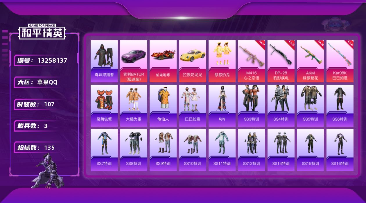 [13258137]【1515】苹果 手Q-1粉装-4特效枪-3载具-1粉色飞行器-44914热力值-14王牌印记-107套装-135枪皮 【热门品类】:套装-奇异狩猎者,套装-龟仙人 【粉色载具】:宾利BATUR(极速紫),焰龙咆哮,拉轰奶龙龙 【粉色套装】:粉装-憨憨奶龙 【粉色枪皮等级】:AKM-绿萝繁花(五级),M416-心之恋语(七级),Kar98K-巳巳如意(四级),DP-28-豹影疾电(五级) 【粉色枪皮】:AKM-绿萝繁花,M416-心之恋语,Kar98K-巳巳如意,DP-28-豹影疾电 【粉色飞行器】:萌酷奶龙飞行器 【粉色降落伞】:圣堂之誓降落伞 【稀有套装】:套装-龟仙人,套装-巳巳如意,角色-风玲 【稀有枪皮】:AKM-冰凉西瓜,AKM-夜灯,AKM-彩虹符号,AKM-灼热熔岩,AKM-生命誓言,AKM-破晓战魂,AKM-虎虎生威,AKM-霓虹街区,AKM-龙的传人,M16A4-幻世战舞者,M16A4-红色方程式,M16A4-蓝色火焰,SCAR-L-炫彩节奏,SCAR-L-玉兔迎春,SCAR-L-生命誓言,SCAR-L-红色方程式,SCAR-L-黄金龙骨,M416-夜灯,M416-糯团青竹,M416-红色方程式,M416-蓝色火焰,GROZA-异彩先驱,AUG-天降萌叽,AUG-幻影战神,AUG-耀粉歌者,QBZ-彩虹符号,QBZ-洛神天依,M762-天降萌叽,M762-彩虹甜喵,M762-瑞龙福将,M762-生命誓言,M762-风花雪月,G36C-金风玉露,AC-VAL-天降萌叽,AC-VAL-彩虹甜喵,蜜獾-天降萌叽,蜜獾-娇憨猪猪,UZI-啾咪啾咪,UZI-天降萌叽,UZI-娇憨猪猪,UZI-炫彩节奏,UZI-红色方程式,UMP45-涂山之恋,UMP45-生命誓言,UMP45-蓝色火焰,Vector-彩虹符号,汤姆逊-天降萌叽,汤姆逊-异彩先驱,汤姆逊-炫彩节奏,汤姆逊-耀粉歌者,野牛-青春冒险家,MP5K-异彩先驱,P90-巳巳如意,Kar98K-彩虹符号,Kar98K-王子的夏天,Kar98K-红色方程式,M24-百合蜜语,SKS-夜灯,SKS-炫彩节奏,Mini14-异彩先驱,Mini14-炫彩节奏,Mini14-耀粉歌者,Mini14-金鼠迎春,Mk14-暗星紫秘,Win94-瑞龙福将,SLR-PEC最牛战神,SLR-娇憨猪猪,M417-惊鸿侠骨