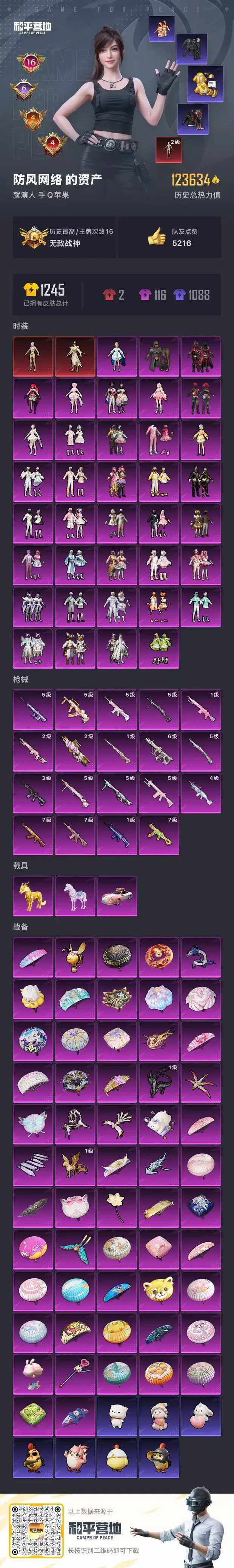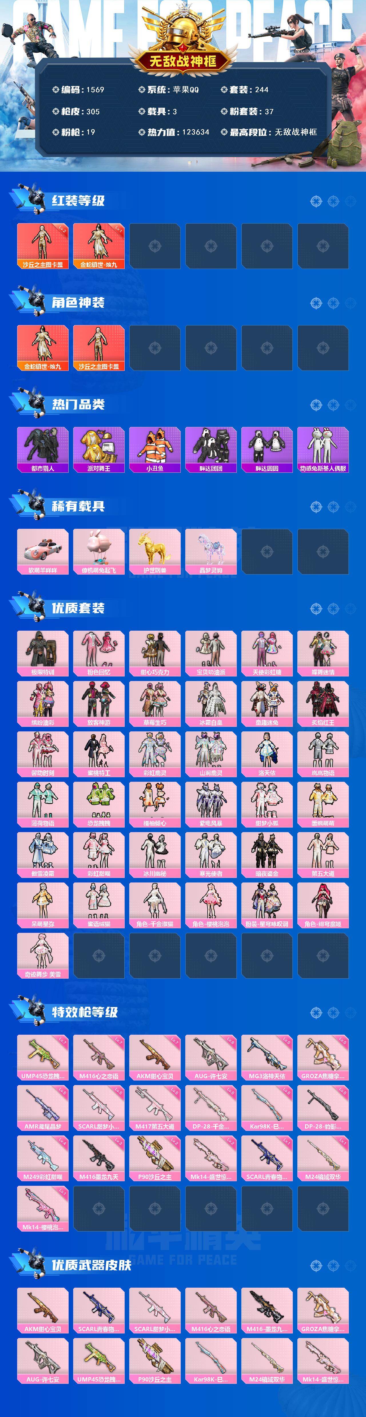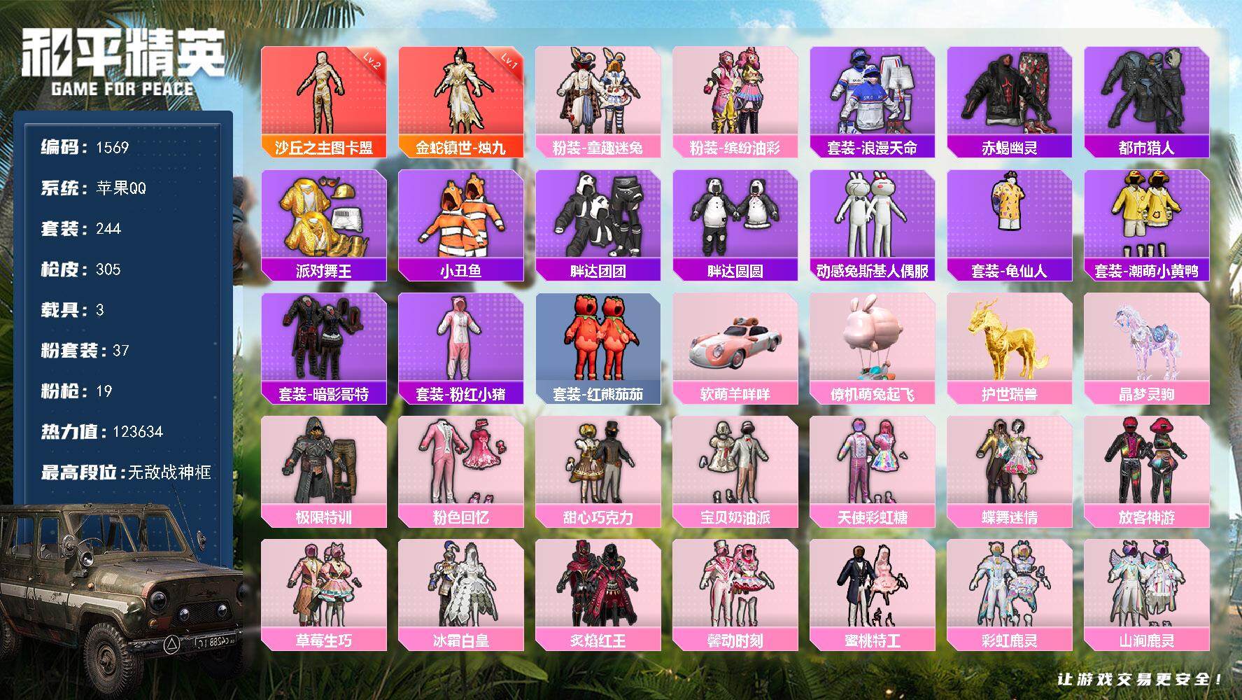 [17098857]【1569】苹果 手Q-无敌战神框-2神装-37粉装-19特效枪-3载具-14粉色飞行器-123634热力值-16王牌印记-244套装-305枪皮