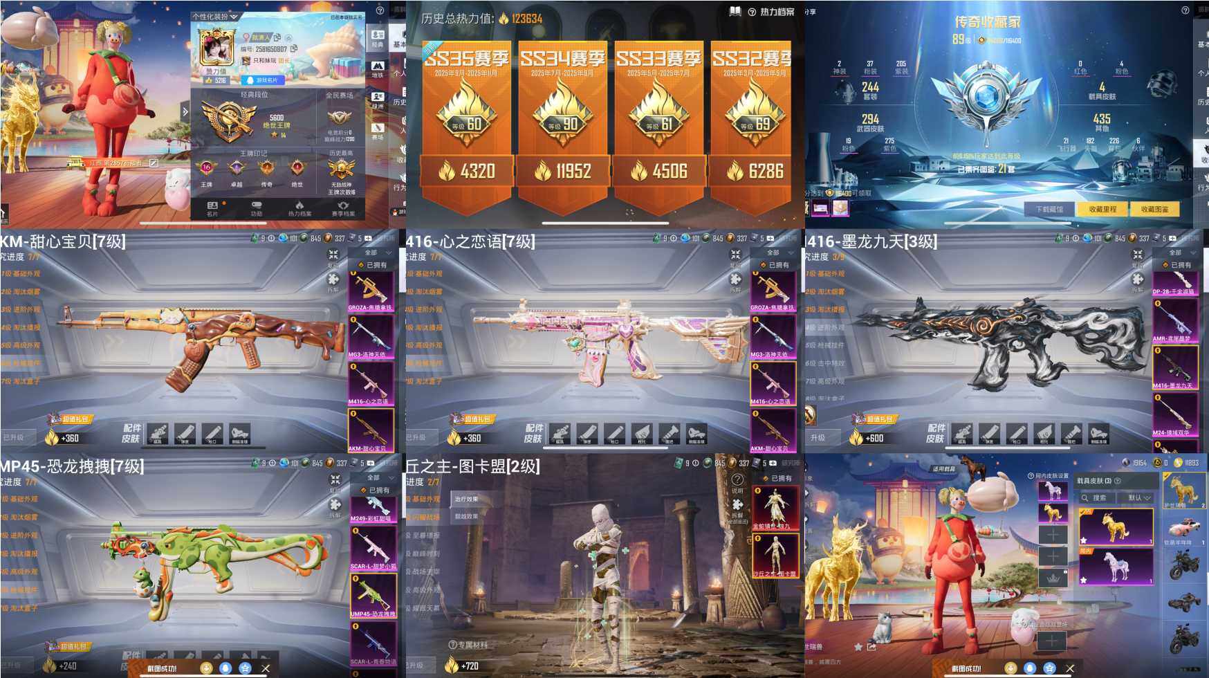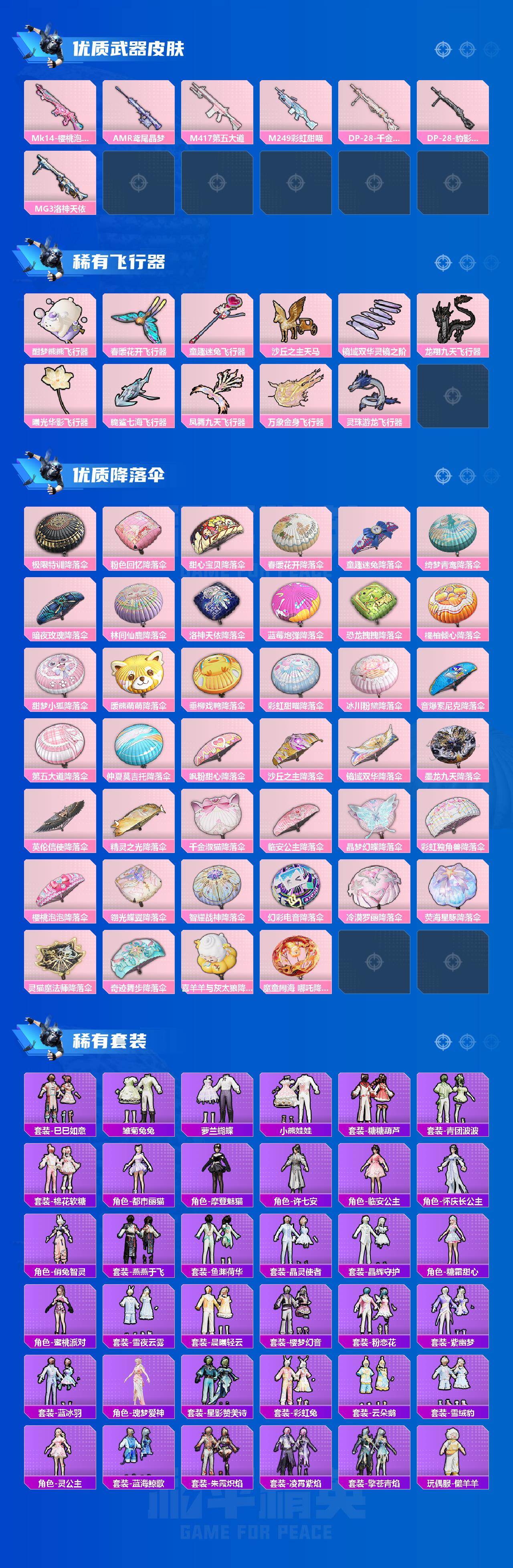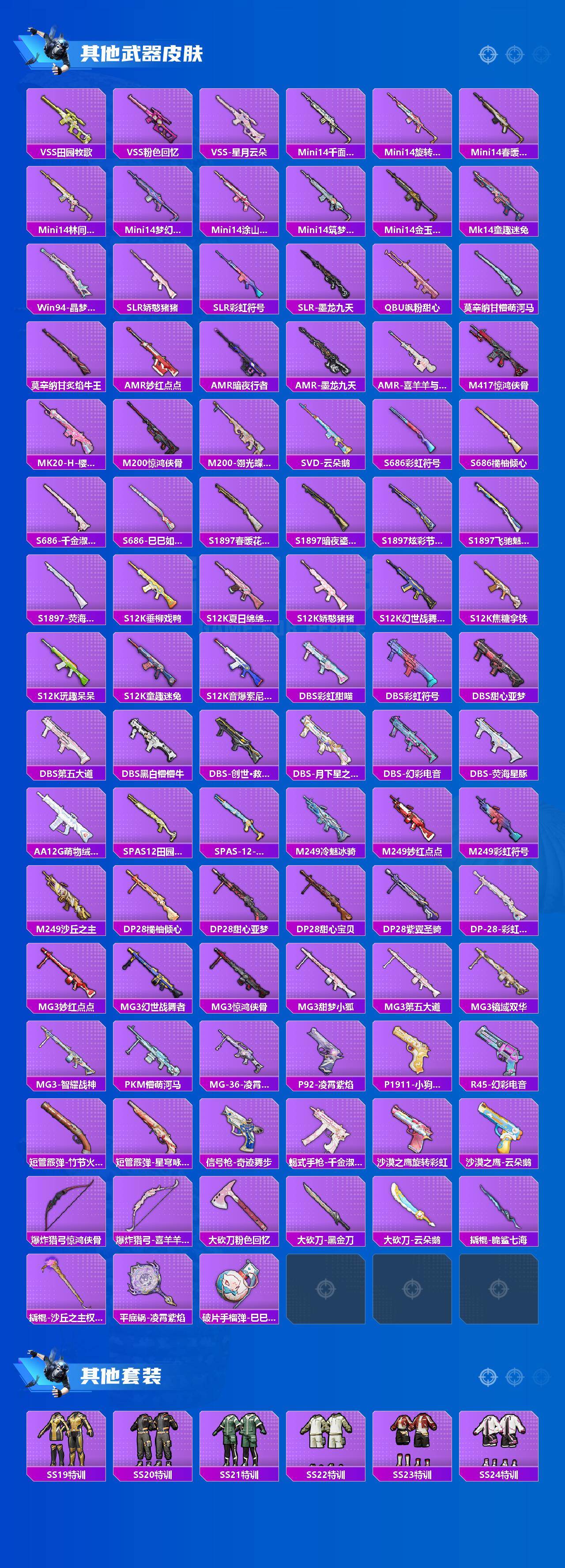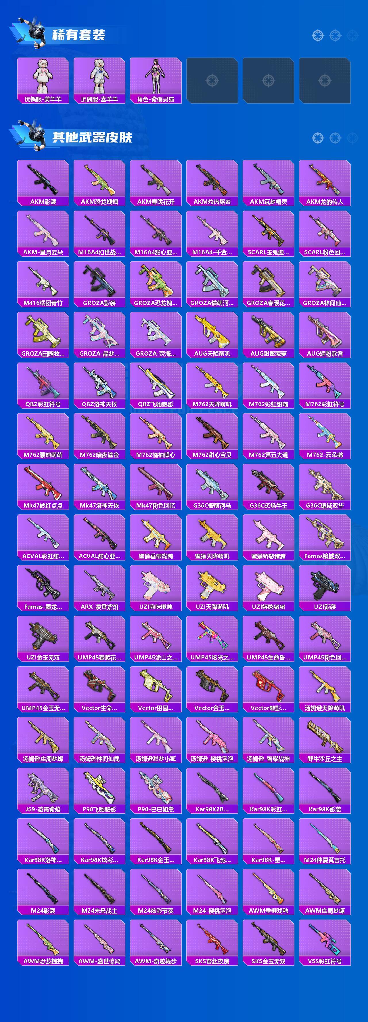AKM-甜心宝贝,SCAR-L-青春物语,SCAR-L-甜梦小狐,M416-心之恋语,M416-墨龙九天,GROZA-焦糖拿铁,AUG-许七安,UMP45-恐龙拽拽,P90-沙丘之主,Kar98K-巳巳如意,M24-镜域双华,Mk14-盛世惊鸿,Mk14-樱桃泡泡,AMR-鸢尾晶梦,M417-第五大道,M249-彩虹甜喵,DP-28-千金淑猫,MG3-洛神天依