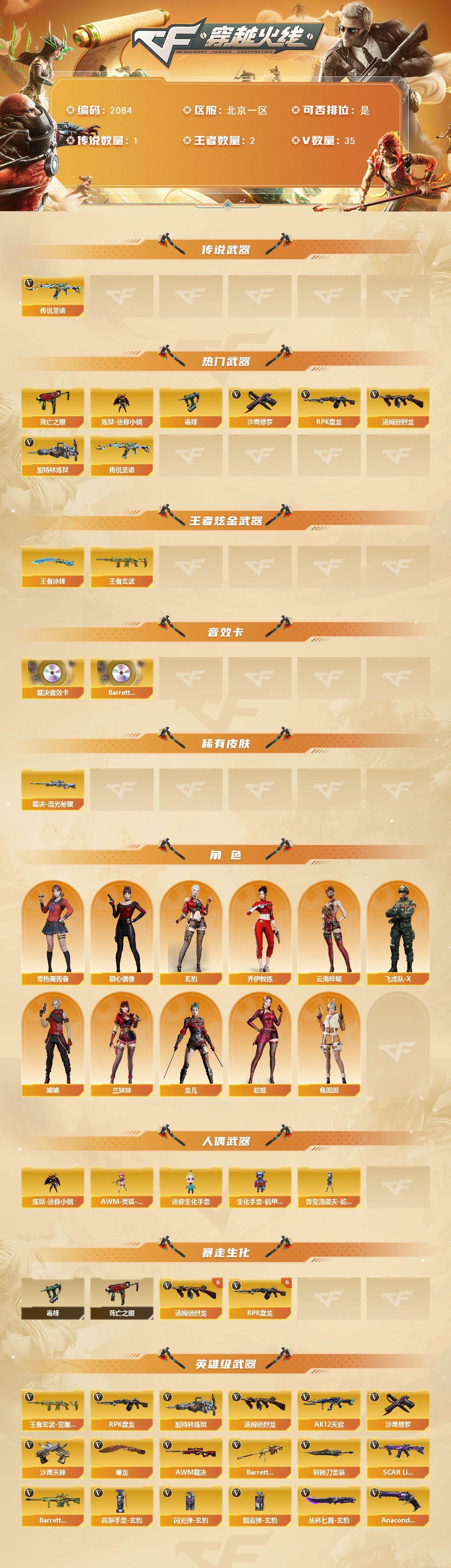- [15385542]广东一区-11V-5王者-0炫金 【热门武器】:QBZ03-金色蔷薇 【王者炫金武器】:王者之魄高爆手雷,王者之魄闪光弹*2 【皮肤】:雷神-脉冲核心,火麒麟-雷神,火麒麟-心动糖果,修罗-星空 【角色】:奇洋探员,暗夜-X,飞虎队-X,风暴女,嘉年华灵狐,兰-海滩派对,0号玩家,零-水下丽影,灵狐-花神,灵狐者-X,灵狐者-七夕宝贝,龙儿,麻雀,曼陀罗-X,萌儿,潘多拉-X,潘多拉-甜心教官,蛇姬,斯沃特-X,雪莉杨,游珑儿 【人偶武器】:AWM-灵狐-15周年嘉年华,迷你波特博士,夺魂,迷你牛牛,迷你巨石泰坦-魔花研究所 【挑战大师】:激光毁灭者III-白马银枪,神圣爆裂者-末日III*2 【英雄级武器】:M4A1-雷神,AN94-超新星,无影-神兵利器,黑武士-锦绣游龙,超新星-热带奇洋,QBZ03-金色蔷薇,沙鹰-天神,龙啸-热带奇洋,高爆手雷-幻灵,手雷-热带奇洋,闪光弹-云龙,烟雾弹-云龙,烟雾弹-雷霆王者-觉醒版 【道具】:CFS限定背包,全能枪王背包,奇洋探员-海龟背包,炫彩背包,热带奇洋炫彩背包,虎牙炫彩背包,超级背包,哔哩哔哩名片,救世主-黑桃战神,绿色巨人,迷雾幽灵,生化弹匣,夺命之镰,防化服*2,金色流光-枪王排位*2,星辰流光-枪王排位,枪王排位28赛季金色流光,枪王排位29赛季金色流光,语音特效-热带奇洋,电玩兔兔表情,热带奇洋表情,EP战队名片,EP战队喷图,EP战队击杀图标,防弹头盔*3,防弹衣*3,C4工具钳*3,手雷包*3 【特殊枪械】:
