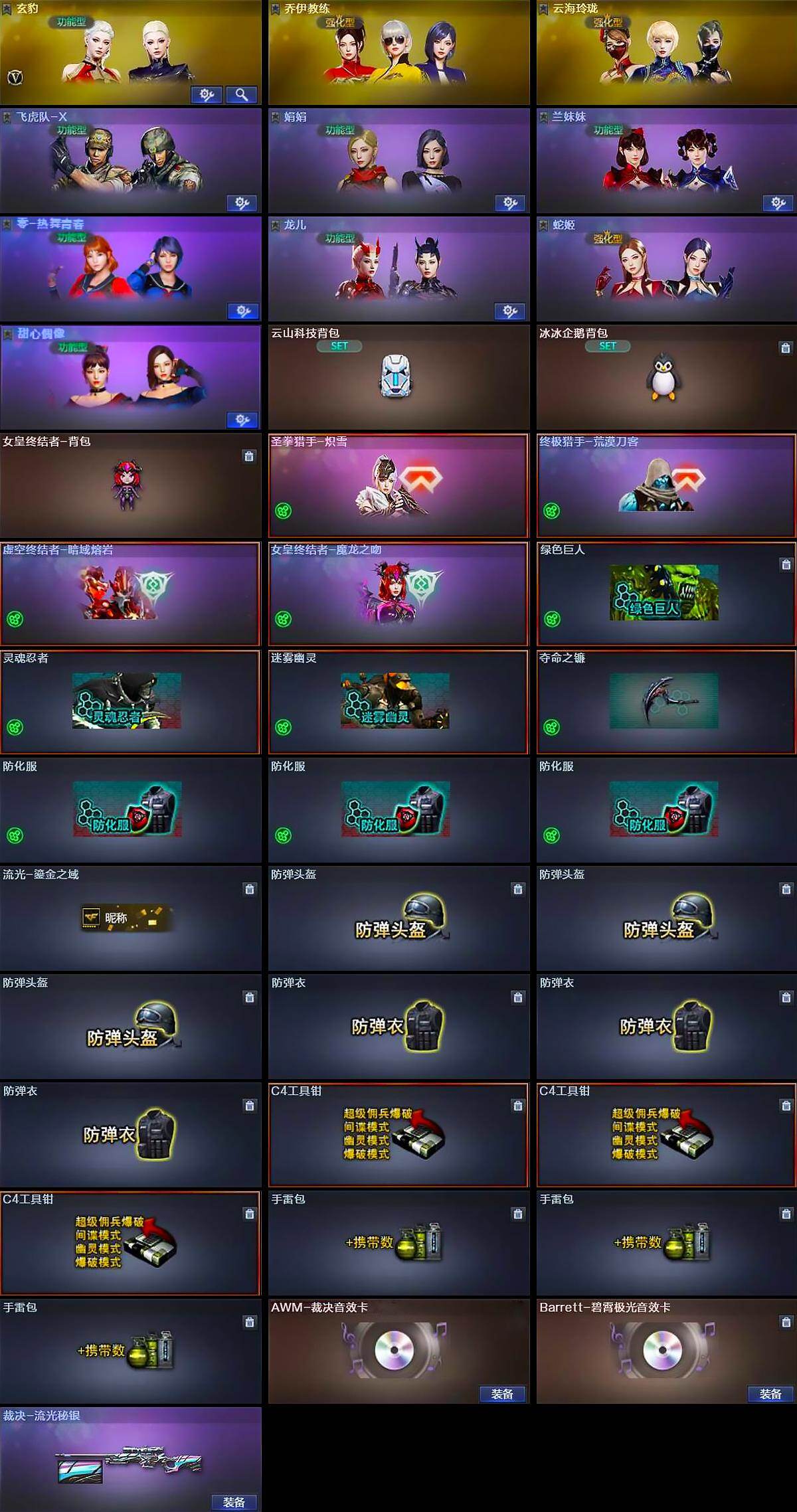 【道具】:云山科技背包,冰冰企鹅背包,女皇终结者-背包,圣拳猎手-炽雪,终极猎手-荒漠刀客,虚空终结者-暗域熔岩,女皇终结者-魔龙之吻,绿色巨人,灵魂忍者,迷雾幽灵,夺命之镰,防化服*3,流光-鎏金之域,防弹头盔*3,防弹衣*3,C4工具钳*3,手雷包*3