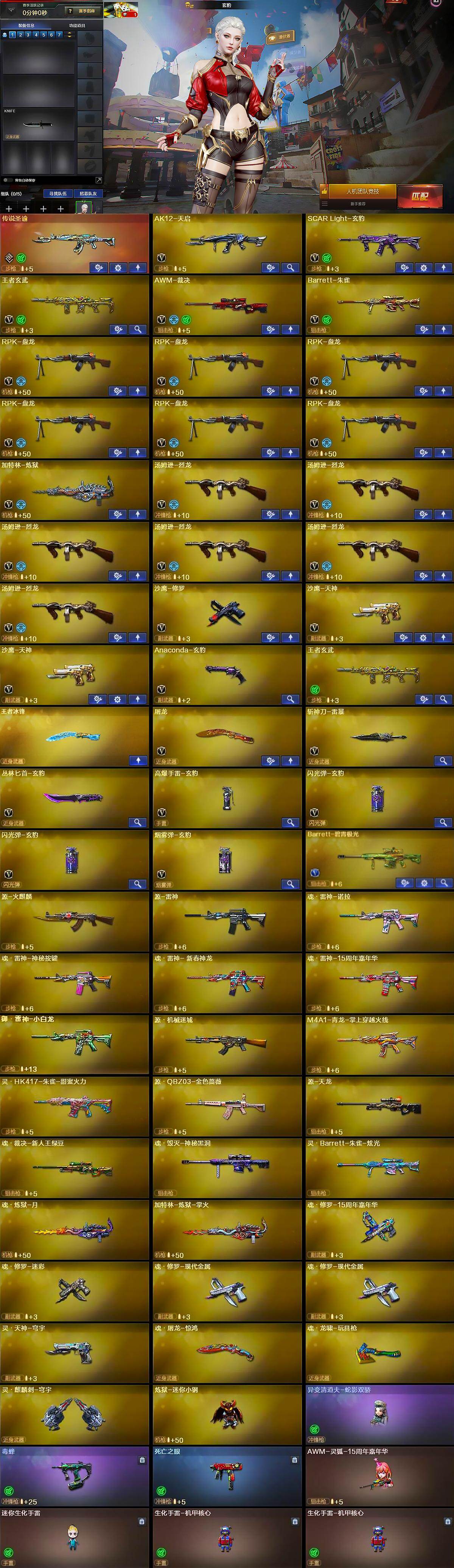 【英雄级武器】:AK12-天启,SCAR Light-玄豹,王者玄武-觉醒版,AWM-裁决,Barrett-朱雀,RPK-盘龙*6,加特林-炼狱,汤姆逊-烈龙*6,沙鹰-修罗,沙鹰-天神*2,Anaconda-玄豹,屠龙,斩神刀-雷暴,丛林匕首-玄豹,高爆手雷-玄豹,闪光弹-玄豹*2,烟雾弹-玄豹,Barrett-碧霄极光