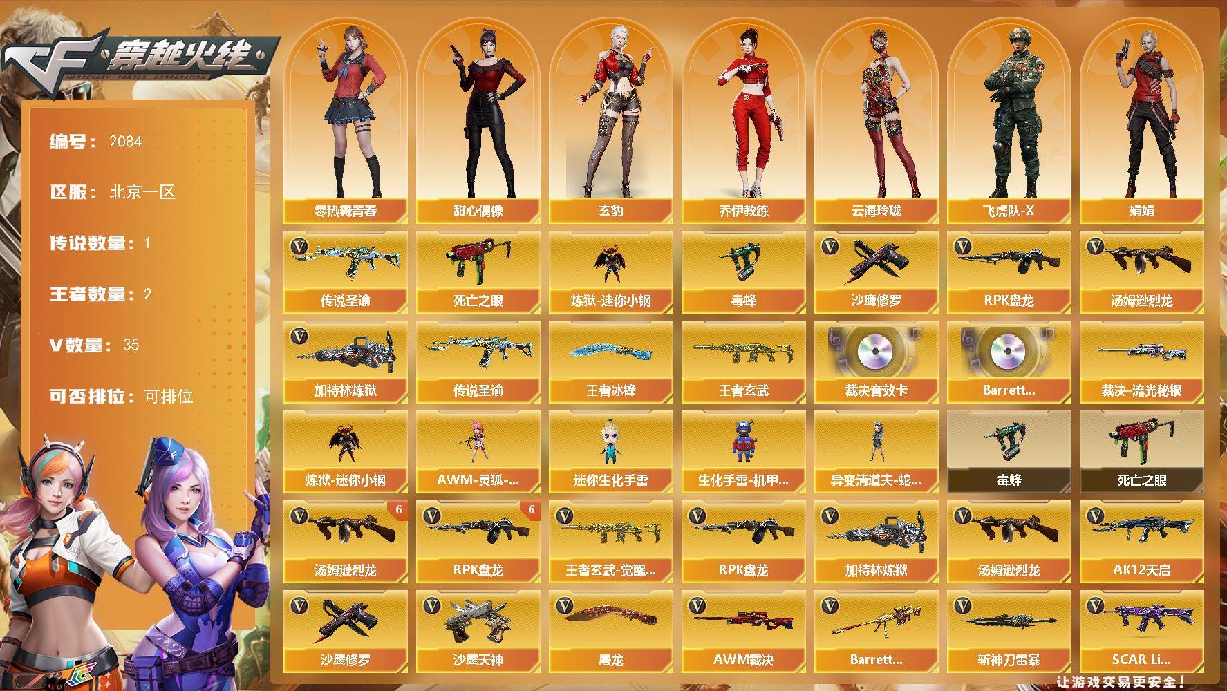 [16905221]北京一区-37V-2王者武器数-0炫金武器数 【传说武器】:传说圣谕 【热门武器】:传说圣谕,死亡之眼,炼狱-迷你小钢,毒蜂,汤姆逊-烈龙*6,RPK-盘龙*6,加特林-炼狱,沙鹰-修罗 【王者炫金武器】:王者玄武,王者冰锋 【音效卡】:AWM-裁决音效卡,Barrett-碧霄极光音效卡 【皮肤】:裁决-流光秘银 【角色】:玄豹,乔伊教练,云海玲珑,飞虎队-X,娟娟,兰妹妹,零-热舞青春,龙儿,蛇姬,甜心偶像,兔囡囡 【人偶武器】:炼狱-迷你小钢,异变清道夫-蛇影双骄,AWM-灵狐-15周年嘉年华,迷你生化手雷,生化手雷-机甲核心*2 【暴走生化】:毒蜂,死亡之眼 【英雄级武器】:AK12-天启,SCAR Light-玄豹,王者玄武-觉醒版,AWM-裁决,Barrett-朱雀,RPK-盘龙*6,加特林-炼狱,汤姆逊-烈龙*6,沙鹰-修罗,沙鹰-天神*2,Anaconda-玄豹,屠龙,斩神刀-雷暴,丛林匕首-玄豹,高爆手雷-玄豹,闪光弹-玄豹*2,烟雾弹-玄豹,Barrett-碧霄极光 【道具】:云山科技背包,冰冰企鹅背包,女皇终结者-背包,圣拳猎手-炽雪,终极猎手-荒漠刀客,虚空终结者-暗域熔岩,女皇终结者-魔龙之吻,绿色巨人,灵魂忍者,迷雾幽灵,夺命之镰,防化服*3,流光-鎏金之域,防弹头盔*3,防弹衣*3,C4工具钳*3,手雷包*3 【特殊枪械】:6烈龙,6盘龙,1炼狱