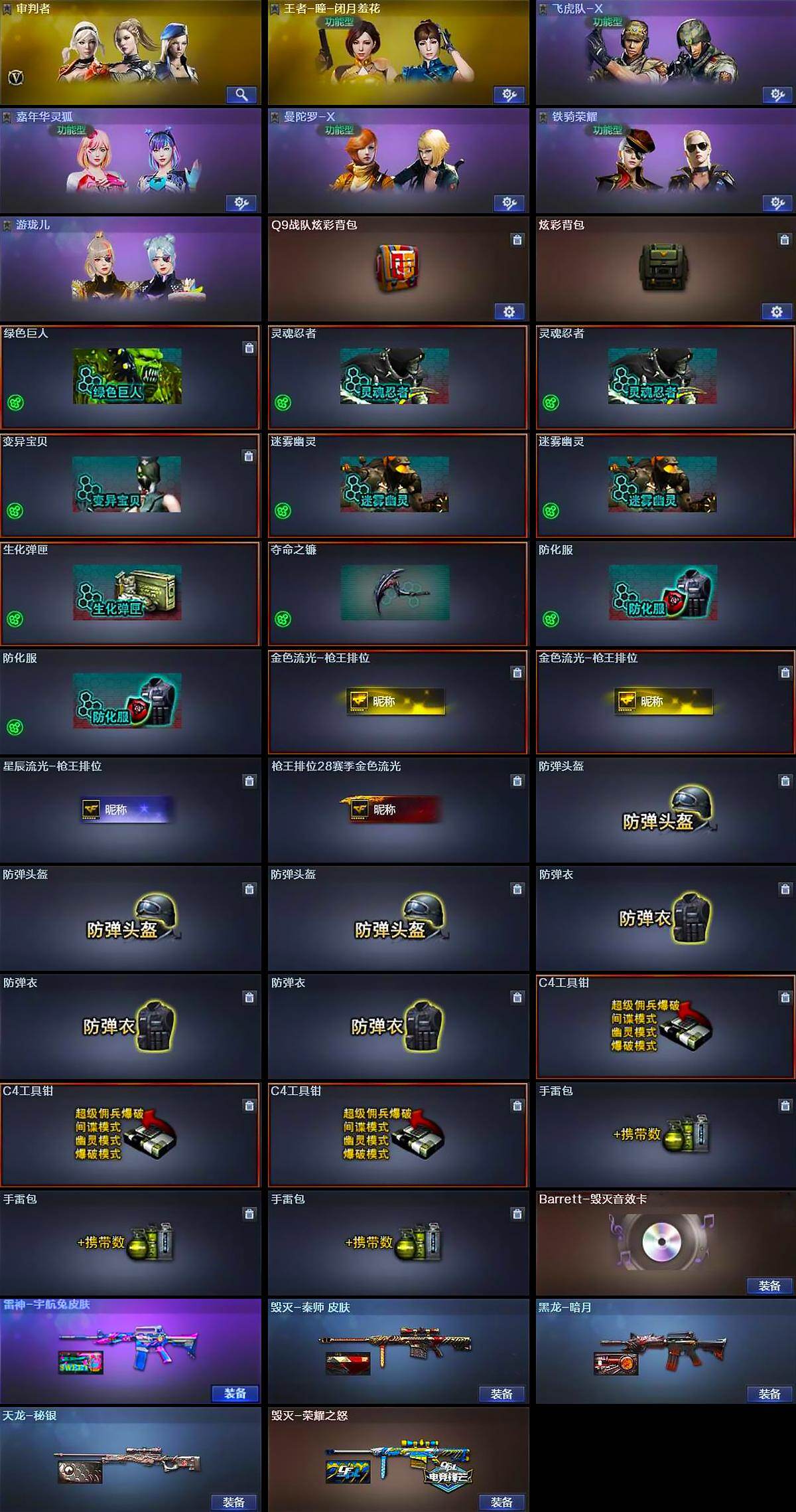【道具】:Q9战队炫彩背包,炫彩背包,绿色巨人,灵魂忍者*2,变异宝贝,迷雾幽灵*2,生化弹匣,夺命之镰,防化服*2,金色流光-枪王排位*2,星辰流光-枪王排位,枪王排位28赛季金色流光,防弹头盔*3,防弹衣*3,C4工具钳*3,手雷包*3