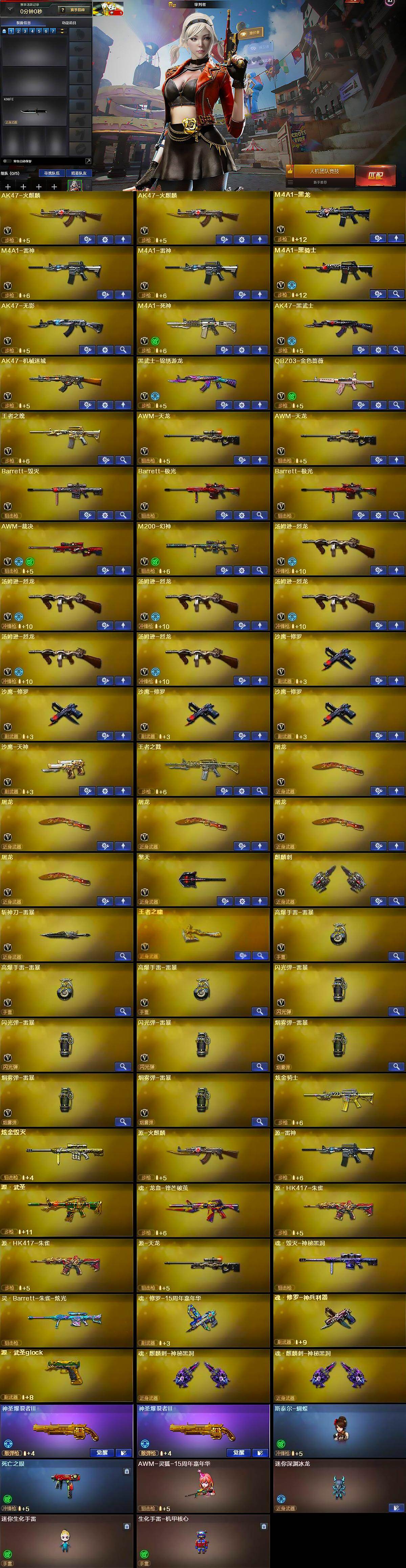 【英雄级武器】:AK47-火麒麟*2,M4A1-黑龙,M4A1-雷神*2,M4A1-黑骑士,AK47-无影,M4A1-死神,AK47-黑武士,AK47-机械迷城,黑武士-锦绣游龙,QBZ03-金色蔷薇,王者之魄-觉醒版,AWM-天龙*2,Barrett-毁灭,Barrett-极光*2,AWM-裁决,M200-幻神,汤姆逊-烈龙*6,沙鹰-修罗*4,沙鹰-天神,屠龙*5,擎天,麒麟刺,斩神刀-雷暴,王者之啸-觉醒版,高爆手雷-雷暴*3,闪光弹-雷暴*3,烟雾弹-雷暴*3