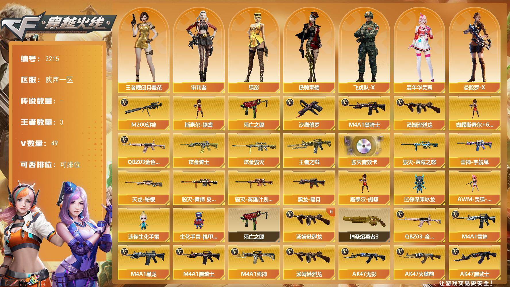 [16998626]陕西一区-52V-3王者武器数-2炫金武器数 【热门武器】:QBZ03-金色蔷薇,M200-幻神,死亡之眼,M4A1-黑骑士,汤姆逊-烈龙*6,斯泰尔-蝴蝶,沙鹰-修罗*4 【王者炫金武器】:王者之戮,炫金骑士,炫金毁灭 【音效卡】:Barrett-毁灭音效卡 【皮肤】:雷神-宇航兔皮肤,毁灭-荣耀之怒,毁灭-秦师 皮肤,毁灭-英雄计划 皮肤,黑龙-暗月,天龙-秘银 【角色】:审判者,王者-瞳-闭月羞花,狐影,飞虎队-X,嘉年华灵狐,曼陀罗-X,铁骑荣耀,游珑儿 【人偶武器】:斯泰尔-蝴蝶,AWM-灵狐-15周年嘉年华,迷你深渊冰龙,迷你生化手雷,生化手雷-机甲核心 【暴走生化】:死亡之眼 【挑战大师】:神圣爆裂者III*2 【英雄级武器】:AK47-火麒麟*2,M4A1-黑龙,M4A1-雷神*2,M4A1-黑骑士,AK47-无影,M4A1-死神,AK47-黑武士,AK47-机械迷城,黑武士-锦绣游龙,QBZ03-金色蔷薇,王者之魄-觉醒版,AWM-天龙*2,Barrett-毁灭,Barrett-极光*2,AWM-裁决,M200-幻神,汤姆逊-烈龙*6,沙鹰-修罗*4,沙鹰-天神,屠龙*5,擎天,麒麟刺,斩神刀-雷暴,王者之啸-觉醒版,高爆手雷-雷暴*3,闪光弹-雷暴*3,烟雾弹-雷暴*3 【道具】:Q9战队炫彩背包,炫彩背包,绿色巨人,灵魂忍者*2,变异宝贝,迷雾幽灵*2,生化弹匣,夺命之镰,防化服*2,金色流光-枪王排位*2,星辰流光-枪王排位,枪王排位28赛季金色流光,防弹头盔*3,防弹衣*3,C4工具钳*3,手雷包*3 【特殊枪械】:蝴蝶斯泰尔+6烈龙,1黑骑士,6烈龙,1蝴蝶斯泰尔