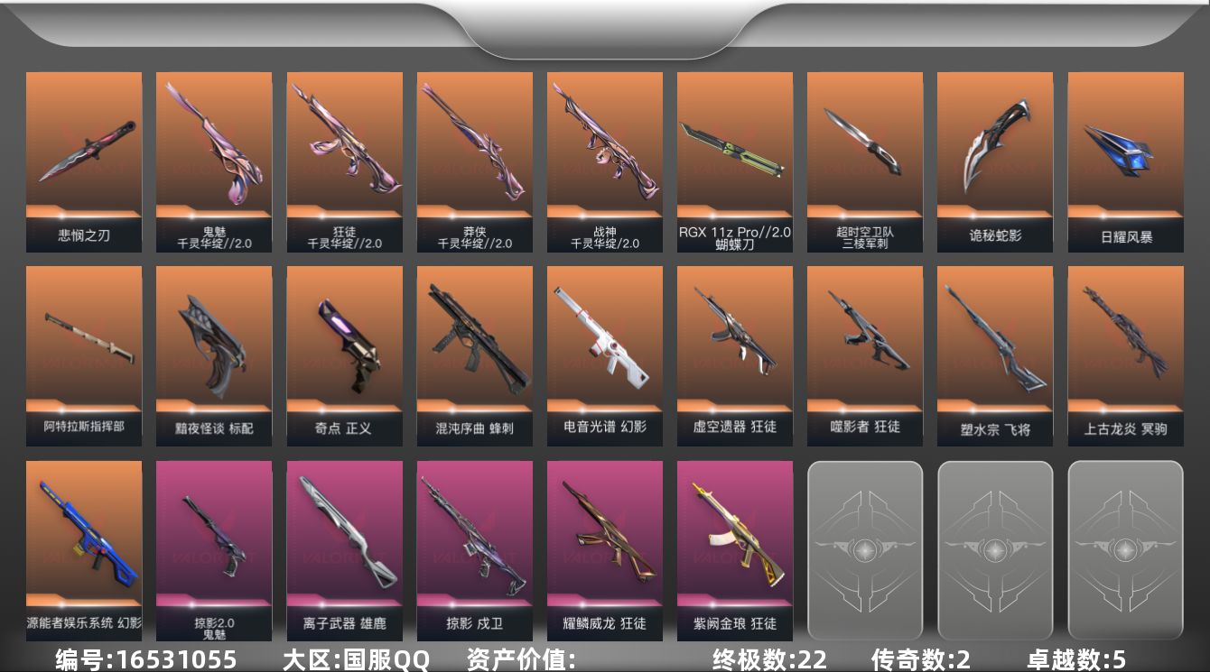 [16531055]【套装】:无畏契约季前邀请赛套装,千灵华绽//2.0套装 【英雄】:幻棱,炼狱,维斯,暮蝶,钛狐,壹决,铁臂,捷风,雷兹,幽影,不死鸟,贤者,猎枭,蝰蛇,零,芮娜,奇乐,尚勃勒,霓虹,斯凯,夜露,K/O,海神,盖可,黑梦,钢锁 【近战武器】:近战武器-无畏契约季前邀请赛 悲悯之刃,近战武器-流风回雪,近战武器-超时空卫队 三棱军刺,近战武器-RGX 11z Pro//2.0 蝴蝶刀,近战武器-紫金爪刀,近战武器-威龙之刃,近战武器-未来开拓者,近战武器-诡秘蛇影 军刀,近战武器-日耀风暴 遗器,近战武器-阿特拉斯指挥部 甩棍 【狂徒】:狂徒-虚空遗器,狂徒-噬影者,狂徒-千灵华绽//2.0,狂徒-耀鳞威龙,狂徒-紫阙金琅,狂徒-诡秘蛇影 【幻影】:幻影-源能者娱乐系统,幻影-电音光谱,幻影-末日之翼,幻影-电音光谱 【戍卫】:戍卫-掠影,戍卫-折光棱晶 【冥驹】:冥驹-上古龙炎 【飞将】:飞将-塑水宗,飞将-末日之翼 【莽侠】:莽侠-千灵华绽//2.0,莽侠-诡秘蛇影 【战神】:战神-千灵华绽//2.0 【奥丁】:奥丁-末日之翼 【判官】:判官-诡秘蛇影 【雄鹿】:雄鹿-离子武器 【蜂刺】:蜂刺-混沌序曲,蜂刺-折光棱晶 【标配】:标配-黯夜怪谈,标配-折光棱晶 【正义】:正义-奇点 【鬼魅】:鬼魅-千灵华绽//2.0,鬼魅-掠影//2.0,鬼魅-诡秘蛇影 【短炮】:短炮-末日之翼 【卡面】:梦幻奶茶 卡面,无畏契约GO!第一卷:芮娜 卡面,无畏契约GO!第一卷:零 卡面,比比看谁快? 卡面,势不可挡//盖可 卡面,别冒尖 卡面,代号红色 卡面,新兵报到 卡面,V契约 卡面,无畏契约 卡面 【喷漆】:超级粉丝 喷漆,捷风差距 喷漆,我的刀呢? 喷漆,不予置评 喷漆,买装还是存钱 喷漆,关门放狗 喷漆,红鳞 喷漆,胜利属于无畏契约 喷漆,GLHF 喷漆,无畏契约 喷漆 【挂饰】:V25第六幕:超凡 挂饰,袖珍捷风 挂饰,第九季//第一幕 纪念币 挂饰,天外飞客 挂饰,《双城之战》魄罗 挂饰,无畏契约 纪念币 挂饰