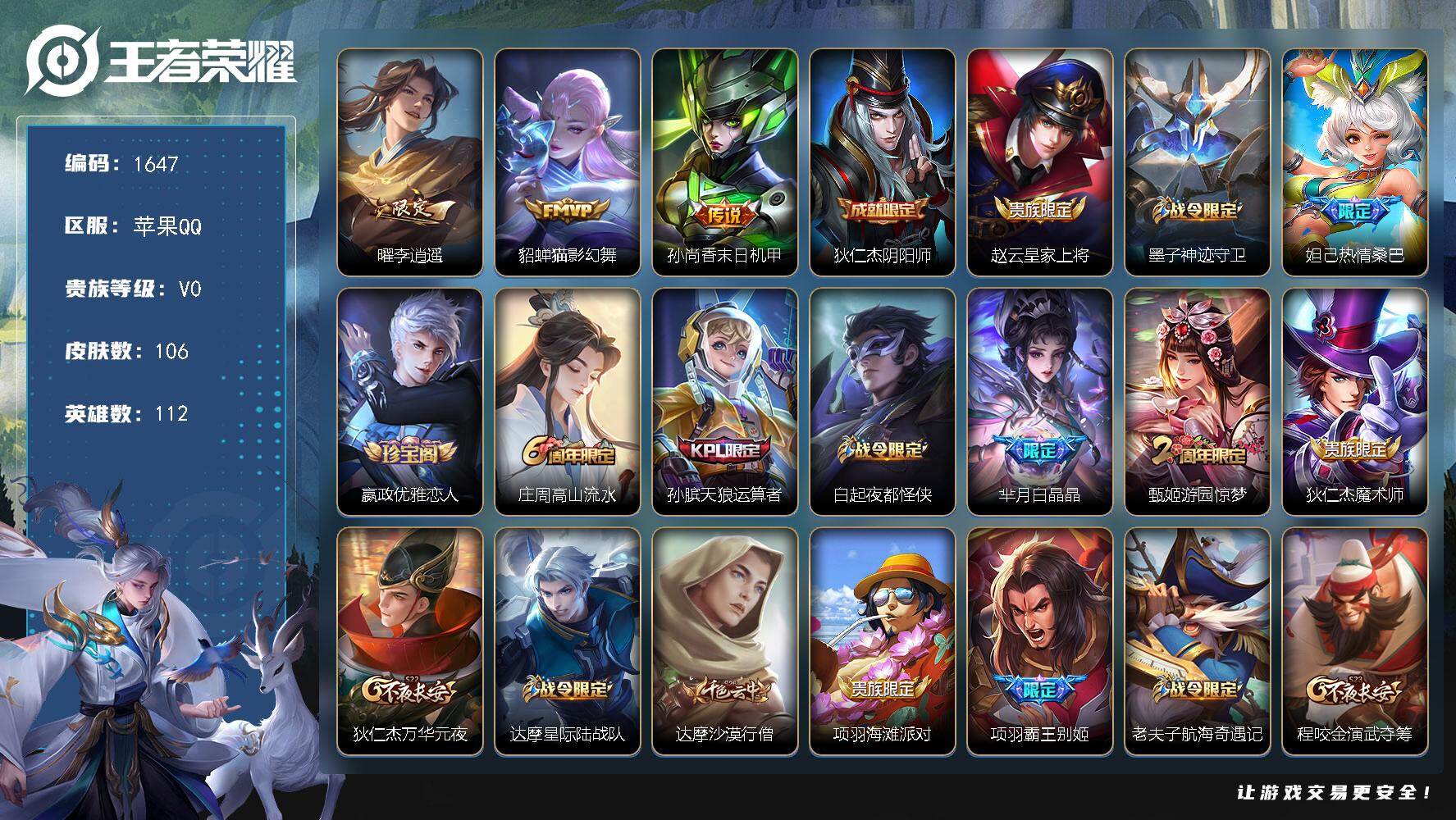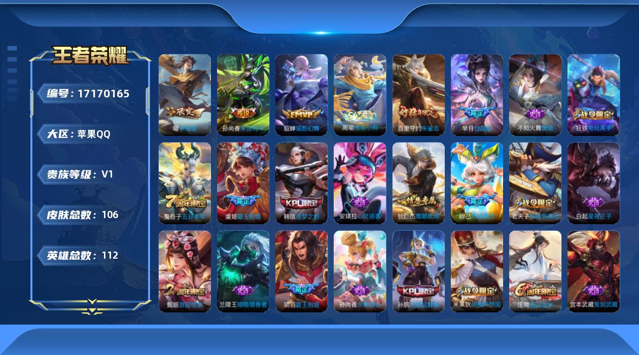 [17170165]【1647】苹果Q-V0-尊贵铂金III段位-112英雄-106皮肤-3传说-33史诗 【传说皮肤】:曜李逍遥 ,貂蝉猫影幻舞,孙尚香末日机甲 【限定皮肤】:狄仁杰阴阳师,赵云皇家上将,墨子神迹守卫,妲己热情桑巴,嬴政优雅恋人,庄周高山流水,孙膑天狼运算者,白起夜都怪侠,芈月白晶晶,甄姬游园惊梦,狄仁杰魔术师,狄仁杰万华元夜,达摩星际陆战队,达摩沙漠行僧,项羽海滩派对,项羽霸王别姬,老夫子航海奇遇记,程咬金演武夺筹,韩信逐梦之影,王昭君午后时光,兰陵王金庭之子,亚瑟潮玩骑士王,后羿圣弓游侠,李元芳云中旅人,虞姬霸王别姬,钟馗驱傩正仪,鬼谷子原初探秘者,鬼谷子五谷丰年,苏烈千军破阵,百里守约朱雀志,沈梦溪大漠名商,明世隐吟游魔法,狂铁电玩高手,米莱狄胡桃异想国,伽罗天狼溯光者,曜李逍遥 ,鲁班大师探海日志,桑启海盐诗旅,周瑜熔金海岸 【年限皮肤】:百里守约朱雀志 【赛季限定】:鬼谷子原初探秘者,狄仁杰万华元夜,程咬金演武夺筹,钟馗驱傩正仪,苏烈千军破阵,达摩沙漠行僧,兰陵王金庭之子,沈梦溪大漠名商,李元芳云中旅人,桑启海盐诗旅,鲁班大师探海日志 【战令限定】:亚瑟潮玩骑士王,米莱狄胡桃异想国,达摩星际陆战队,老夫子航海奇遇记,墨子神迹守卫,后羿圣弓游侠,明世隐吟游魔法,白起夜都怪侠,狂铁电玩高手,王昭君午后时光,周瑜线条小狗 【史诗皮肤】:周瑜线条小狗,鬼谷子五谷丰年,狂铁电玩高手,明世隐吟游魔法,庄周高山流水,伽罗天狼溯光者,老夫子航海奇遇记,米莱狄胡桃异想国,芈月白晶晶,孙膑天狼运算者,不知火舞魅语,狄仁杰鹰眼统帅,百里守约朱雀志,白起星夜王子,蔡文姬舞动绿茵,安琪拉心灵骇客,甄姬游园惊梦,兰陵王暗隐猎兽者,小乔缤纷独角兽,韩信逐梦之影,刘邦德古拉伯爵,虞姬霸王别姬,项羽霸王别姬,妲己热情桑巴,吕布圣诞狂欢,墨子金属风暴,妲己魅力维加斯,嬴政摇滚巨星,嬴政优雅恋人,孙尚香水果甜心,宫本武藏鬼剑武藏,狄仁杰魔术师,王昭君偶像歌手,赵云皇家上将 【其他皮肤】:周瑜熔金海岸,李元芳妄想特派,鲁班大师探海日志,猪八戒潮玩探月行,桑启海盐诗旅,李元芳云中旅人,蒙恬蔚蓝守将,蒙犽胡桃狂想曲,沈梦溪大漠名商,王昭君午后时光,米莱狄契约魔法,刘禅唤灵魔甲,兰陵王金庭之子,白起夜都怪侠,达摩沙漠行僧,典韦铁甲之心,后羿圣弓游侠,苏烈千军破阵,鲁班大师乓乓大师,墨子神迹守卫,钟馗驱