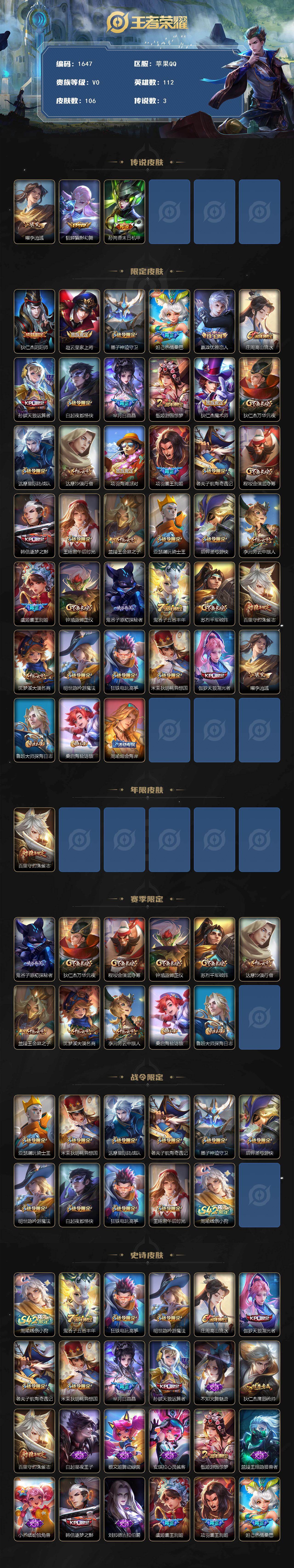 [17170165]【1647】苹果Q-V0-尊贵铂金III段位-112英雄-106皮肤-3传说-33史诗