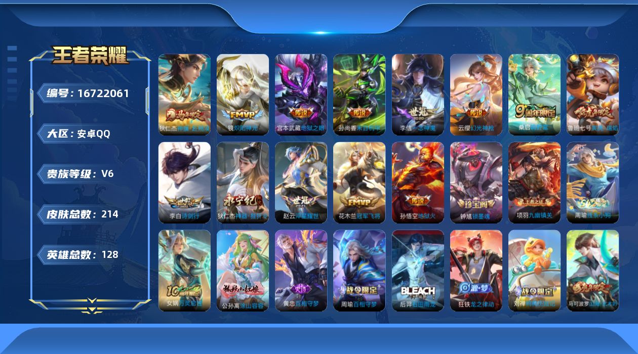- [11629614]V8 1典藏 1珍品传说 12传说 124英雄 268皮肤 可修改实名 优质装备:全息碎影(猴子典藏),黑崎一护,黄金狮子座,黄金射手座,冠军飞将,炽阳神光,末日机甲-孙尚香(绿蚂蚱),地狱火,仲夏夜之梦(大飞蛾),地狱之眼 珍宝阁皮:胡桃夹子,玩趣恶龙 限定皮:至尊宝,白虎志(电光耗子),飞衡(韩信年限),高山流水,诗剑行,齐天大圣,五谷丰年,冰锋战神,梁祝,天狼绘梦者,李小龙,孙行者,猪悟能,大圣娶亲,神奇女侠,时之奇旅-妲己 史诗皮:龙之律动,百相守梦-周瑜,炽弈燎原,百相守梦-黄忠,紫霞仙子,电玩小子(小书包),白龙吟,黄金分割率,特工魅影,千年之狐,江河有灵,蒙恬荣光圣徽,冰冠公主,电玩·爆裂旋风,末日机甲-吕布,猫狗日记-孙策,乱世虎臣,节奏热浪,修罗,水果甜心,星夜王子,心灵骇客,功夫厨神,暗隐猎兽者,幽灵船长,鬼剑武藏,心灵战警,纤云弄巧,乘风破浪,水晶猎龙者,曙光守护者,箭羽风息,金属风暴,原初追逐者,鹰眼统帅,黎明之约,无心