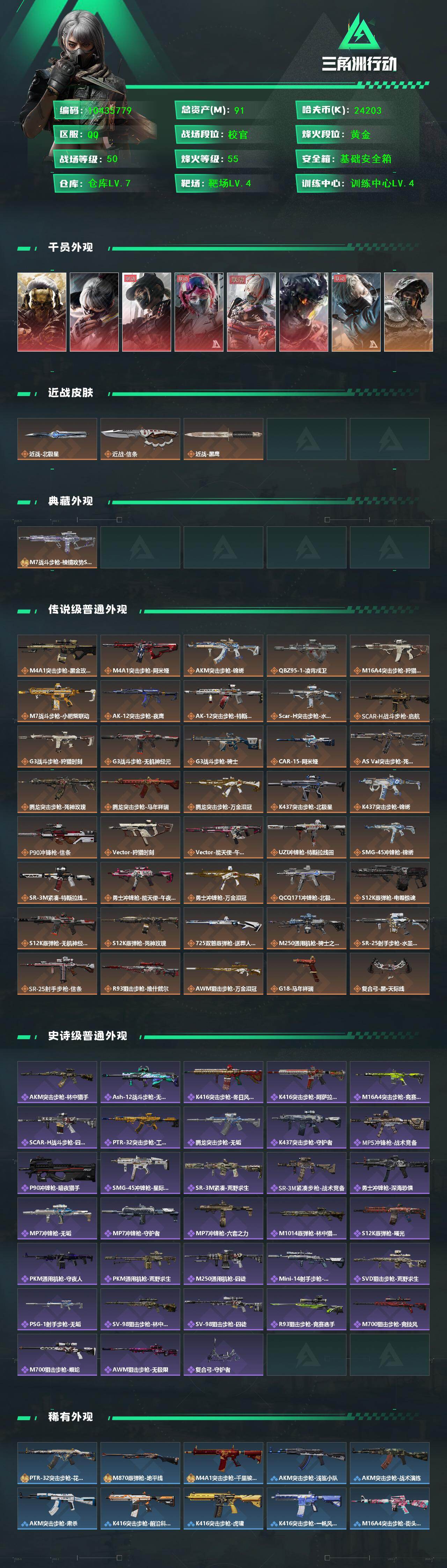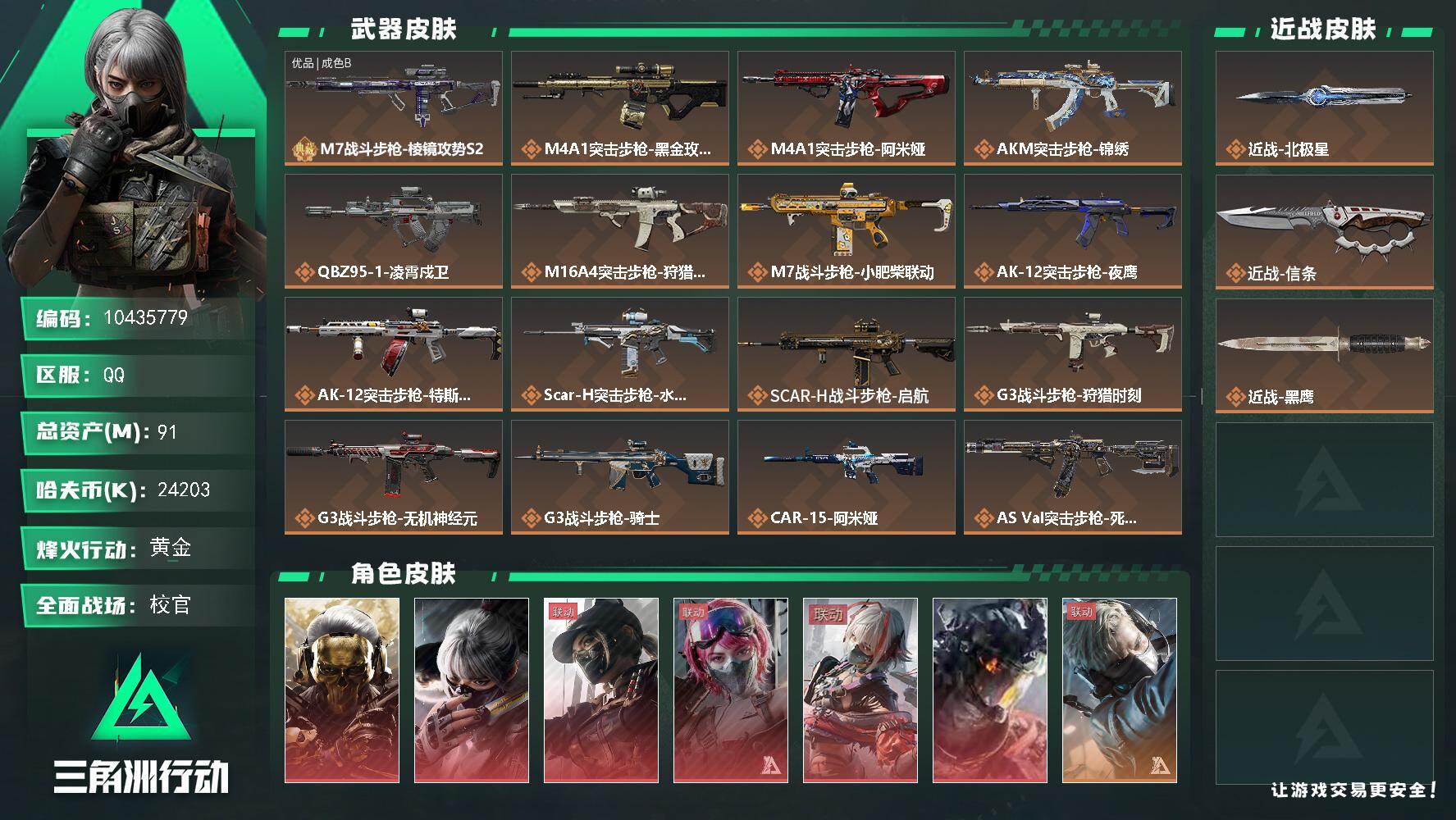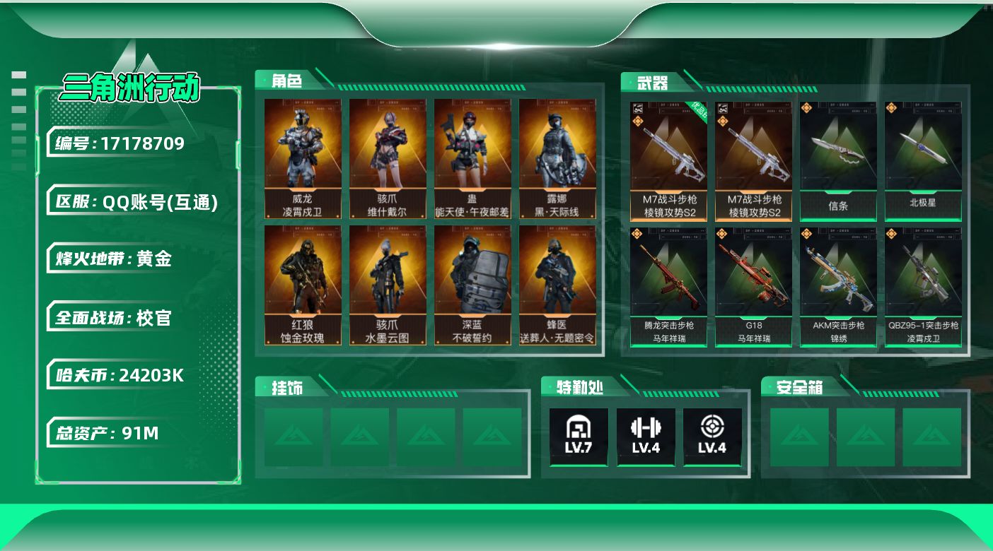 [17178709]【10435779】91m总资产-24203k哈伏币-55烽火等级-黄金-50战场等级-校官 【干员外观】:红狼-蚀金玫瑰,骇爪-水墨云图,露娜-黑·天际线,蛊-能天使午夜邮差,骇爪-维什戴尔,威龙-凌霄戍卫,蜂医-送葬人·无题密令,深蓝-不破誓约 【近战皮肤】:近战-北极星,近战-信条,近战-黑鹰 【典藏外观】:M7战斗步枪-棱镜攻势S2*2 【典藏外观成色】:M7战斗步枪-棱镜攻势S2(优品B)*2 【传说外观】:M4A1突击步枪-蚀金玫瑰,M4A1突击步枪-阿米娅,AKM突击步枪-锦绣,QBZ95-1突击步枪-凌霄戍卫,M16A4突击步枪-狩猎时刻,M7战斗步枪-小肥柴,AK-12突击步枪-夜鹰,AK-12突击步枪-特斯拉线圈,SCAR-H战斗步枪-水墨云图,SCAR-H战斗步枪-启航,G3战斗步枪-狩猎时刻,G3战斗步枪-无机神经元,G3战斗步枪-骑士,CAR-15突击步枪-阿米娅,AS Val突击步枪-死神玫瑰,腾龙突击步枪-死神玫瑰,腾龙突击步枪-马年祥瑞,腾龙突击步枪-万金泪冠,K437突击步枪-北极星,K437突击步枪-锦绣,P90冲锋枪-信条,Vector冲锋枪-狩猎时刻,Vector冲锋枪-能天使-午夜邮差,UZI冲锋枪-特斯拉线圈,SMG-45冲锋枪-锦绣,SR-3M紧凑突击步枪-特斯拉线圈,勇士冲锋枪-能天使-午夜邮差,勇士冲锋枪-万金泪冠,QCQ171冲锋枪-北极星,S12K霰弹枪-电锯惊魂,S12K霰弹枪-无机神经元,S12K霰弹枪-死神玫瑰,725双管霰弹枪-送葬人-无题密令,M250通用机枪-骑士之心,SR-25射手步枪-水墨云图,SR-25射手步枪-信条,R93狙击步枪-维什戴尔,AWM狙击步枪-万金泪冠,G18-马年祥瑞,复合弓-黑·天际线 【史诗外观】:AKM突击步枪-林中猎手,ASh-12战斗步枪-无极限,K416突击步枪-冬日风情,K416突击步枪-阿萨拉特攻,M16A4突击步枪-竞赛选手,SCAR-H战斗步枪-囚徒,PTR-32突击步枪-工业狂潮,腾龙突击步枪-无垢,K437突击步枪-守护者,MP5冲锋枪-战术竞备,P90冲锋枪-暗影猎手,SMG-45冲锋枪-星际探索,SR-3M紧凑突击步枪-荒野求生,SR-3M紧凑突击步枪-战术竞备,勇士冲锋枪-深海恐惧,MP7冲锋枪-无垢,MP7冲锋枪-守护者,MP7冲锋枪-六套之力